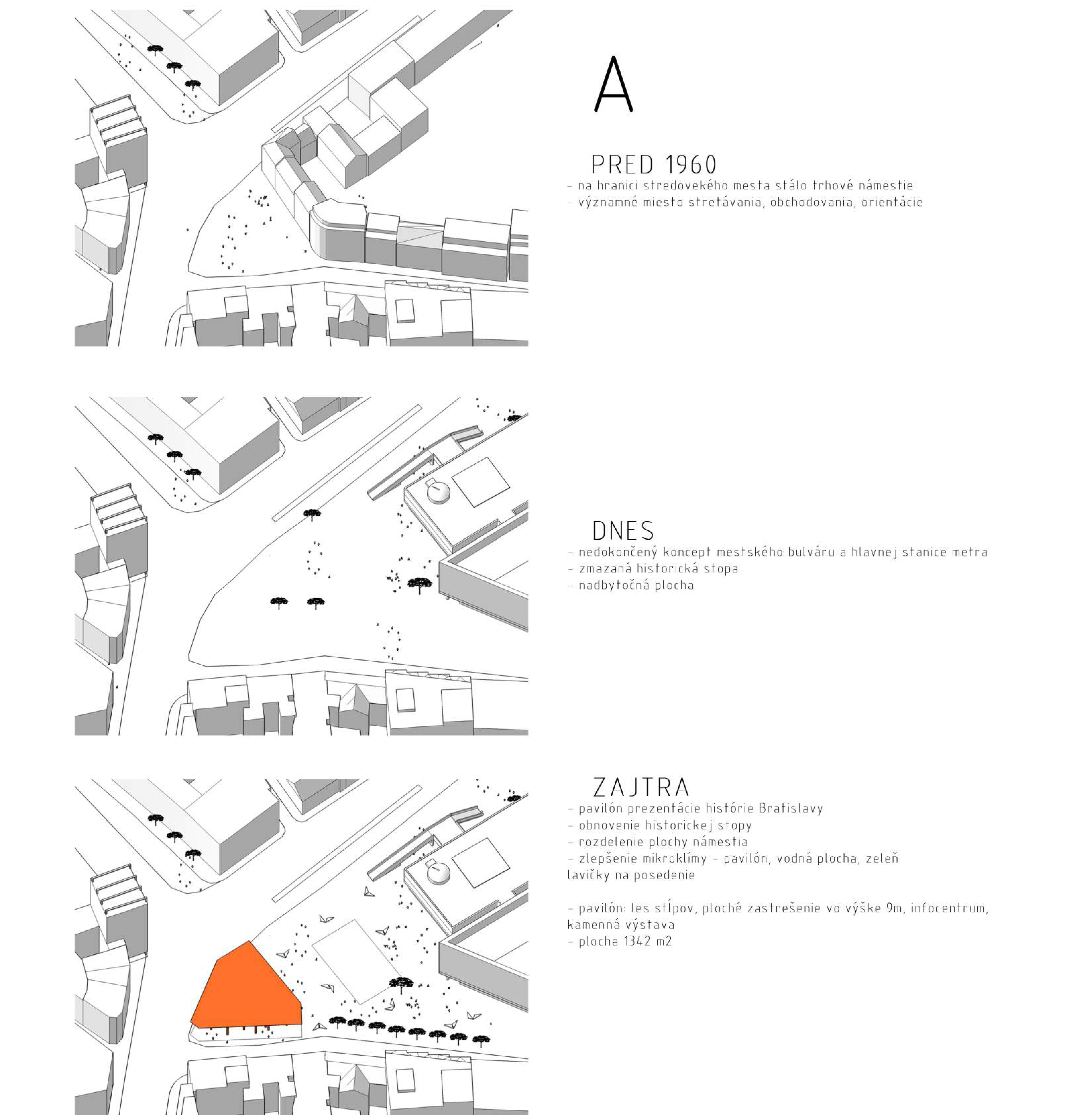 Zo súčasného Kamenného námestia sa takmer úplne vytratila historická stopa trhového námestia. Dnes je priestor veľký a nevyužiteľný. Obnovili sme pôvodné námestie tým, že sme jeho pôdorys vytiahli 10m nad terén. Vzniklo zastrešenie, pavilón, rozčleňujúce územie na dva celky. Zastrešený a otvorený. Veľký pavilón podopiera les stĺpov. Naplnený je funkciami infocentra a kamennej výstavy – prezentácia histórie Bratislavy. Dbali sme na zlepšenie mikroklímy celého námestia. Pavilón vytvára tieň, pochôdzna fontána pred priestorom obchodného domu osvieži v letných dňoch, novovysadená zeleň a lavičky dotvoria to, čo chýba pobytovému verejnému priestoru.
