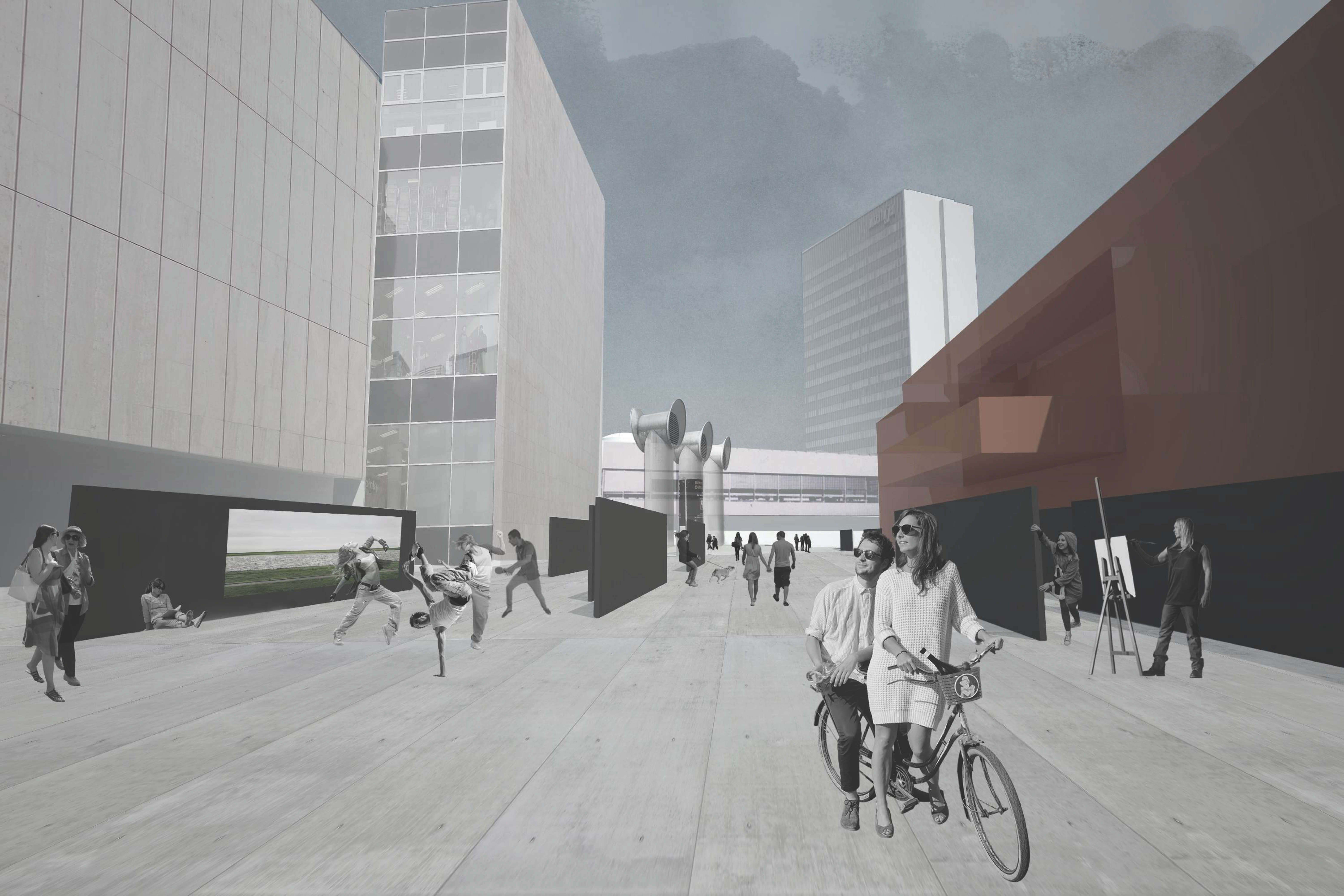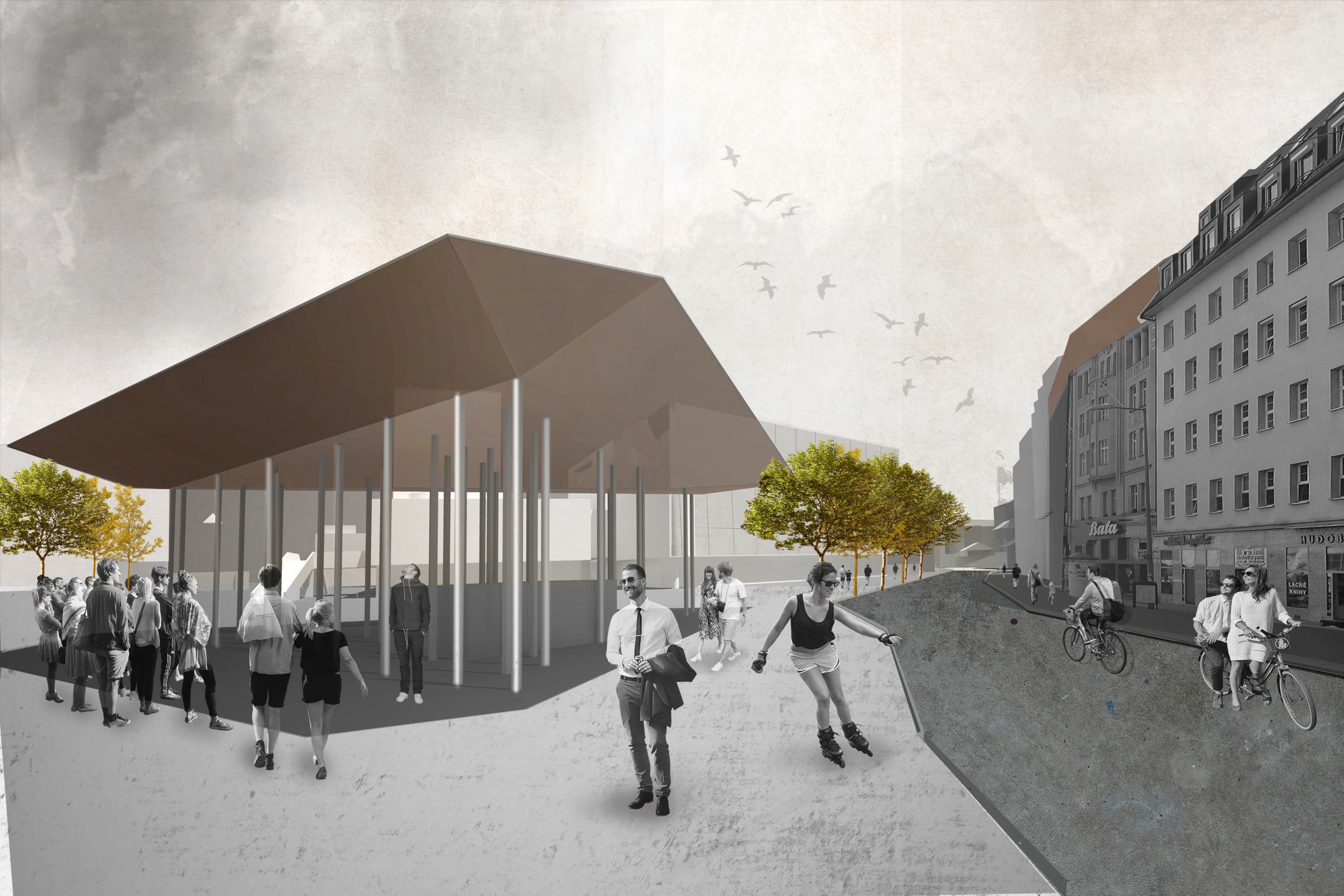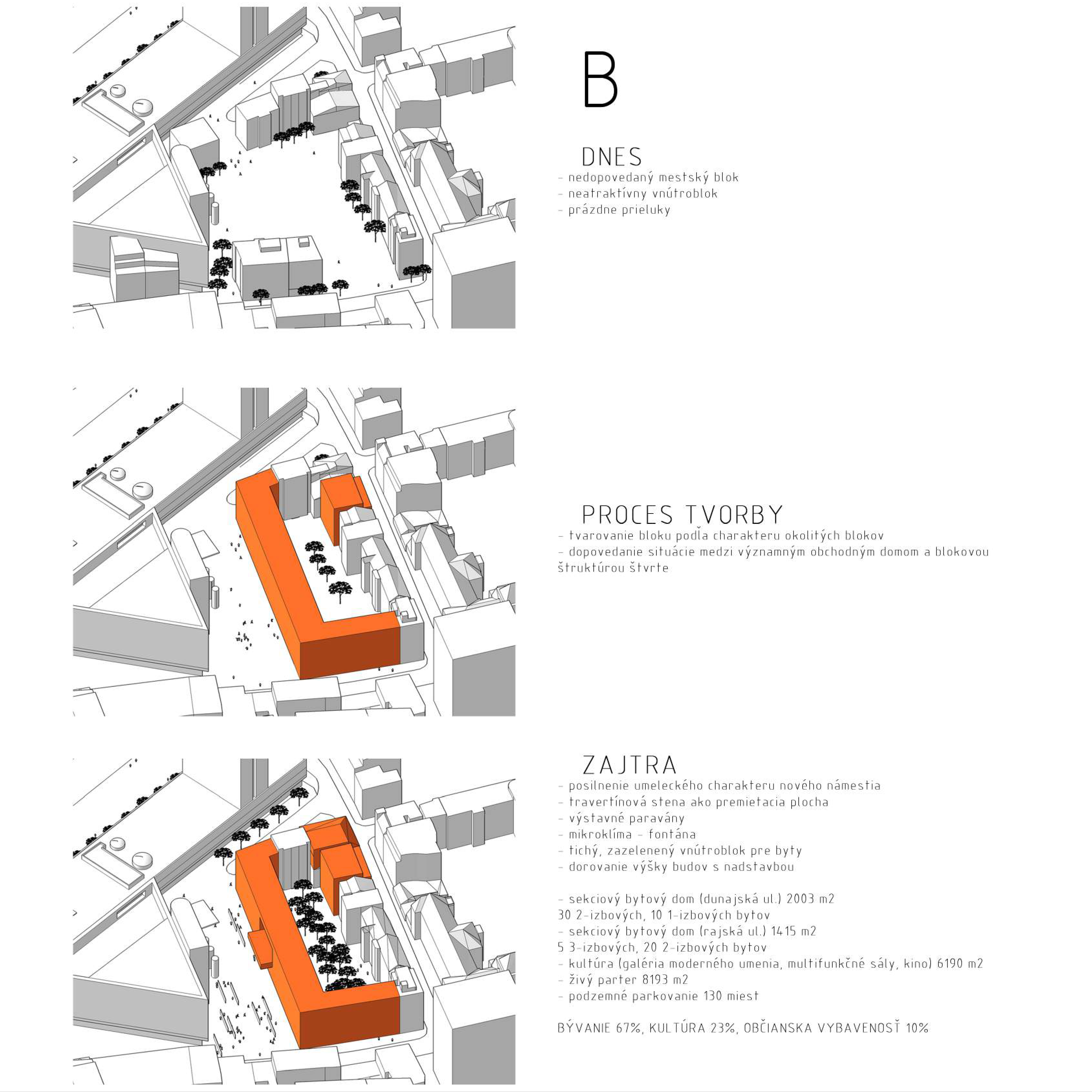 V nedopovedanom mestskom bloku, ktorý pôsobil neatraktívne nie len pre súčasných rezidentov, ale aj pre okoloidúcich, sme posilnili umelecký charakter nového námestia. Monumentálnu travertínovú stenu využijeme ako premietaciu plochu pre nové kultúrne centrum. Námestie dopĺňajú výstavné paravány. Fontána ako osviežujúca vodná plocha zlepšuje mikroklímu umeleckého priestoru. Vnútroblok obytných domov je tichým zalesneným odpočinkovým priestorom.