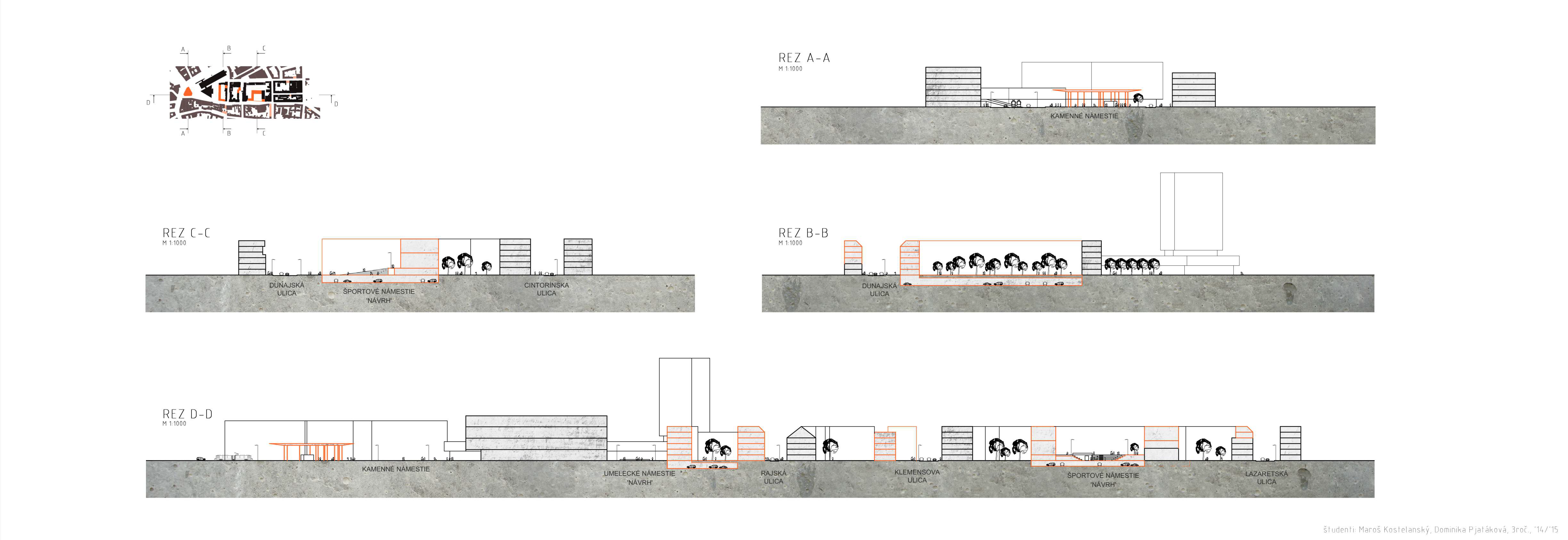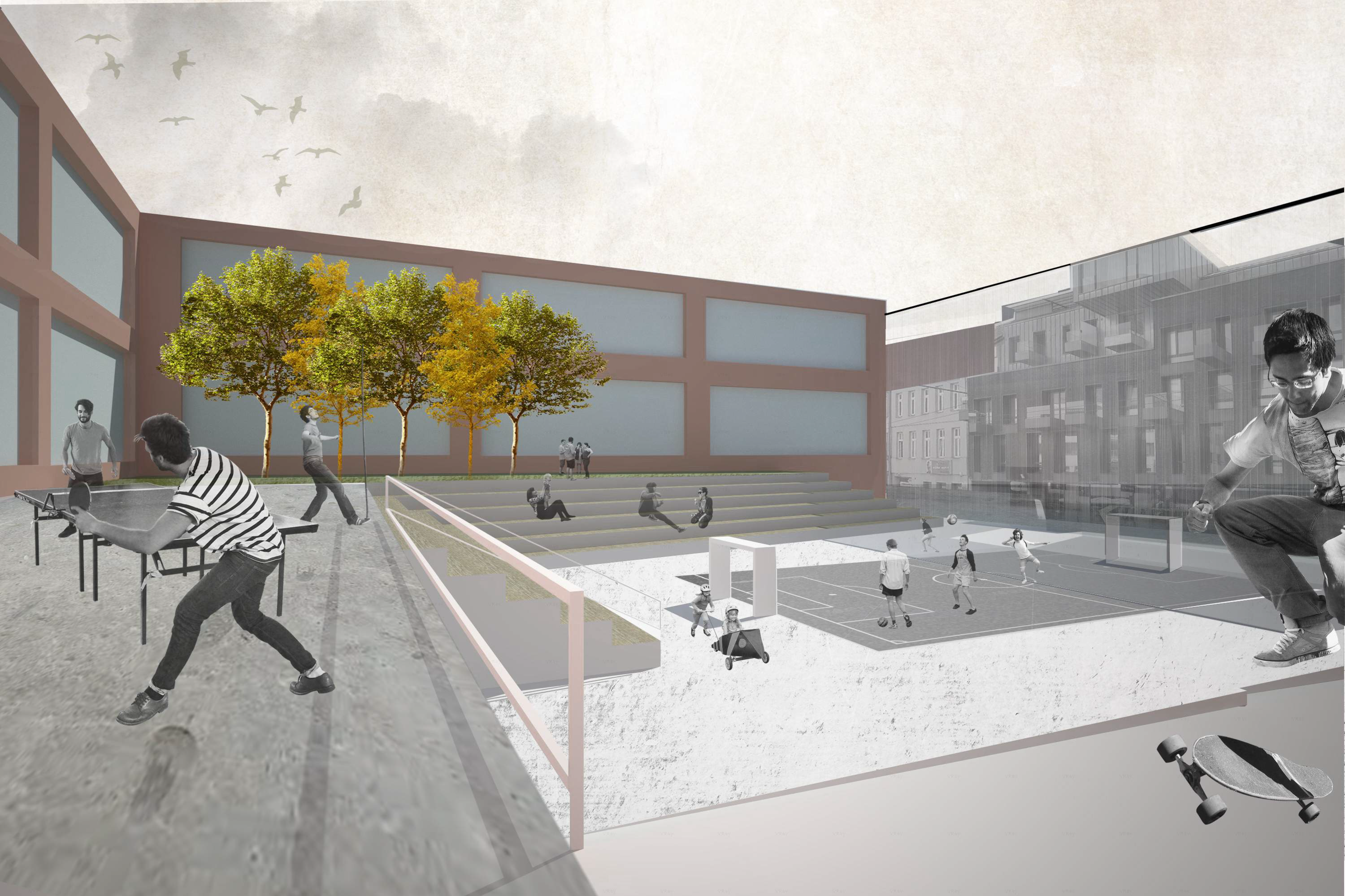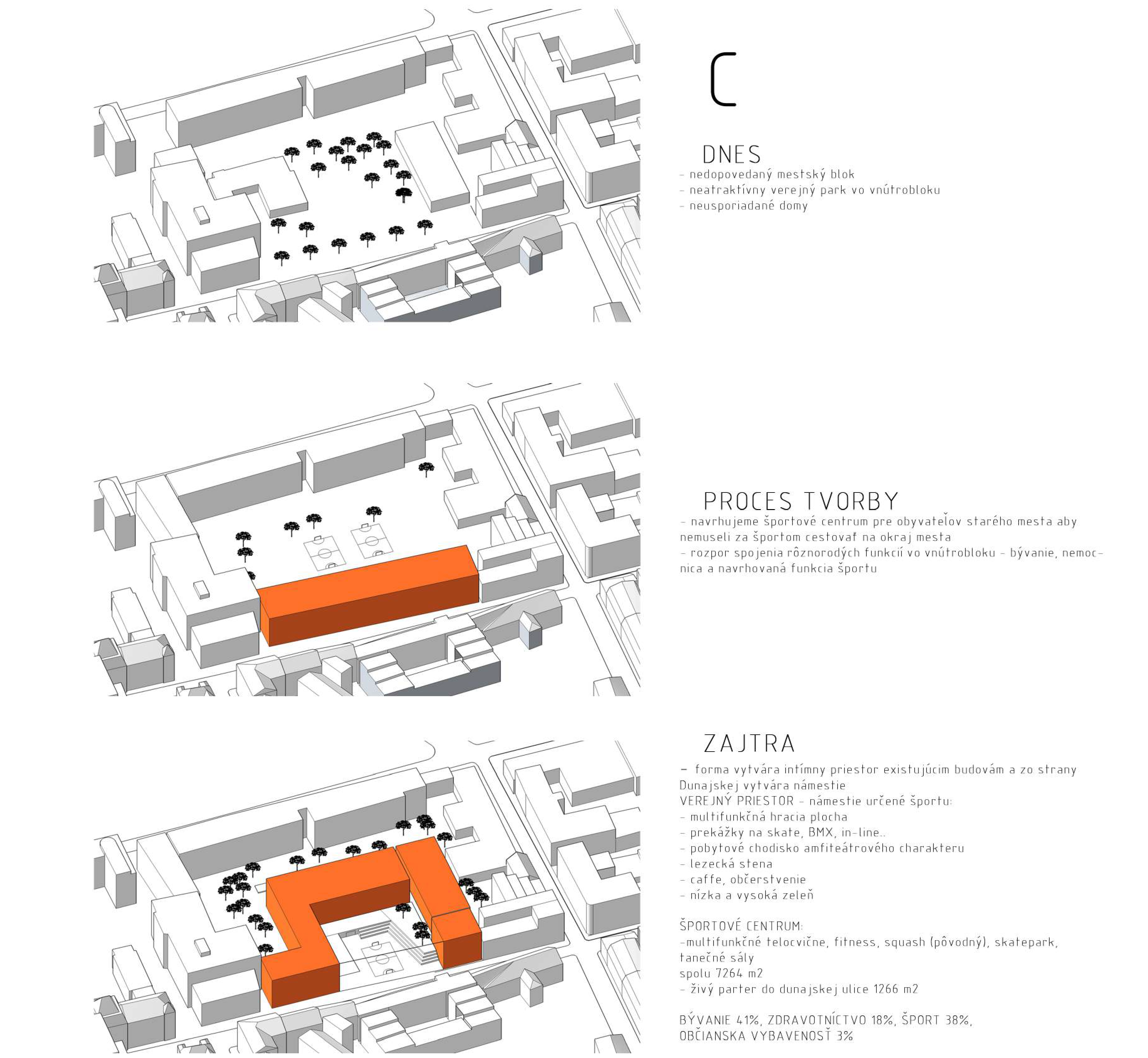 Neatraktívny verejný park vo vnútrobloku s neusporiadaným rozmiestnením domov, sme vyformovali intímny priestor existujúcim budovám. Zo strany Dunajskej ulice vzniklo námestie určené športu, ktoré obsahuje verejný priestor s multifunkčnou hracou plochou, prekážkami na skate, pobytovým schodiskom amfiteátrového charakteru, lezeckú stenu, kaviareň a dotvárajúcu nízku a vysokú zeleň. Vstupom do športového centra sa odkryjú prevádzky určené na fitness, tanečné priestory, športové haly (futbal, volejbal, basketbal, florbal, tenis, bedminton) a skatepark. Existujúce squashové centrum tvorí dôležitú súčasť športového centra. Pred hlukom z námestia bude postavená protihluková stena, architektonicky stvárnená ako „športové pletivo“.