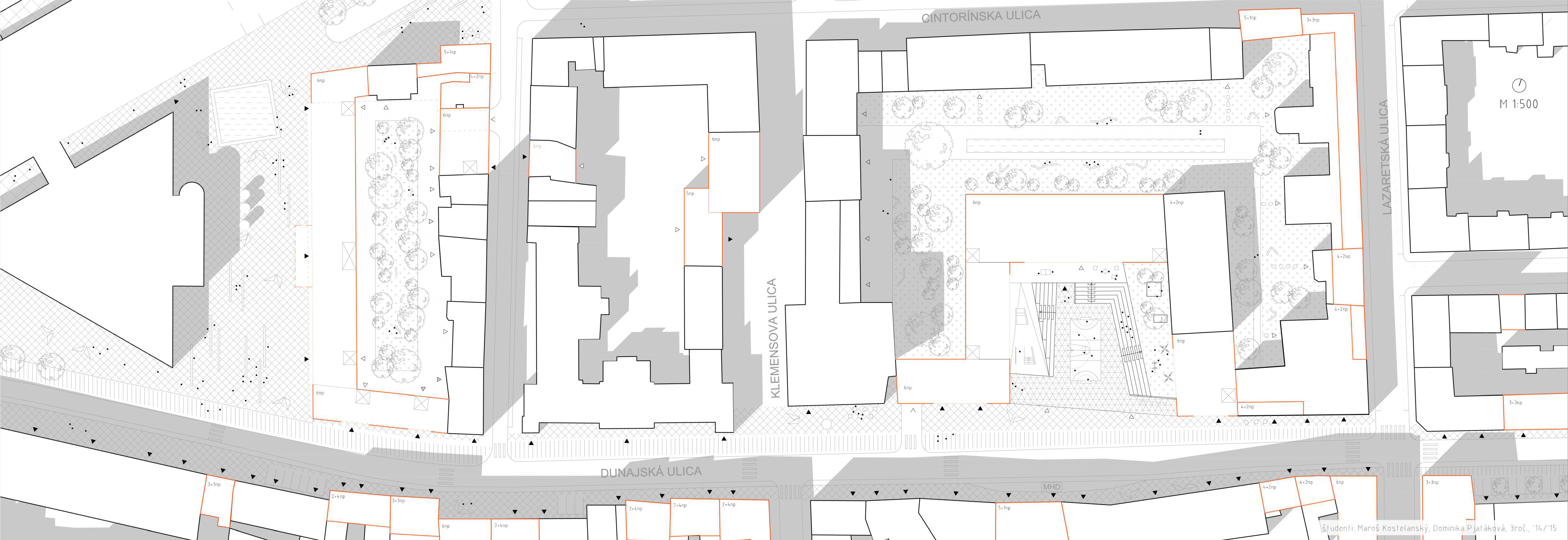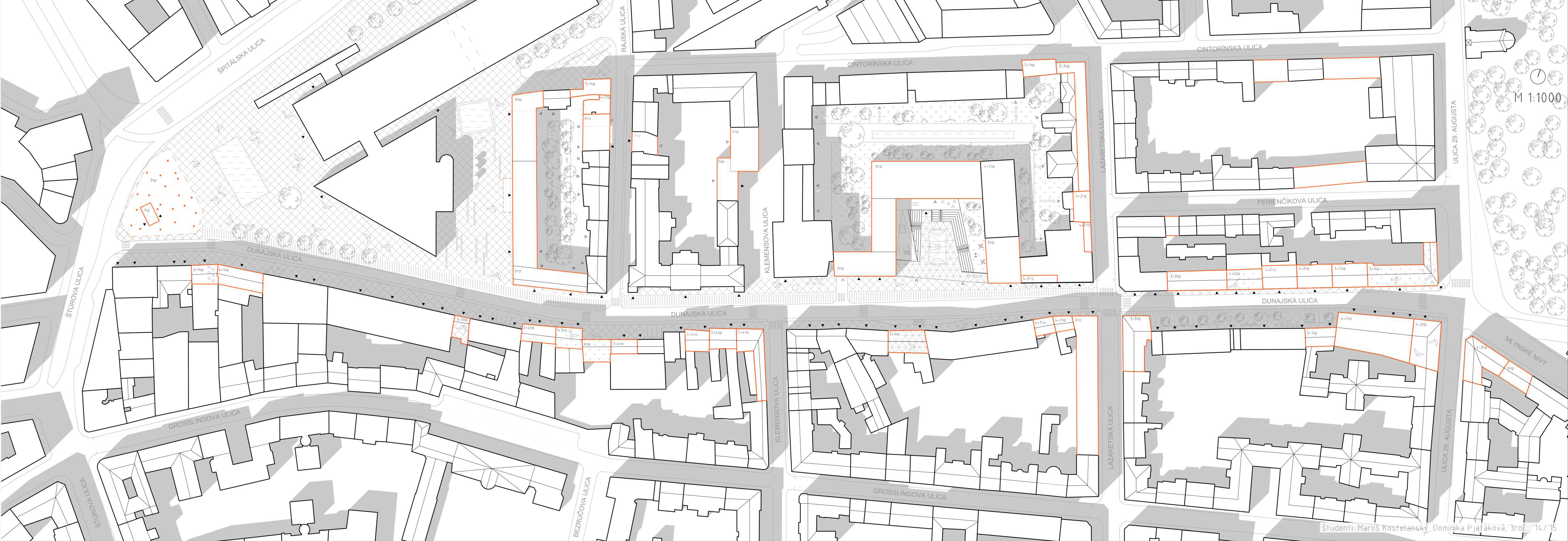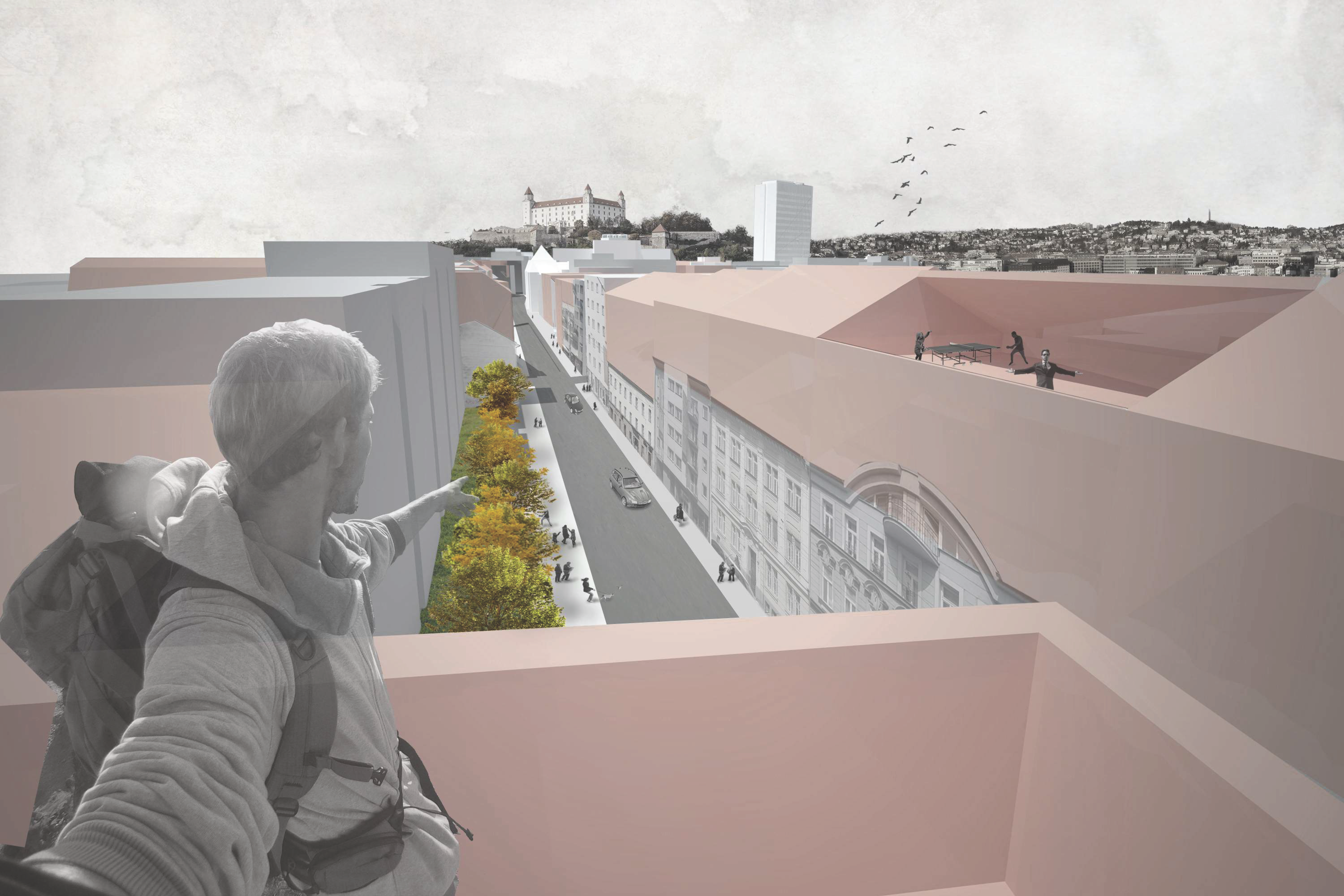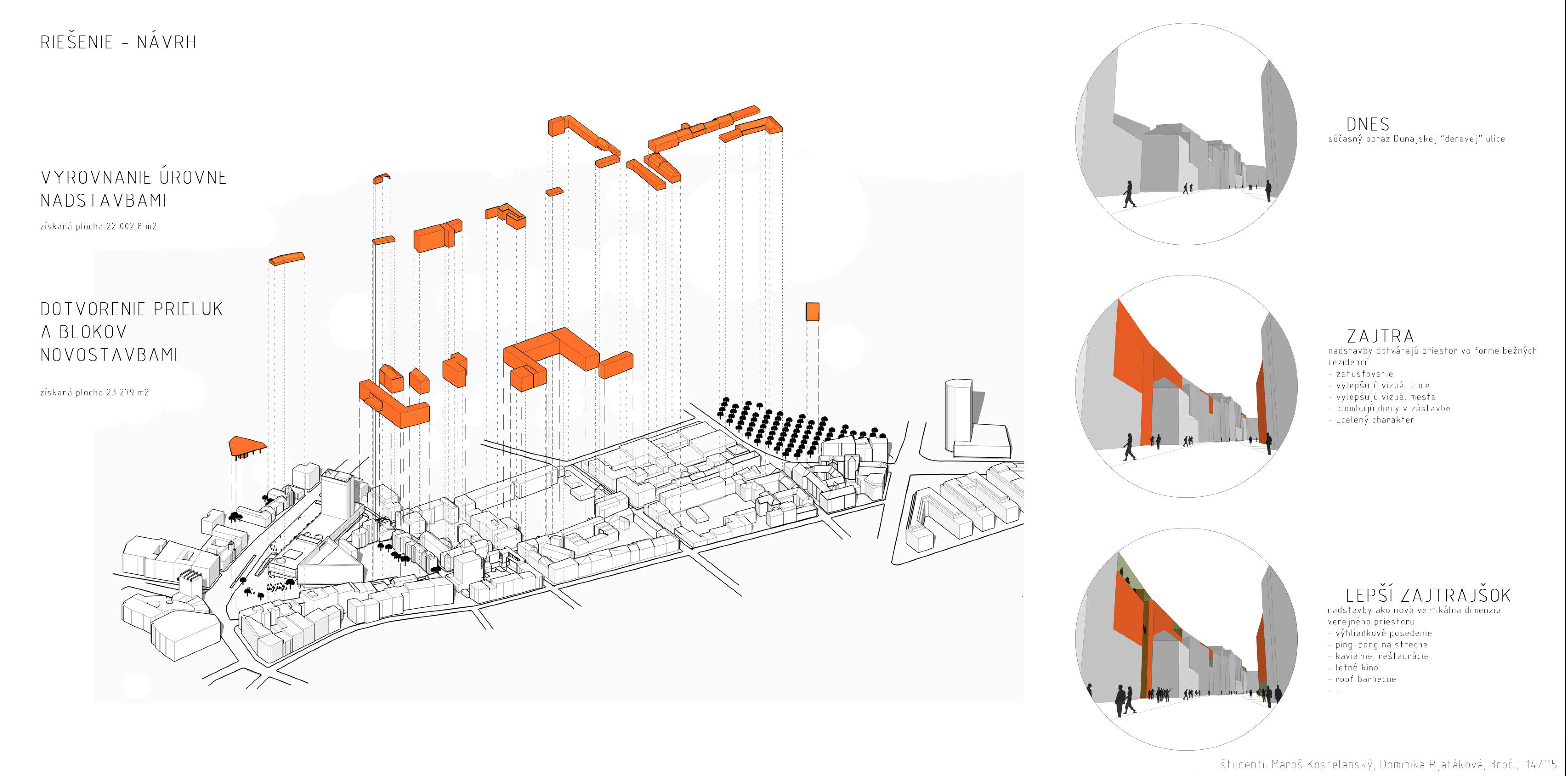 Našim riešením je celkom jednoduchá schéma. Na zvolenú výškovú úroveň vyplniť, zaplombovať, štrbavý raster ulice nadstavbami a dostavbami. Dosiahneme skompaktnenú mestskú štruktúru v pôdoryse aj pohľadoch. Ak docielime, že nadstavby budú harmonicky poprepájané medzi sebou a mestom, výrazne tým vylepšíme celkový obraz Bratislavy!