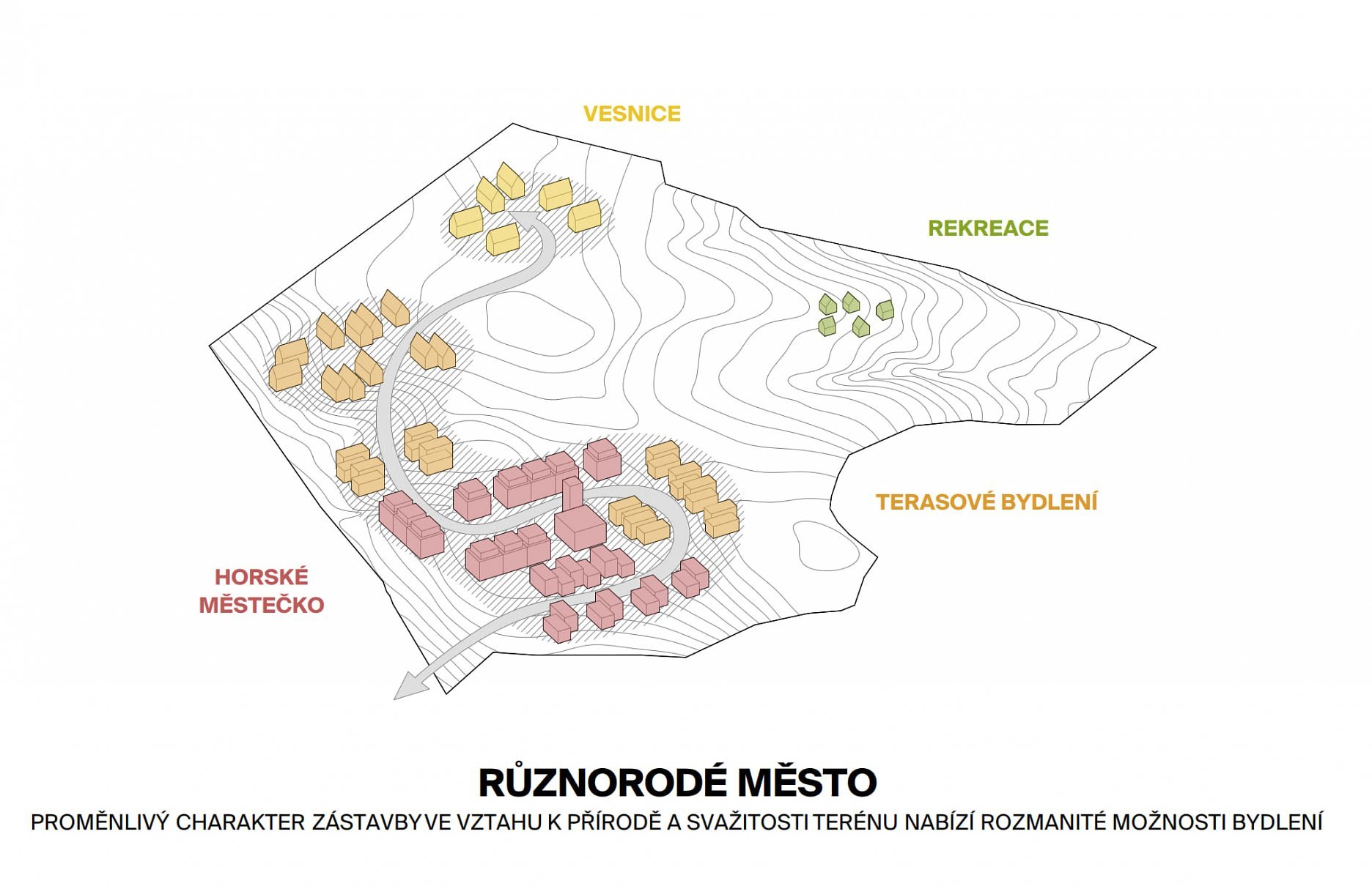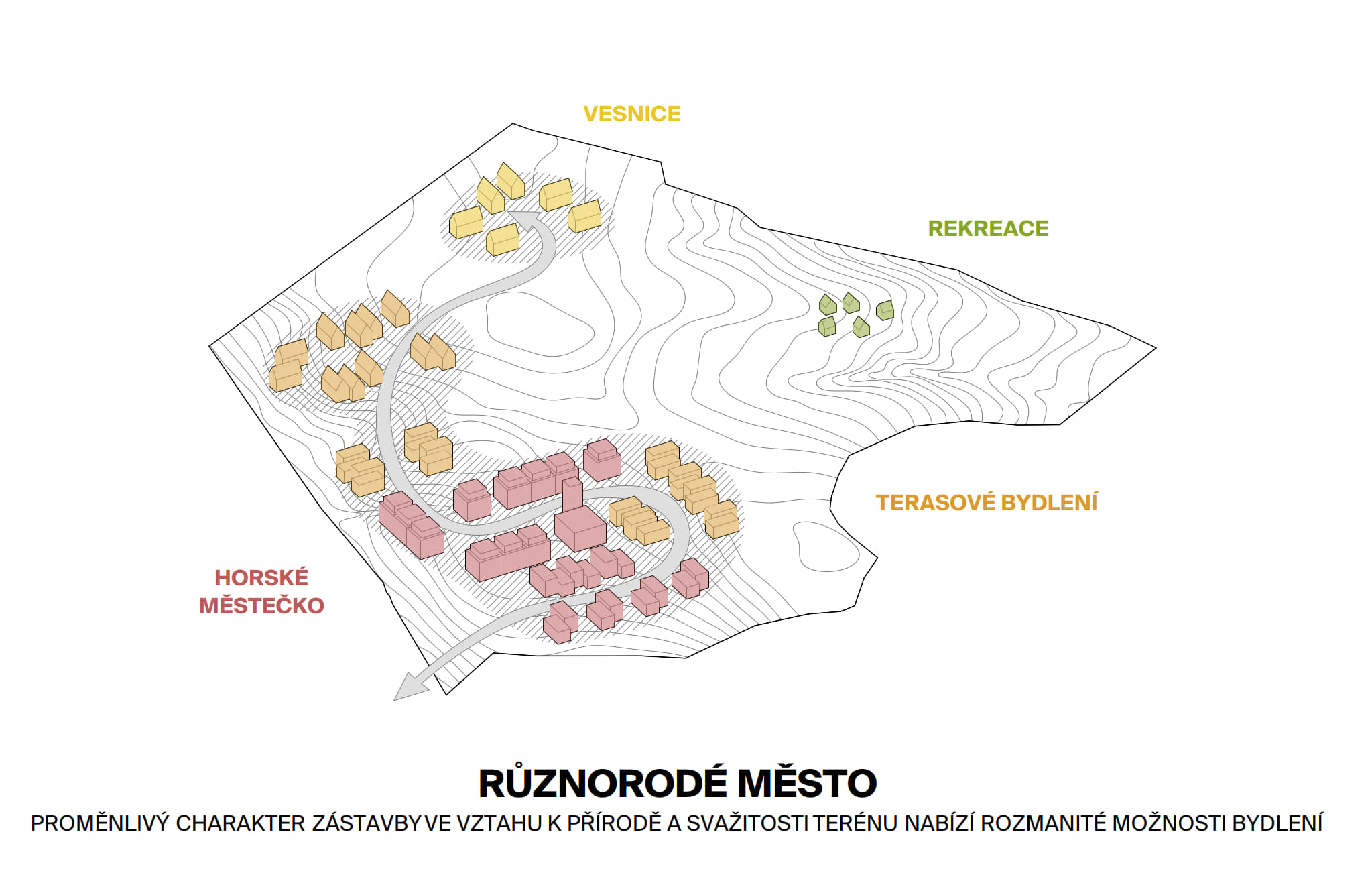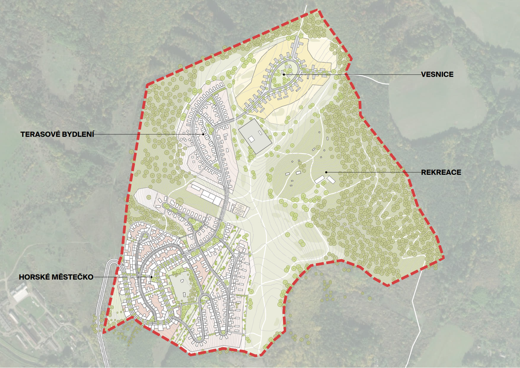 V části nazvané Horské městečko se uvažuje s kompaktní zástavbou drobného měřítka, která bude reagovat na svahování terénu. Uprostřed najdeme ulice a náměstí s malými obchody, službami, restauracemi a kavárnou. Městečko by mělo pokrýt základní občanskou vybavenost včetně školy a školky a nabídnout také pracovní příležitosti.
