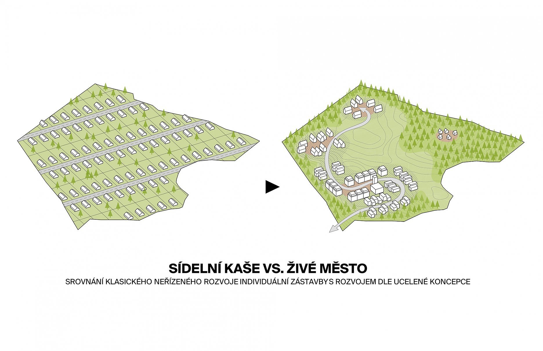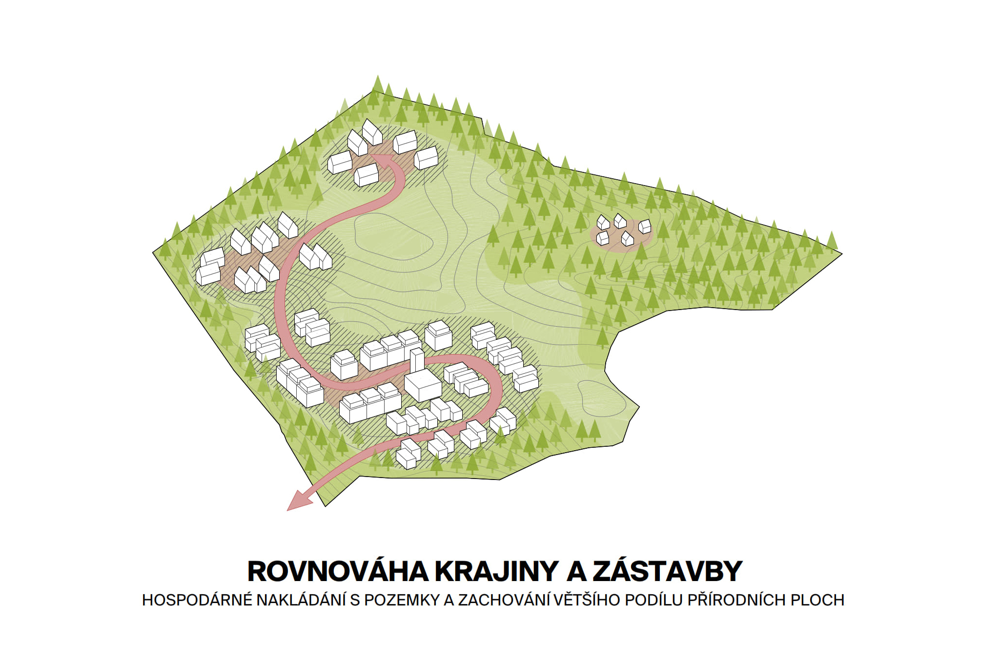 Pokrytí rodinnými domy v tak velkém měřítku jak bylo uvažované v územním plánu, nedává v této podobě ekonomický smysl a není příliš citlivé ke krajině. Rozsah zástavby územního plánu nebude překročen, naopak by po přeskupení hmot mělo dojít k redukci zastavitelné plochy a vyšší ekologické stabilitě území.