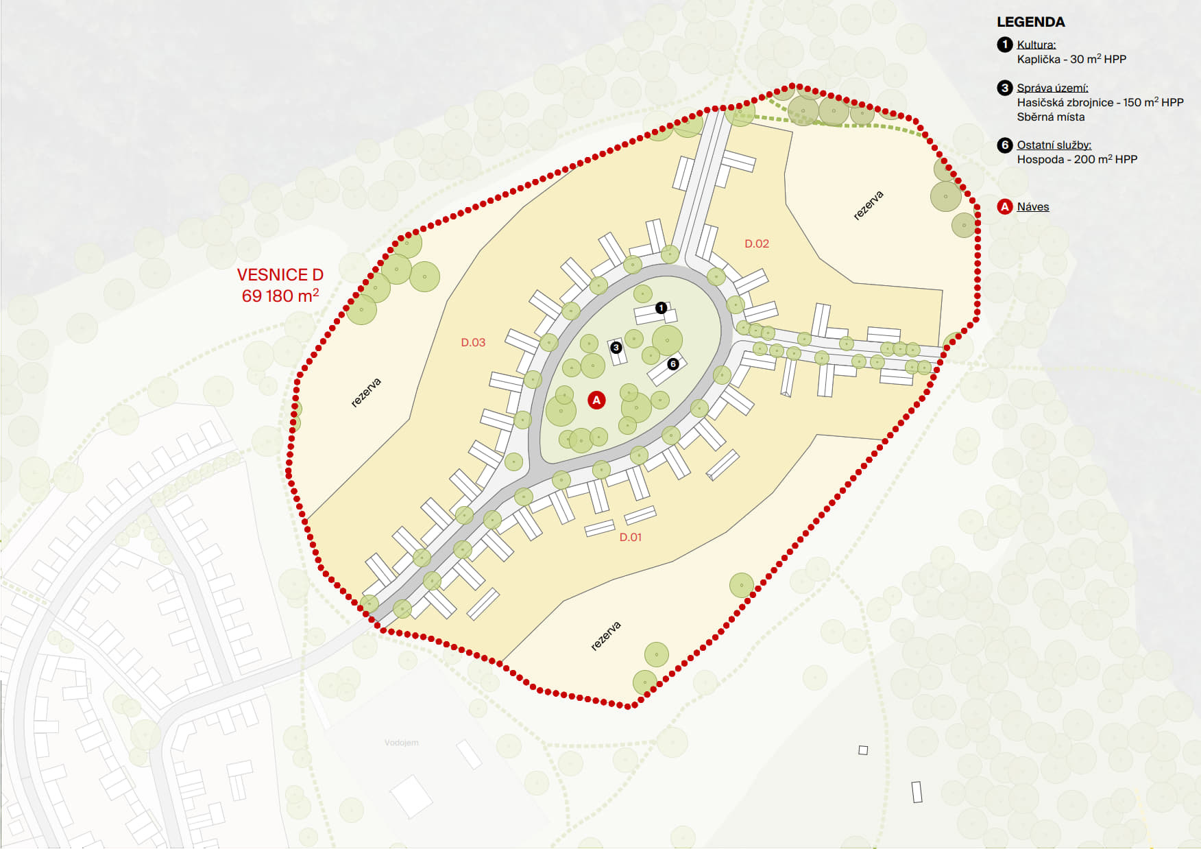 Nejzazší rovinatou část za druhým vodojemem zaujme experimentální ekologická vesnice, ve které se budou testovat udržitelné formy hospodaření.