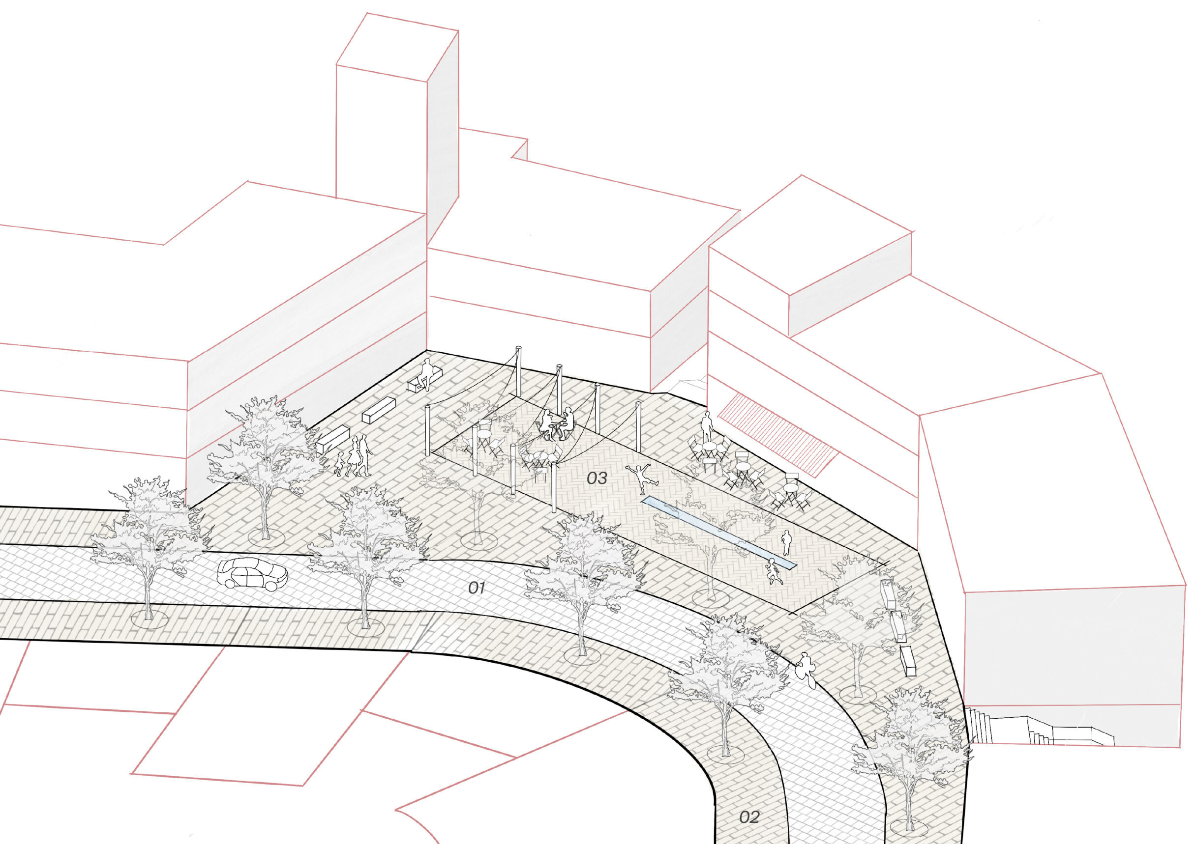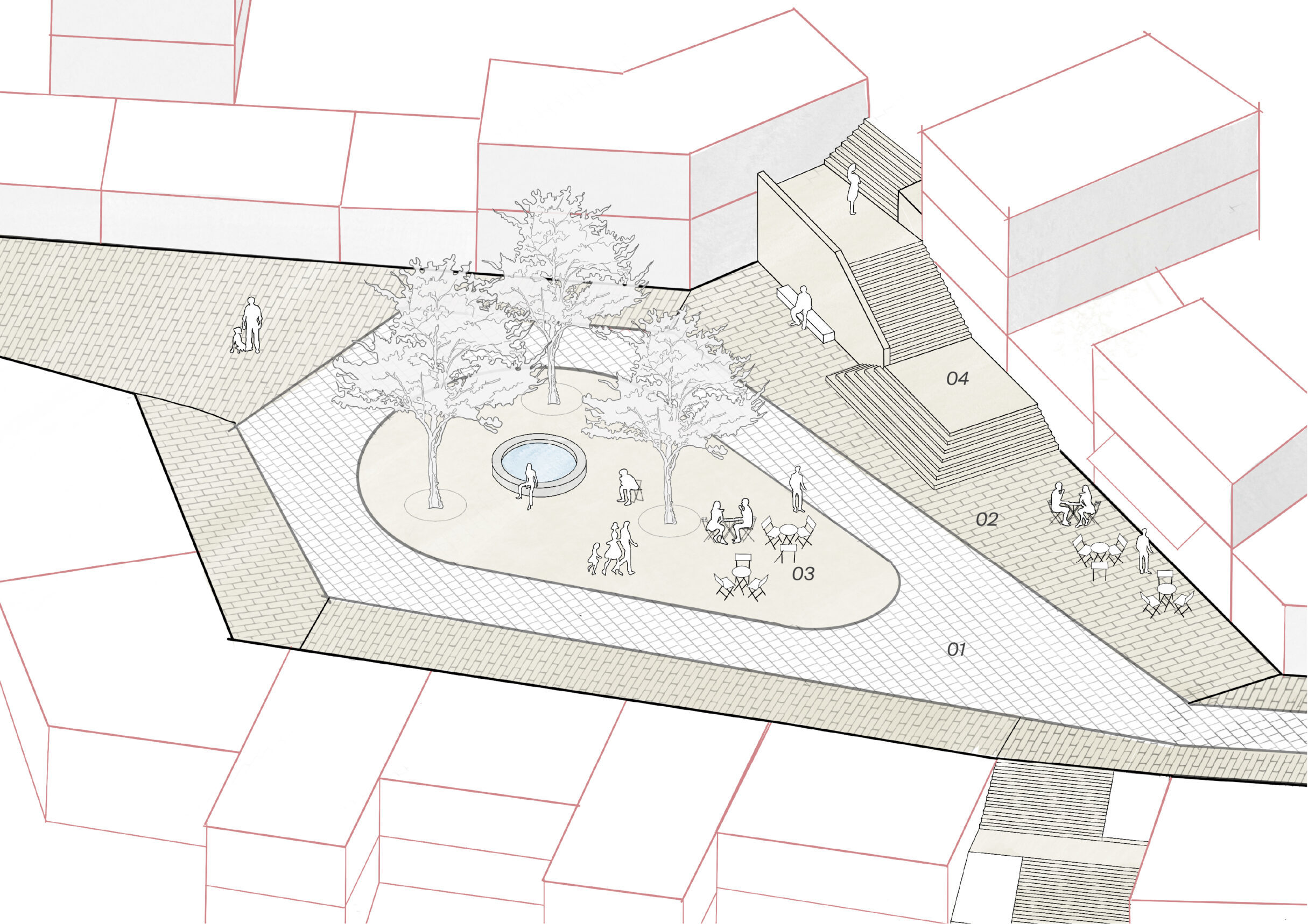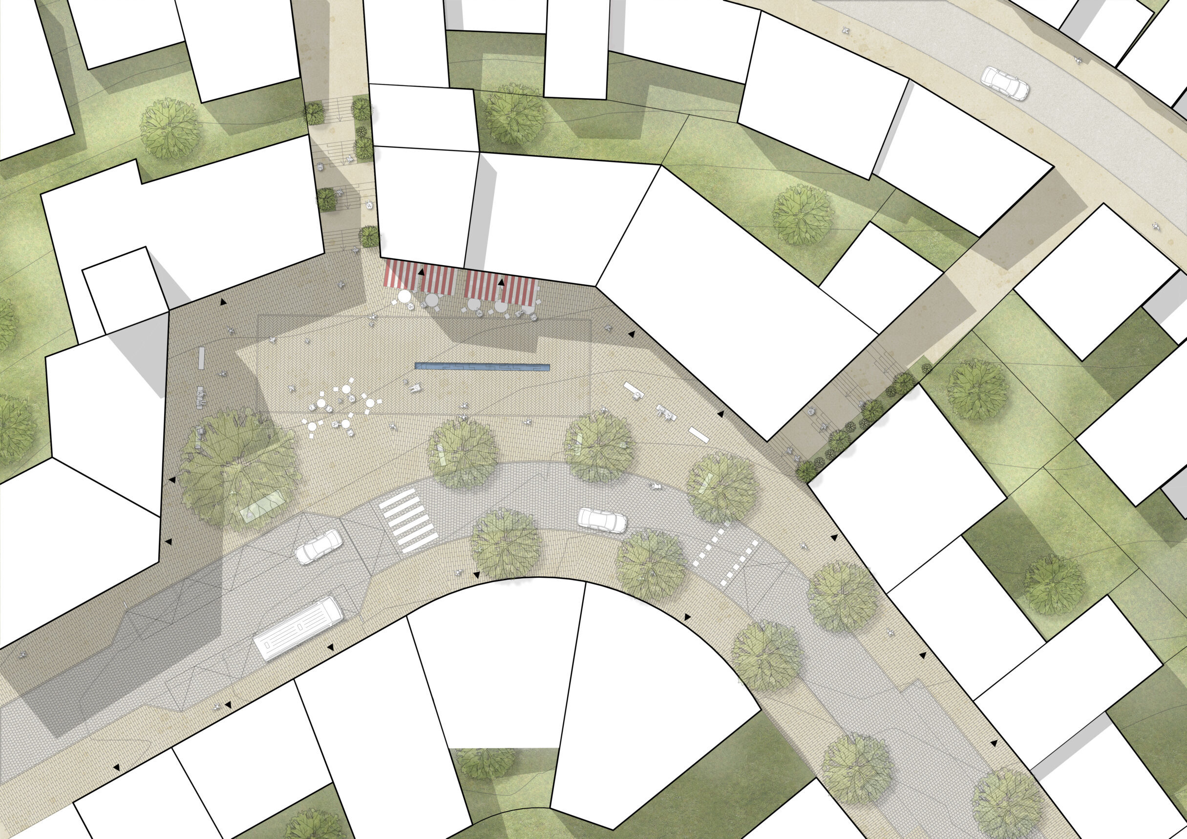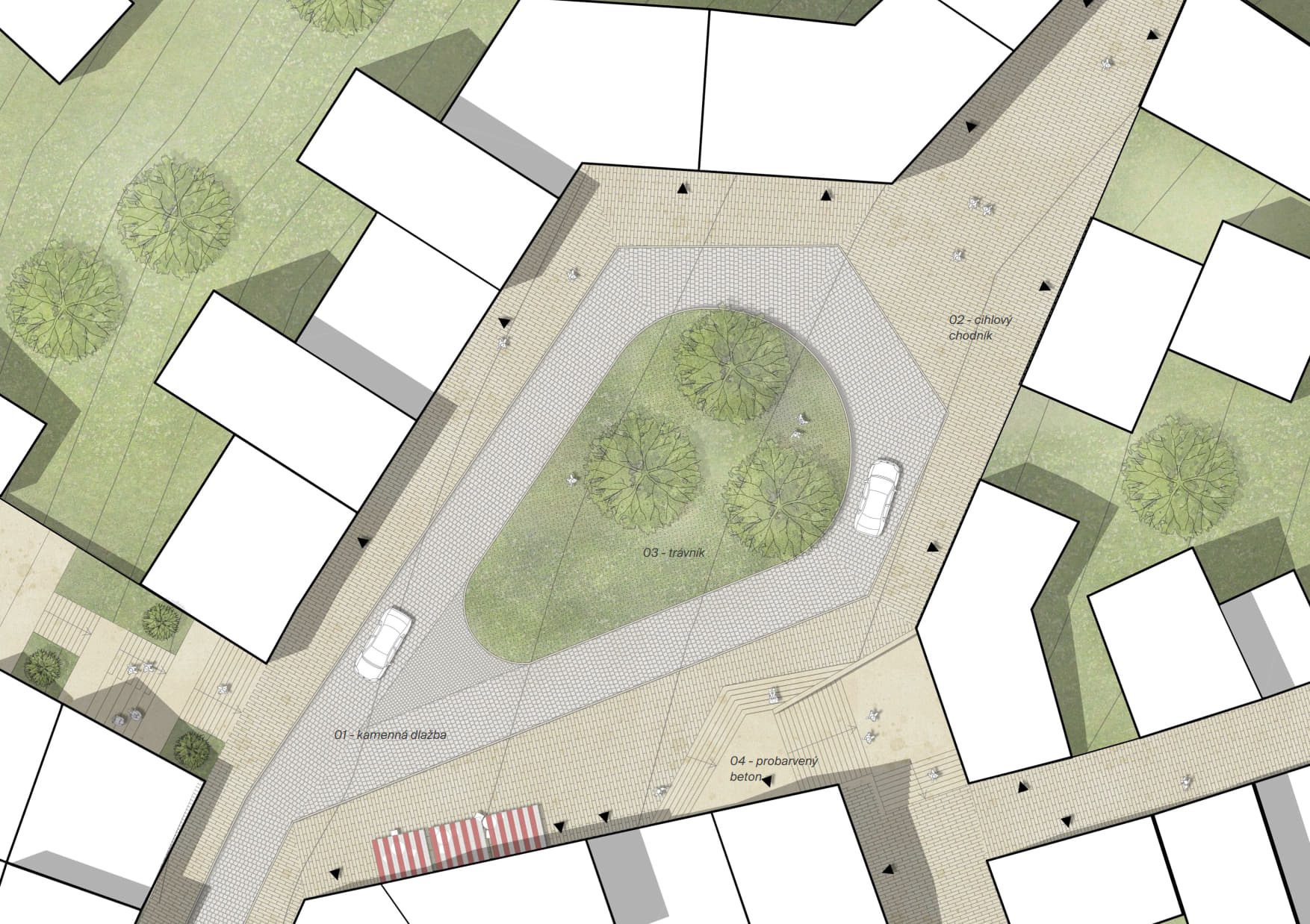 V části terasového bydlení je prostor pro různé formy typologie staveb se zelenými pobytovými střechami, které využijí terénní konfiguraci. Návrh předpokládá přesun zastavitelné kapacity územního plánu do těchto dvou ploch a uvolnění zbylé části území, která bude mít klidnější a přírodě bližší charakter.