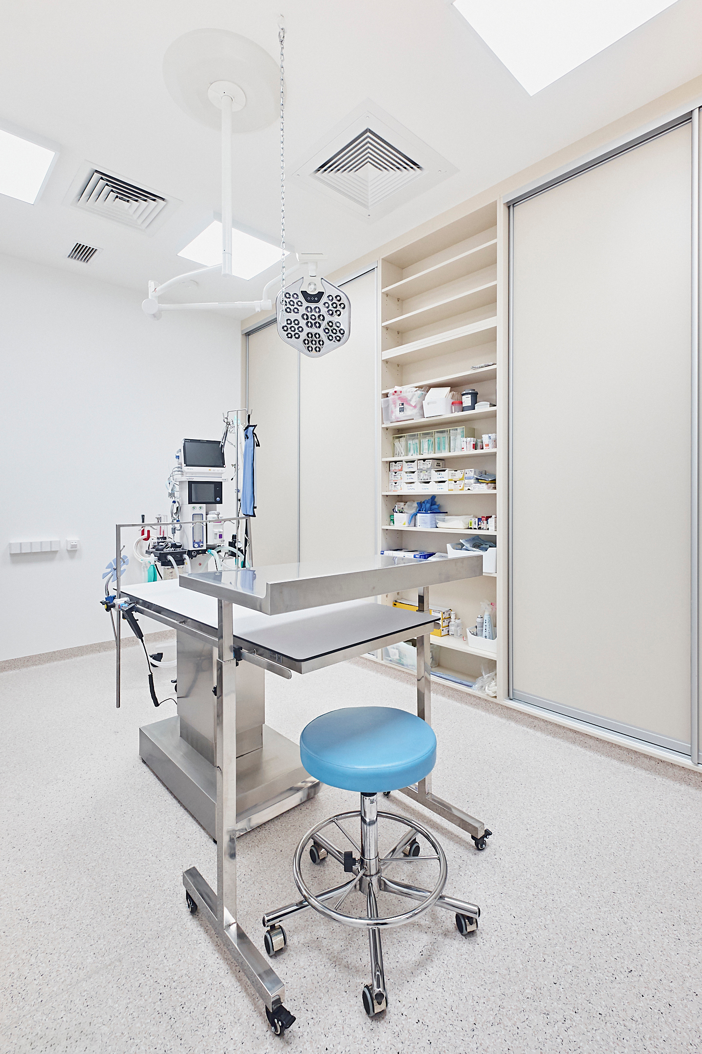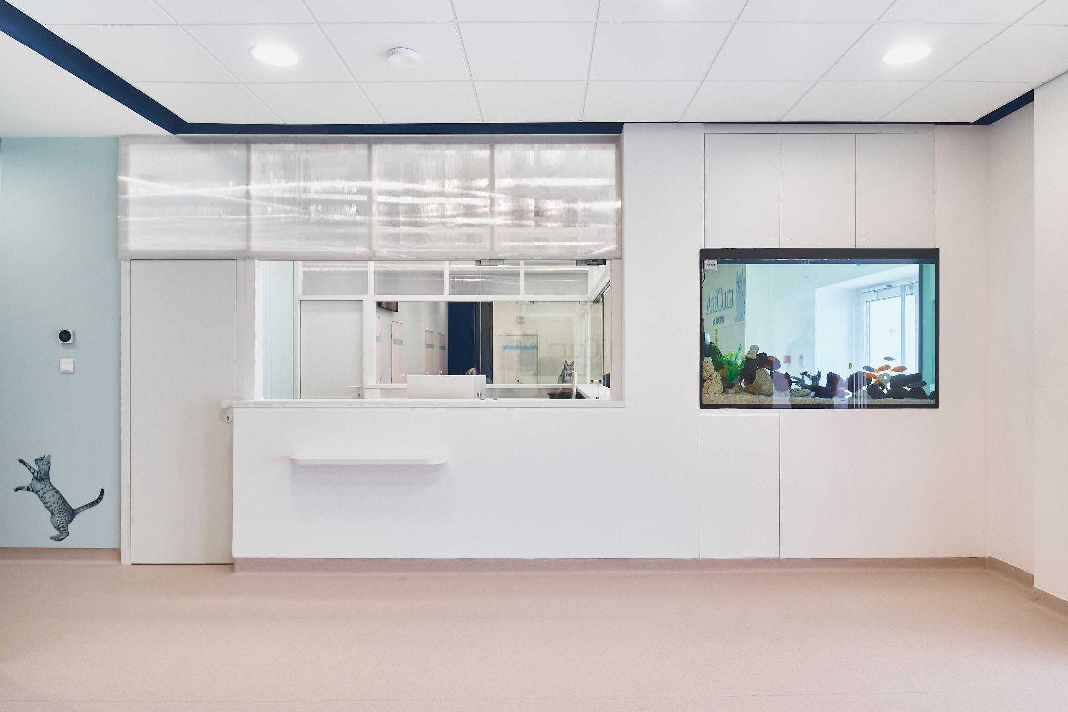 Pri veľkom počte miestností návrh zahŕňal množstvo nábytku vyrobeného na mieru. Použitie rovnakého materiálu, farieb a povrchov zámerne zjednocuje  komplikovanú dispozíciu. Veľakrát diskutovanou a zároveň najväčšou časťou atypického zariadenia je recepcia. S ohľadom na pohotovostné veterinárne služby a kontakt s klientmi je navrhnutá tak, aby ju bolo možné úplne uzavrieť. Naopak, v bežný pracovný deň má pôsobiť otvorenejšie a prístupnejšie.