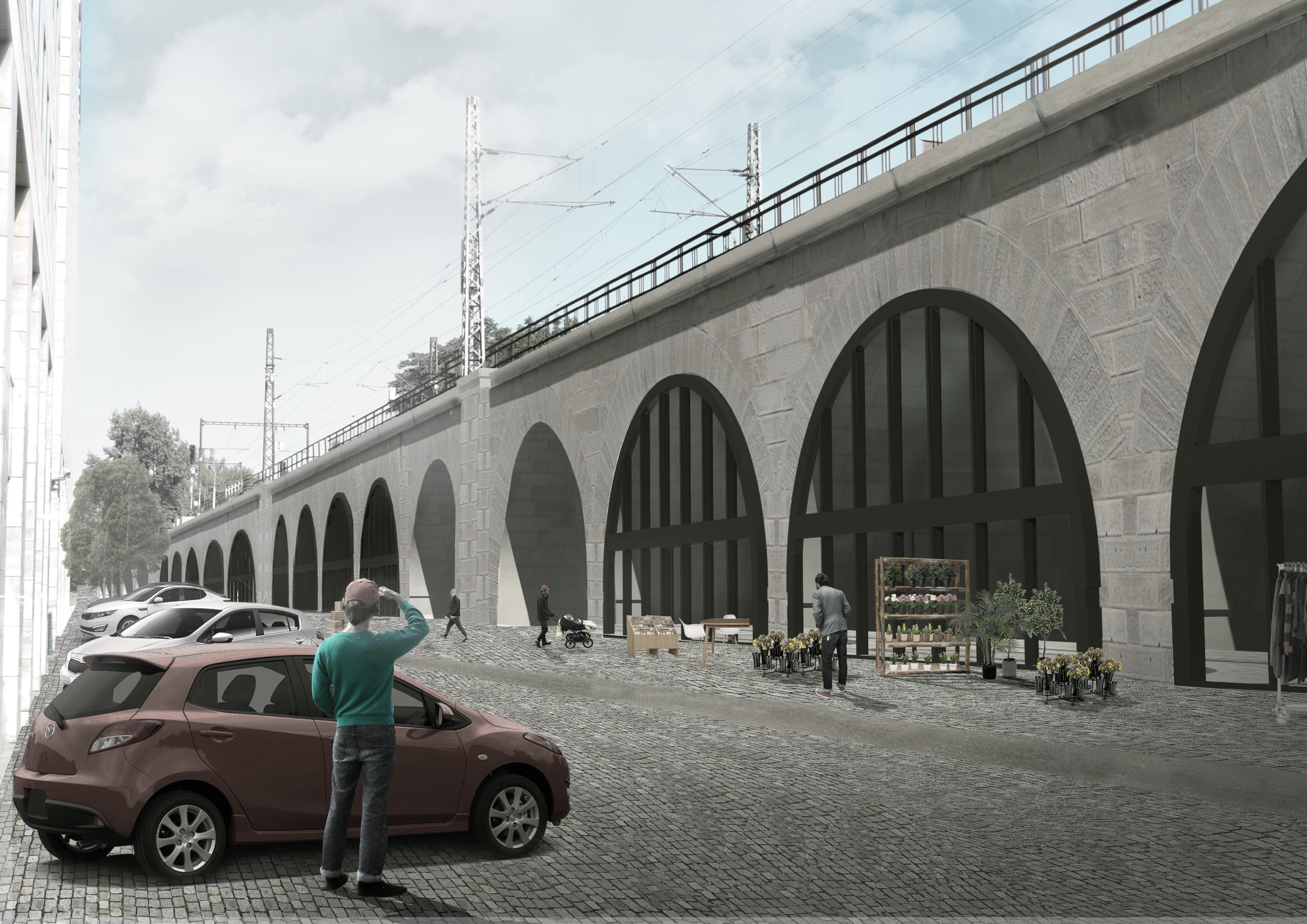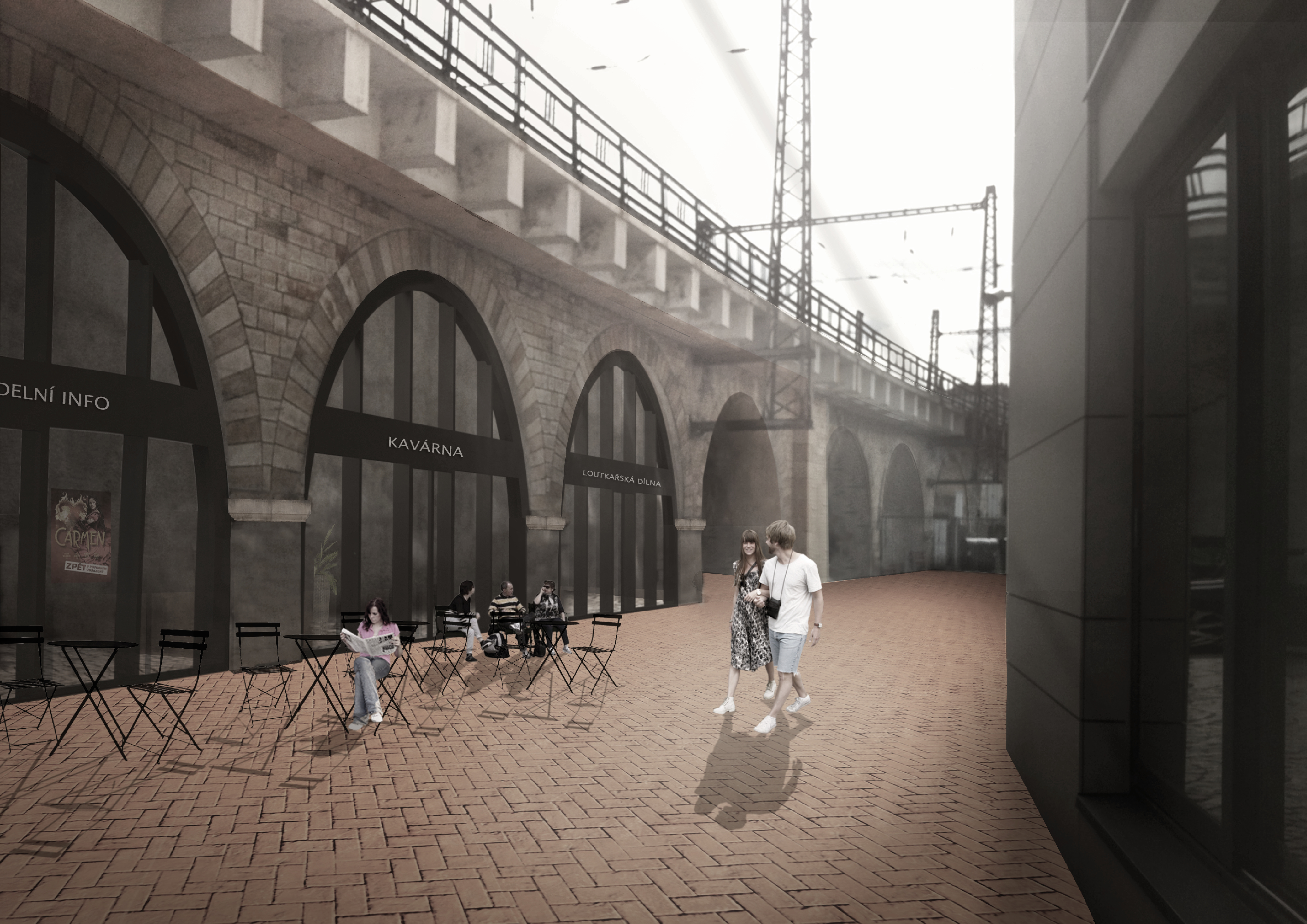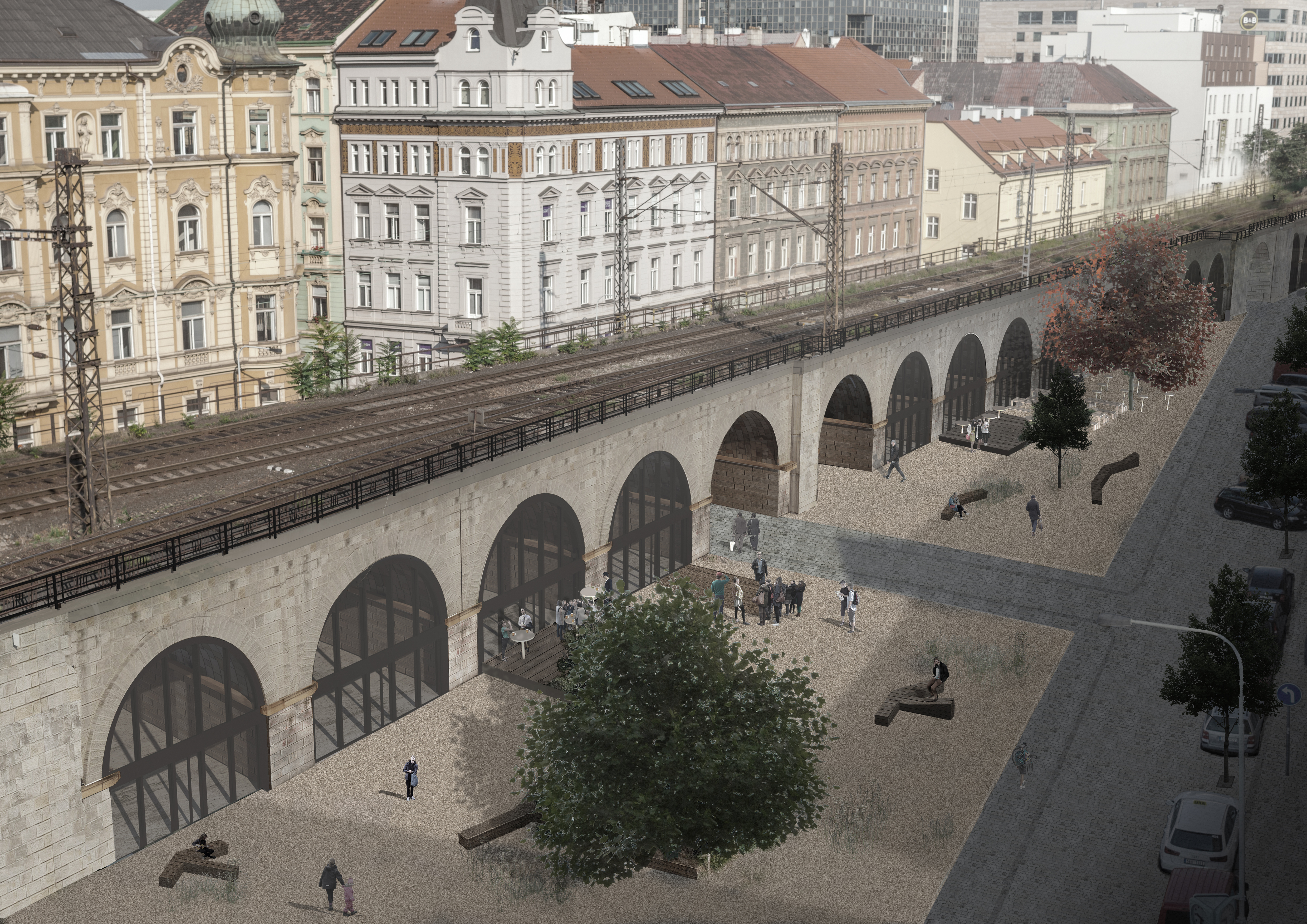 Mírným navýšením před prostorem viaduktu se snažíme vymezit vůči poměrně rušné přilehlé komunikaci, abychom docílili patřičné míry klidu pro předzahrádky kaváren, galerií a obchůdků umístěných v obloucích. Daný prostor skýtá aktivní provoz s přihlédnutím k revitalizaci historicky významné stavby kasáren, kterou přebírá do svého majetku Ministerstvo spravedlnosti.