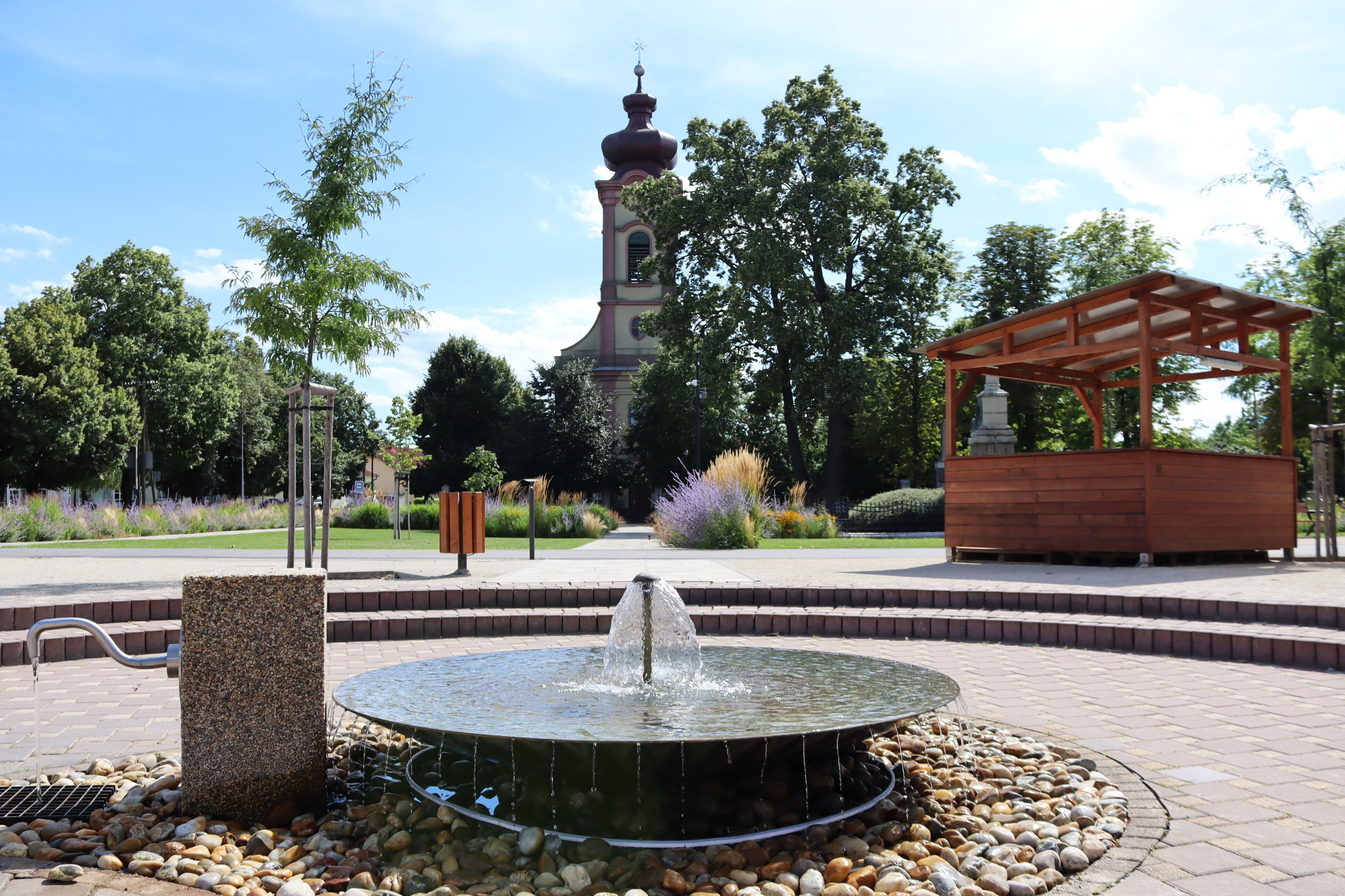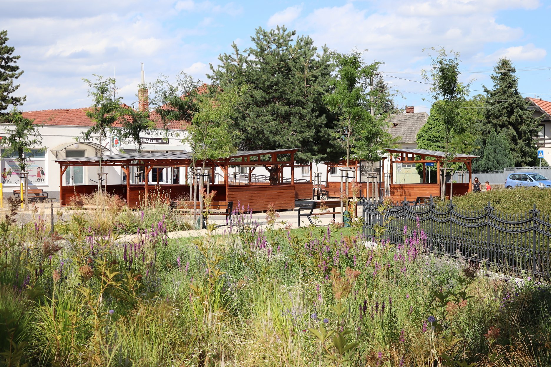Vodozádržné opatrenia na námestí zahŕňajú dažďovú záhradu, podzemnú retenčnú nádrž, hĺbený vodozádržný záhon pozdĺž hlavnej cesty a vodopriepustné spevnené povrchy.