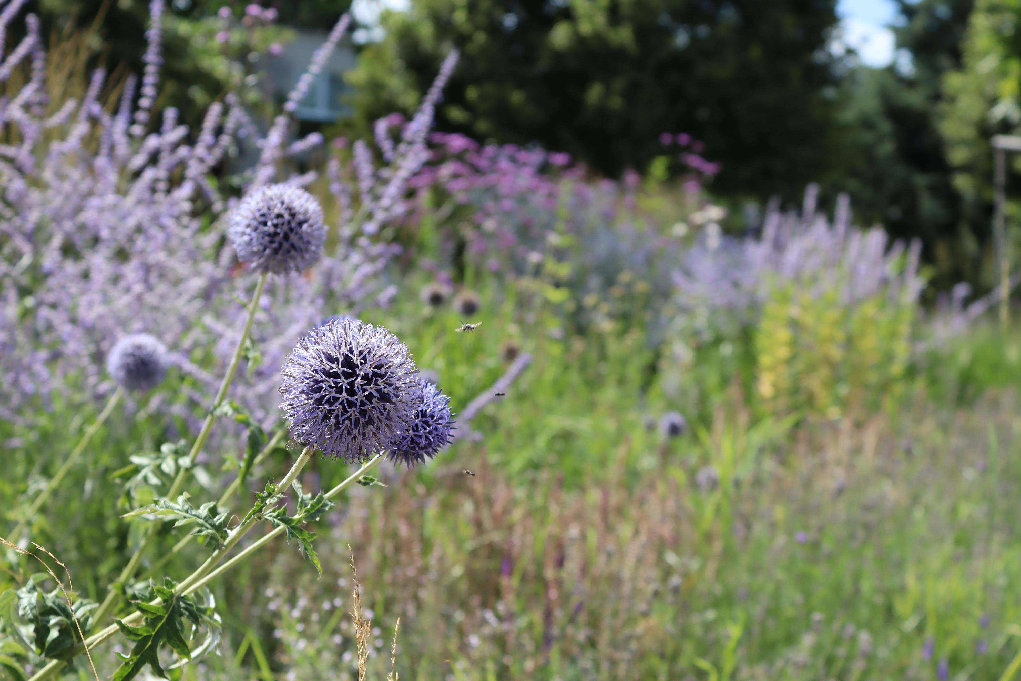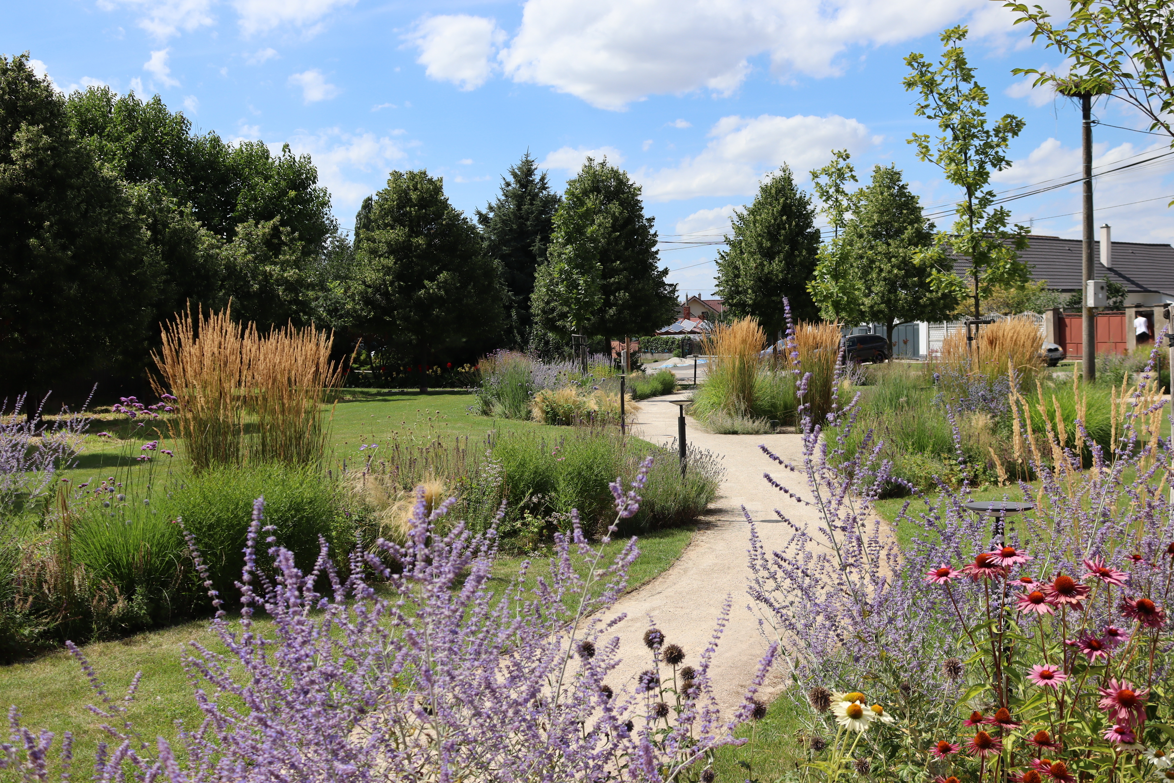 Park lemuje z jednej strany travinno-bylinné spoločenstvo a z druhej strany hĺbené vodozádržné záhony na princípe "bioswales". Dažďová voda zo striech verejných budov je zadržiavaná v podzemných retenčných nádržiach s bezpečnostným prepadom do hĺbených trvalkových záhonov.