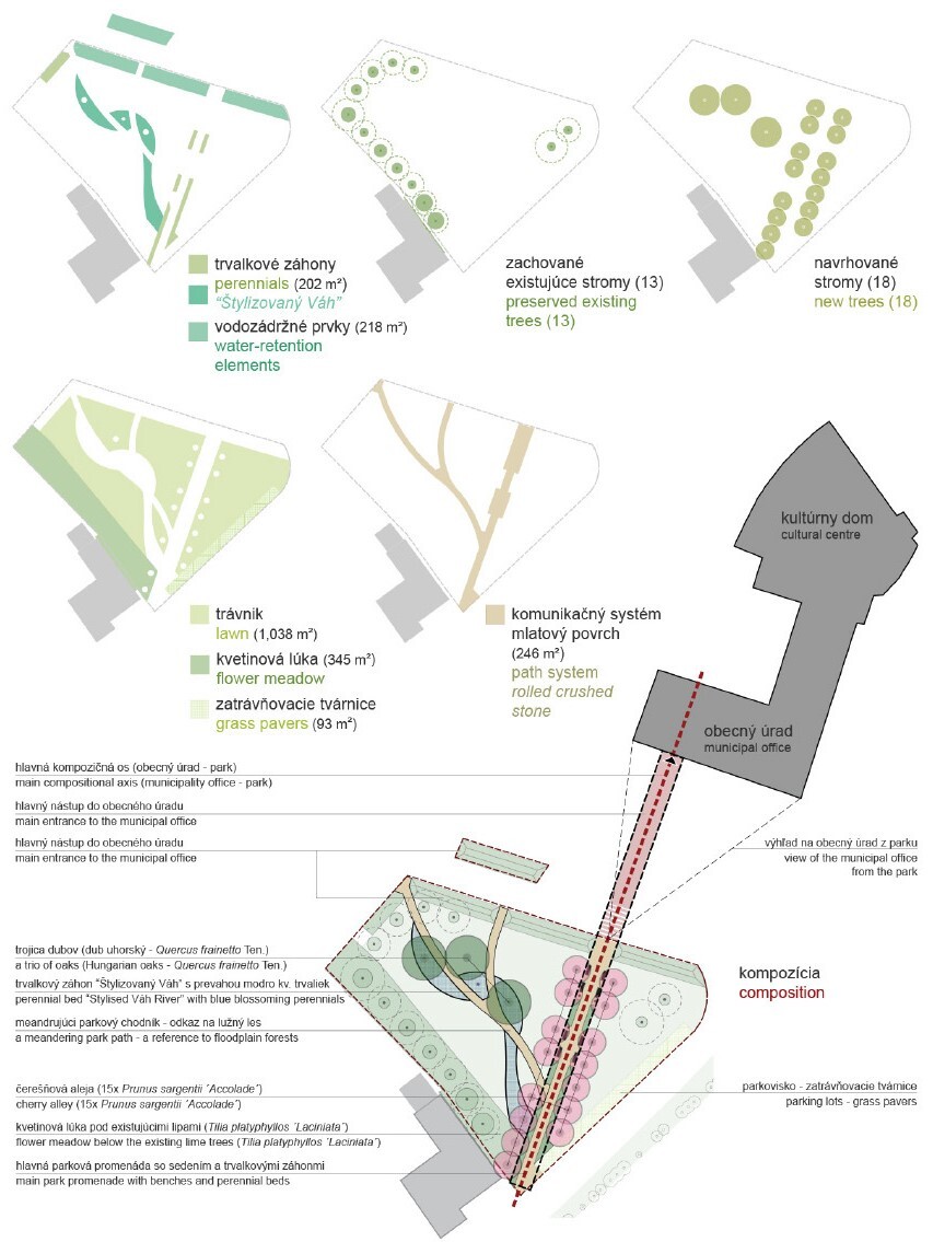 Hlavným kompozičným prvkom parkovo upraveného priestranstva je promenáda s alejou okrasných čerešní, ktorá osovo nadväzuje na hlavný vstup do obecného úradu a je lemovaná trvalkovými záhonmi. Inšpiráciou pre kompozičné riešenie priestoru bola rieka Váh.