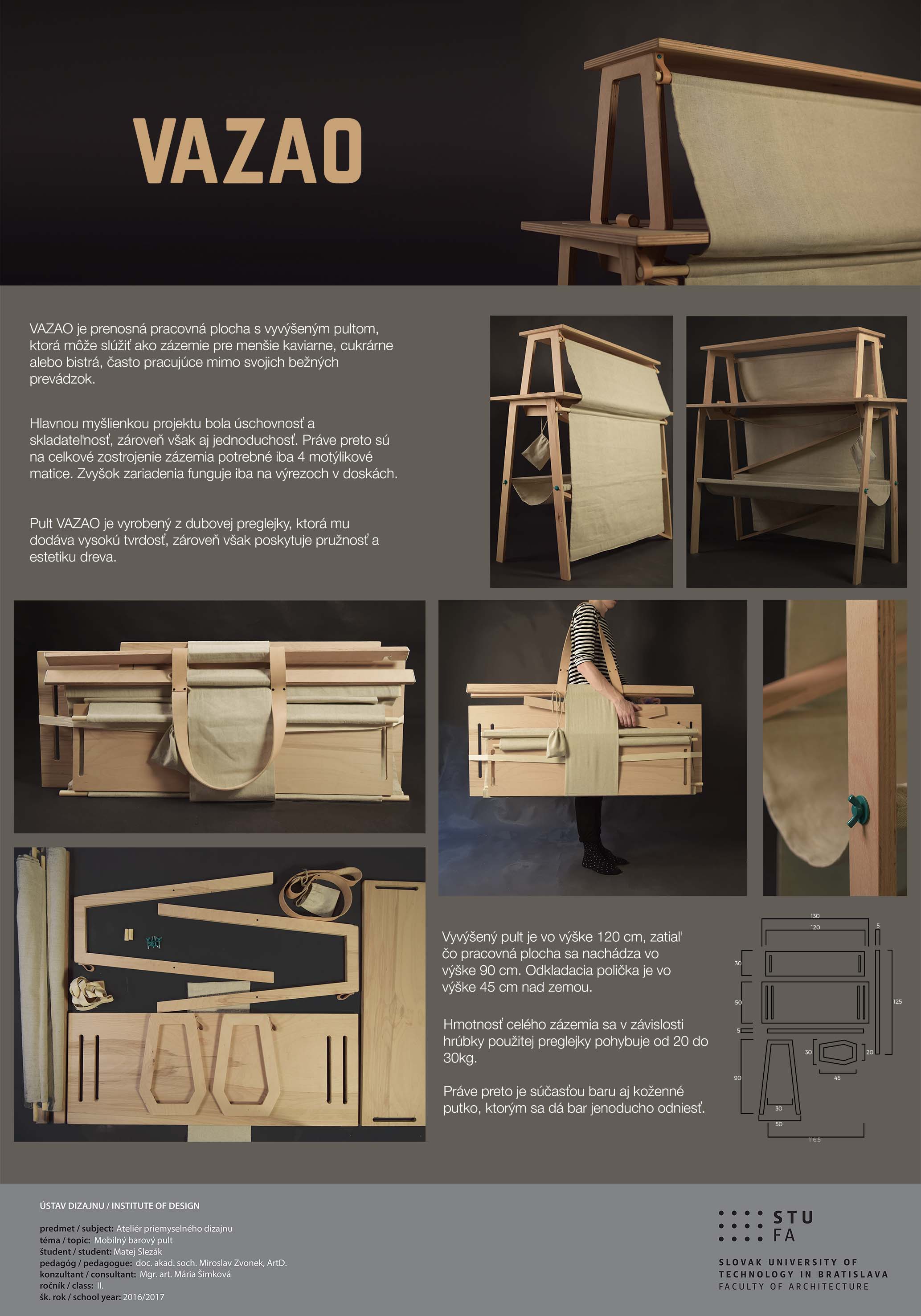 Matej Slezák (3. ročník) za projekt VAZAO. Ide o prenosnú pracovnú plochu s vyvýšeným pultom, ktorá môže slúžiť ako zázemie pre menšie kaviarne, cukrárne alebo bystrá často pracujúce mimo svojich prevádzok.