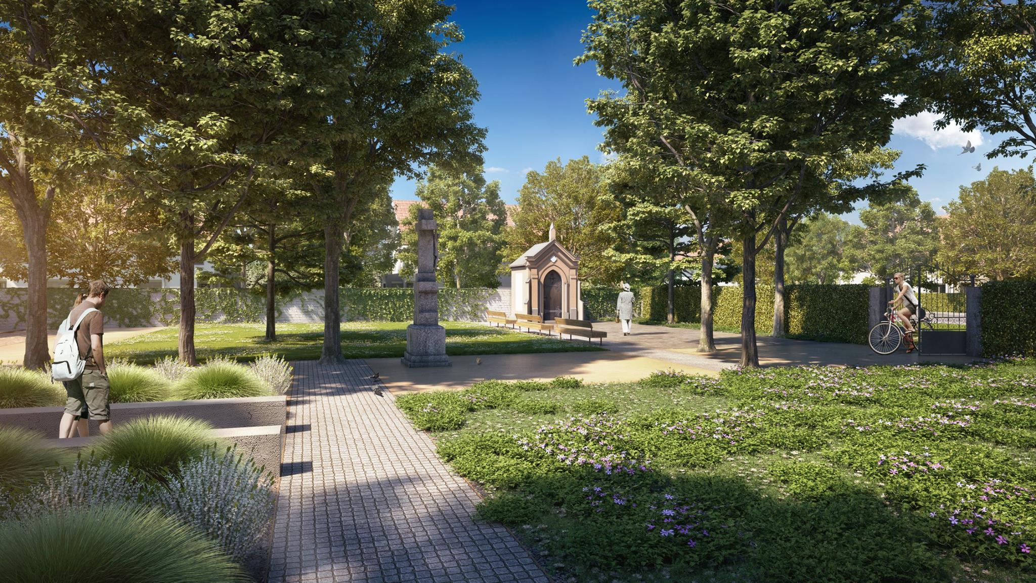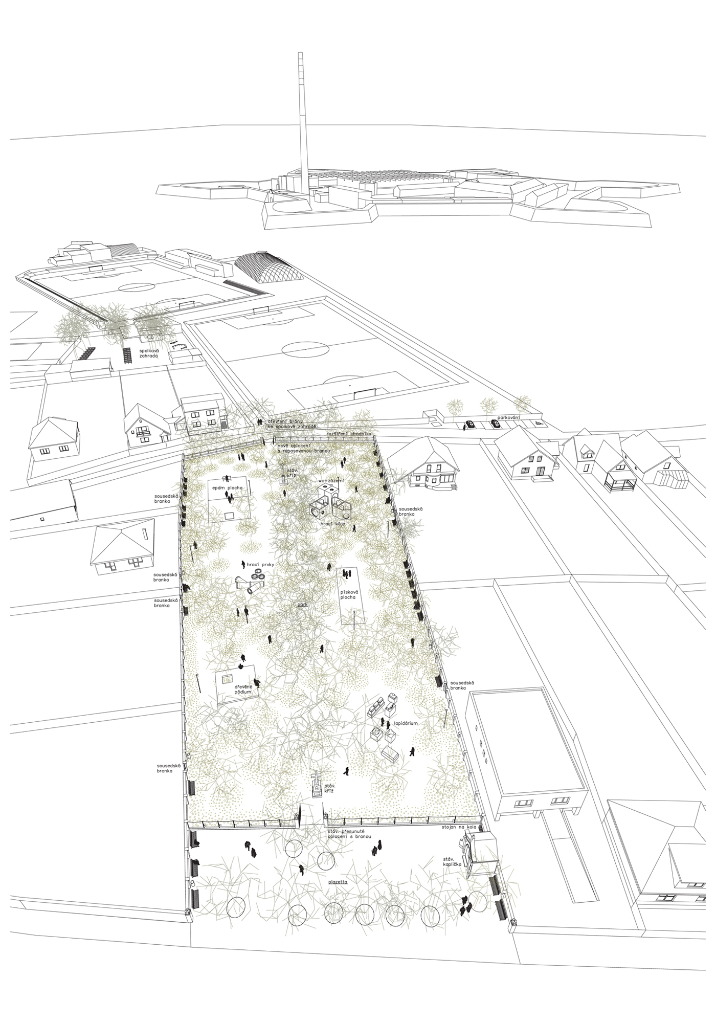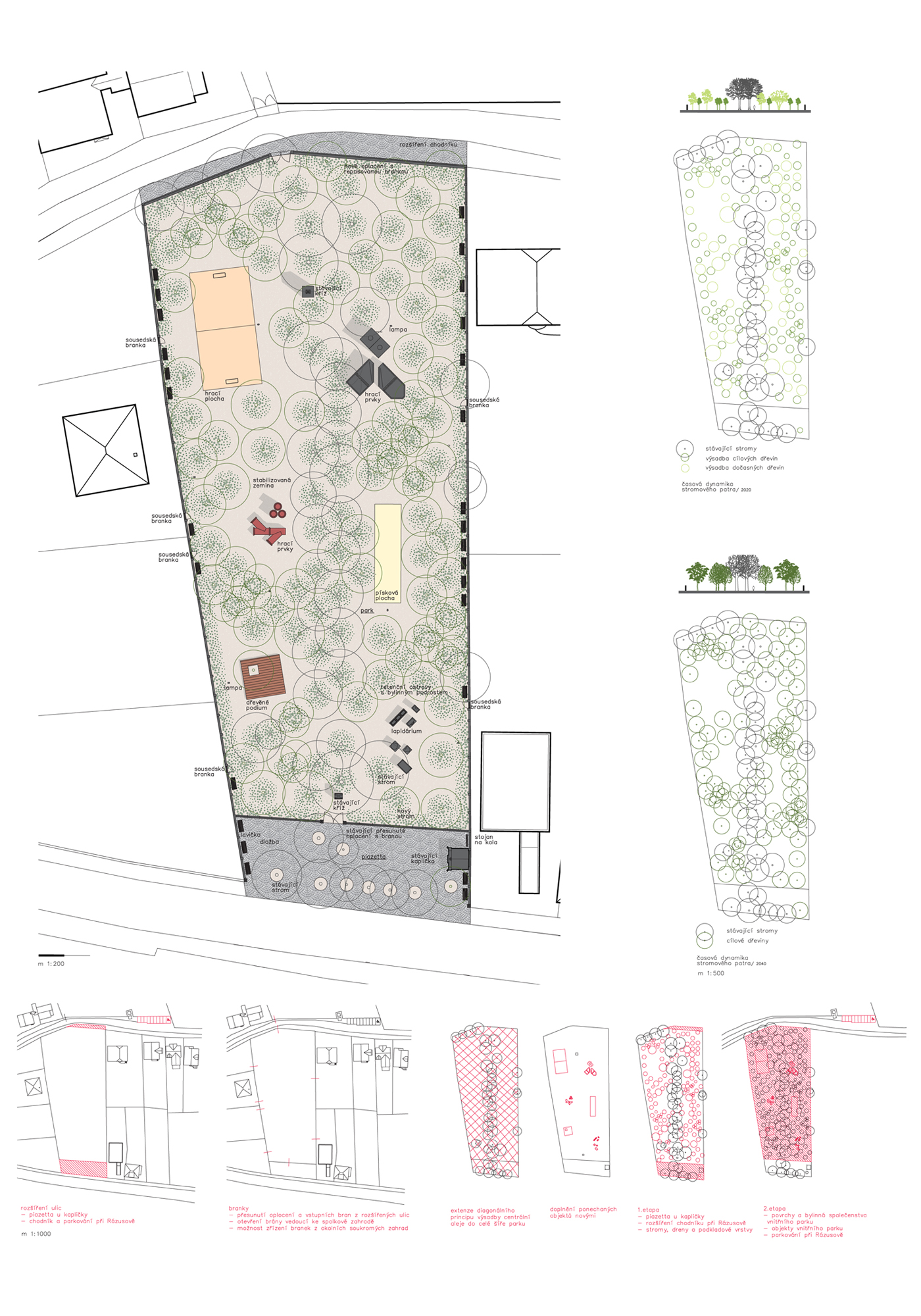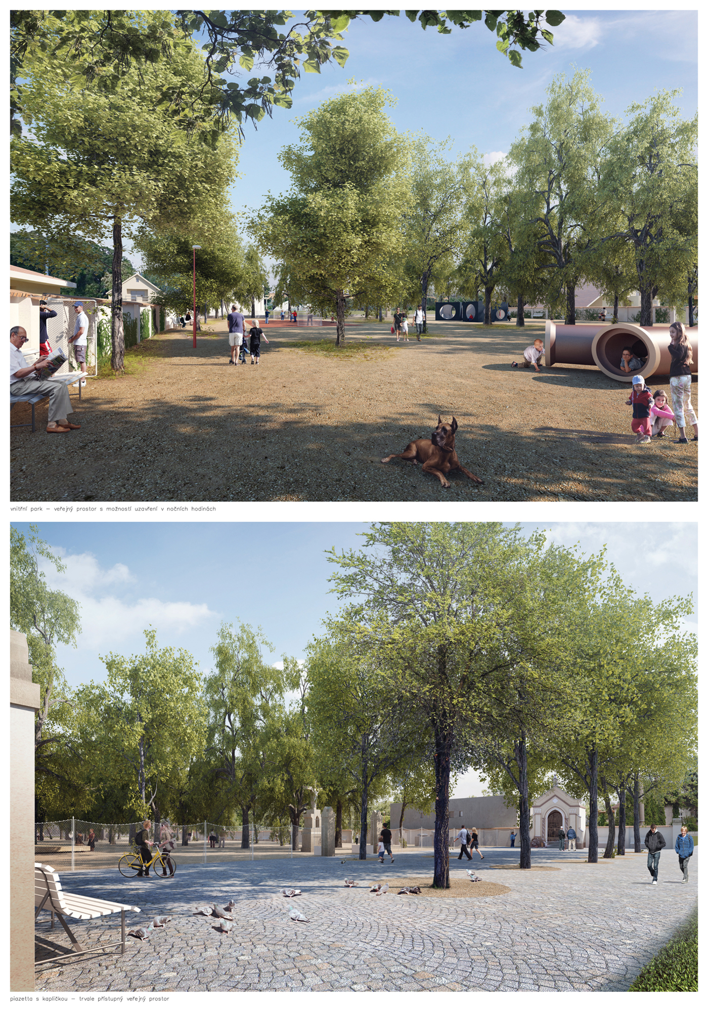 Komisia pokladá urbanistické riešenie za najlepšie z predložených návrhov, najmä vďaka posunutiu plotu pri Hlohoveckej ceste do polohy za kaplnku, čím sa vytvorila “piazetta”. Tá vytvára hodnotný predpriestor nového parku. Celkové riešenie pracuje sviežo s pietnym charakterom areálu. Novú identitu miesta návrh vytvára najmä prostredníctvom stromov. Na základe diagonálnej pôdorysnej geometrie, ktorú udala existujúca alej, autori vytvárajú plán postupného zakladania unikátnej krajinnej úpravy s takmer lesným charakterom, ktorý je v situácii mesta výnimočný. Toto riešenie zaručí pre návštevníkov príjemnú lokálnu klímu počas leta. Návrh minimalizuje potrebu budúcich údržbových prác a ako jediný premýšľa nad charakterom krajinných úprav v dlhodobom horizonte. Návrh je postavený spôsobom, ktorý umožňuje veľmi voľné narábanie s umiestňovaním mobiliáru, objektov a povrchov. Je v tomto smere otvorený a jednoducho upravovateľný aj v budúcnosti. Komisia považuje predložený rozpočet za veľmi schematický, ale etapizovateľnosť výstavby za bezproblémovú. Komisia hodnotila kladne multidisciplinárne zloženie tímu – architekt, krajinná architektka a výtvarník.