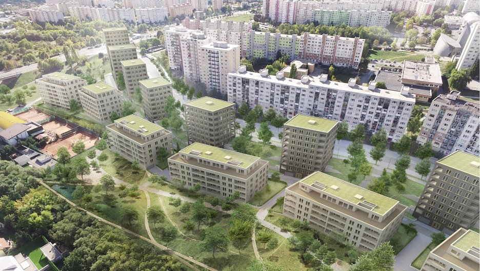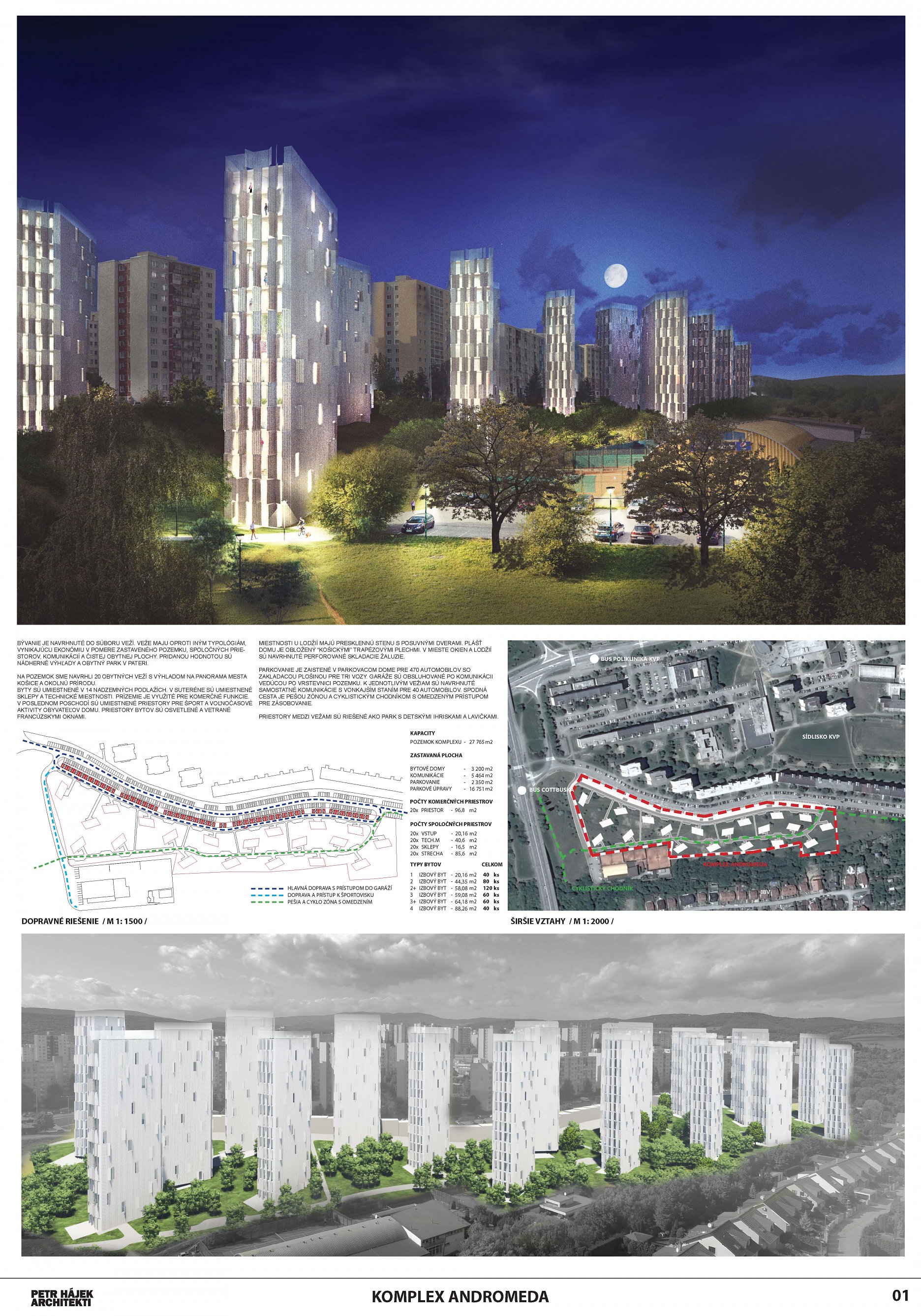 "Bydlení je navrženo do souboru věží. Věže mají, oproti jiným typologiím, vynikající ekonomii v poměru zastavěného prostoru, společných prostor, komunikací a čisté obytné plochy. Přidanou hodnotou jsou nádherné výhledy a obytný park v parteru. Dvacet obytných věží je na pozemku rovnoměrně umístěno tak, aby byl z každého bytu výhled do okolí a zároveň se minimalizovalo narušení soukromí přímým pohledem do oken sousedů. Dané řešení také přispívá k dobré prosluněnosti jednotlivých bytových jednotek. Relativně drobná půdorysná stopa domů má za cíl uchránit co největší plochu pozemku pro využití jako pobytový veřejný park s lavičkami a hřišti."