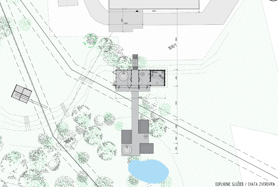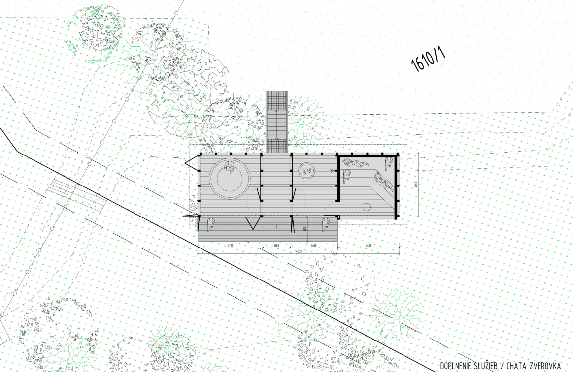 Objekt umiestňujeme do terénneho spádu v blízkosti chaty Zverovka. Južná časť pozemku je porastená lesom, ktorý sa smerom k chate postupne rozvoľňuje. Vďaka zasunutiu pavilónu k chate a odstupu od lesa dokážeme objekt preslniť.