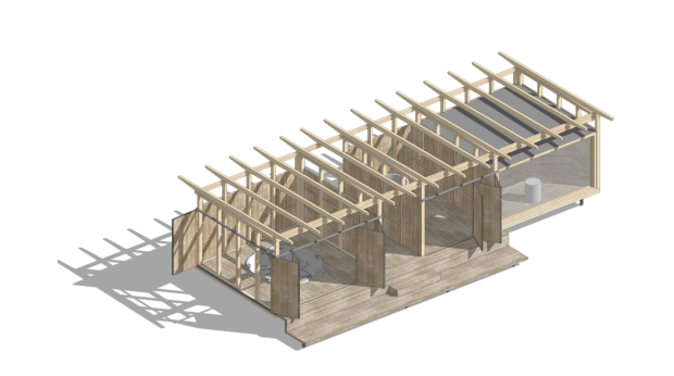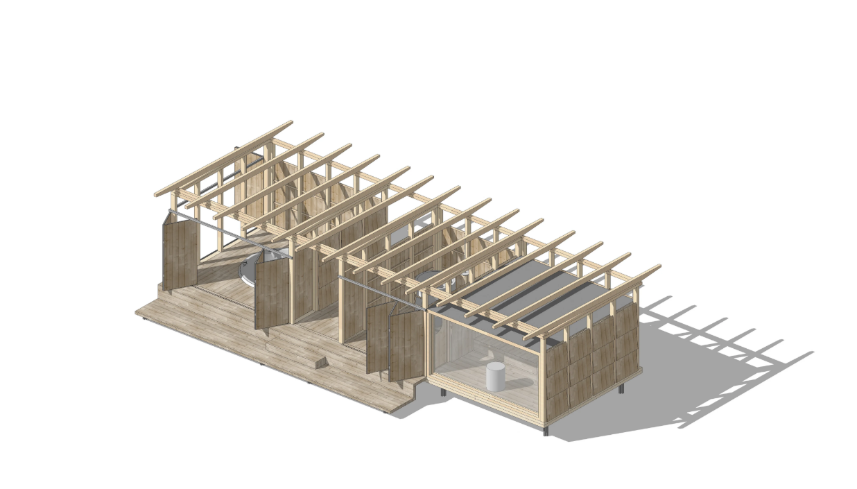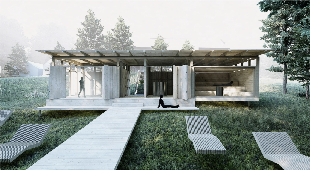 Vírivka a sauna majú slúžiť samostatne, preto ich oddeľuje prístupová chodba. Odsadenie strechy dovoľuje prevetrávanie prevádzky zaťaženej vlhkom. Vďaka sklopno-posuvným dverám je možné objekt zabezpečiť pri nevyužívaní resp. otvoriť podľa preferencii návštevníkov.