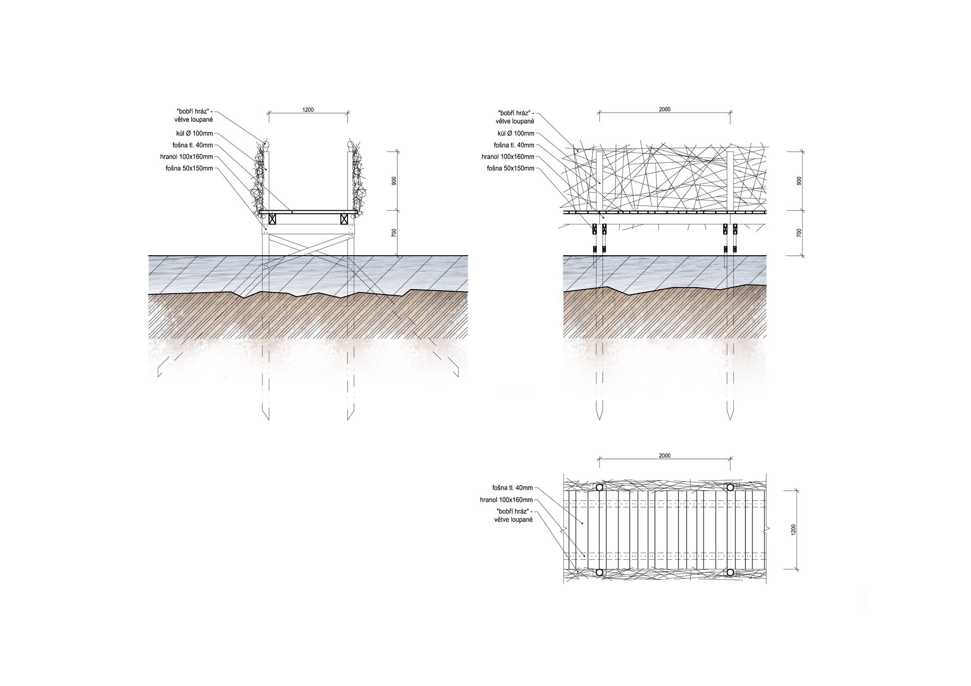 Prírodné materiály, konštrukcie nad terénom, zakladanie na dubových pilótach a podvaloch, stavba realizovaná len s ručným náradím...