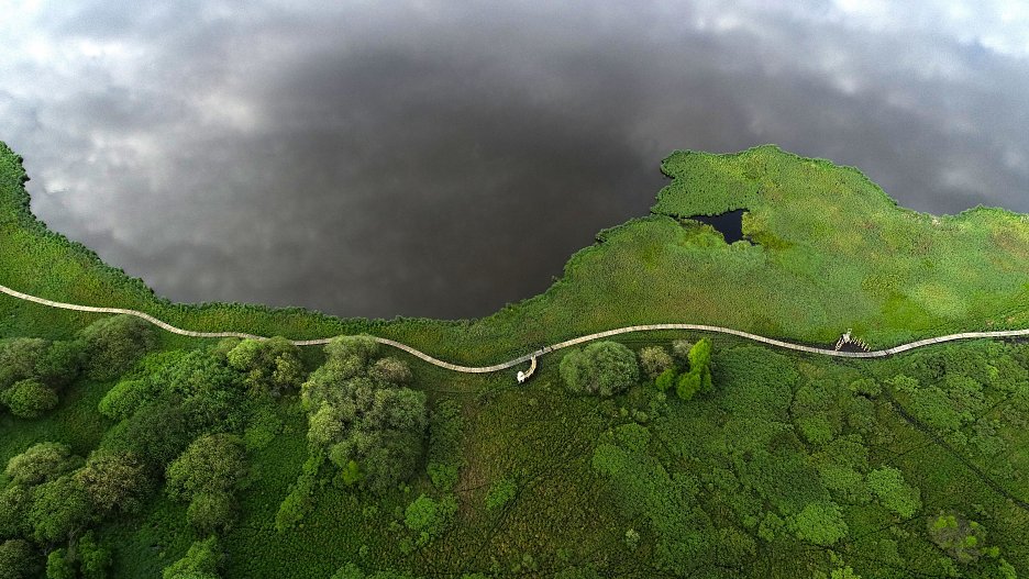 Z lesa vystupujeme přímo k rybníku v místě, kde do něj ústí napájecí říčka Olšina. Z dálky jsou v ústí říčky vidět nashromážděné větve, snad bobří hráz? Ve skutečnosti je to lávka, která nás převede na druhou stranu říčky. Pěšina přechází v dřevěný chodník, ve kterém je občas chybějící prkno nahrazené naučným kovovým prvkem s přírodní tématikou, třeba s odlitky zvířecích stop. Pokračujeme k vyhlídce, kterou tvoří krátký vyvýšený úsek chodníku. Po levé straně se rozprostírají rozlehlé pláně rašeliniště, po pravé straně zase klidná a temná hladina rybníka. Přítomnost vody všude kolem je cítit v každém kroku. Komu k rozhlédnutí se a nasátí okolní krajiny nestačí vyvýšený chodník, může si vylézt na kmen se strážním košem. K němu je ovšem třeba přeskákat mokřad po zaražených kůlech. My po úzké stoupající lávce lezeme do velké ptačí budky, kde odpočíváme a vyhlížíme na rybník z trochu jinak pojaté ptačí perspektivy.