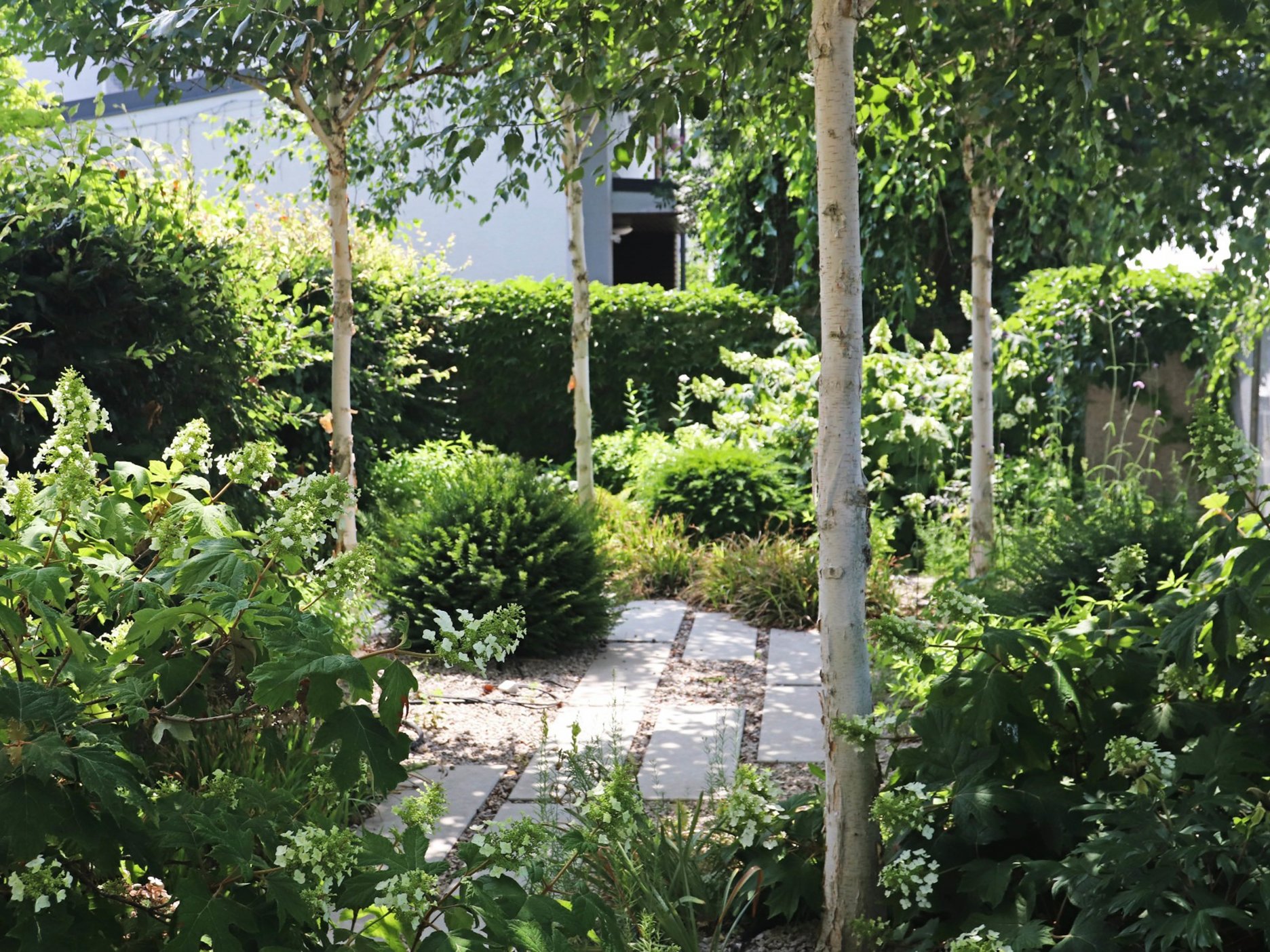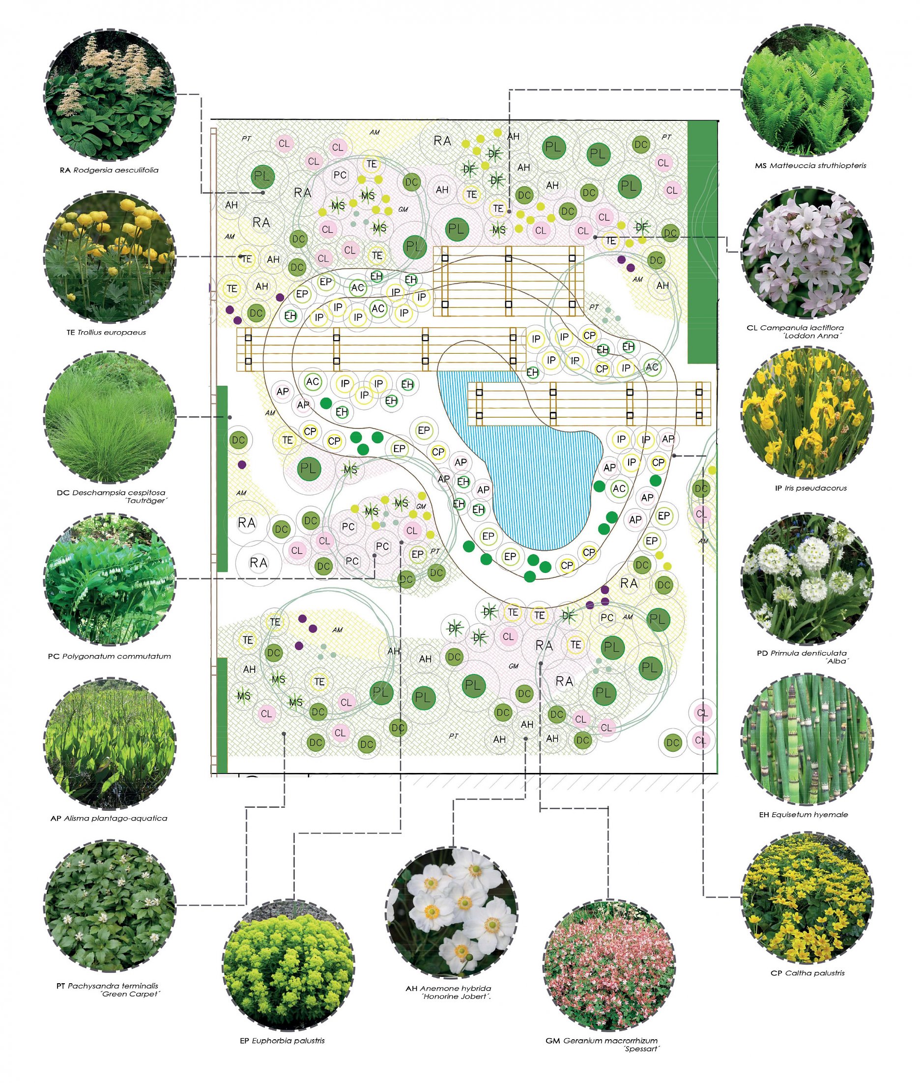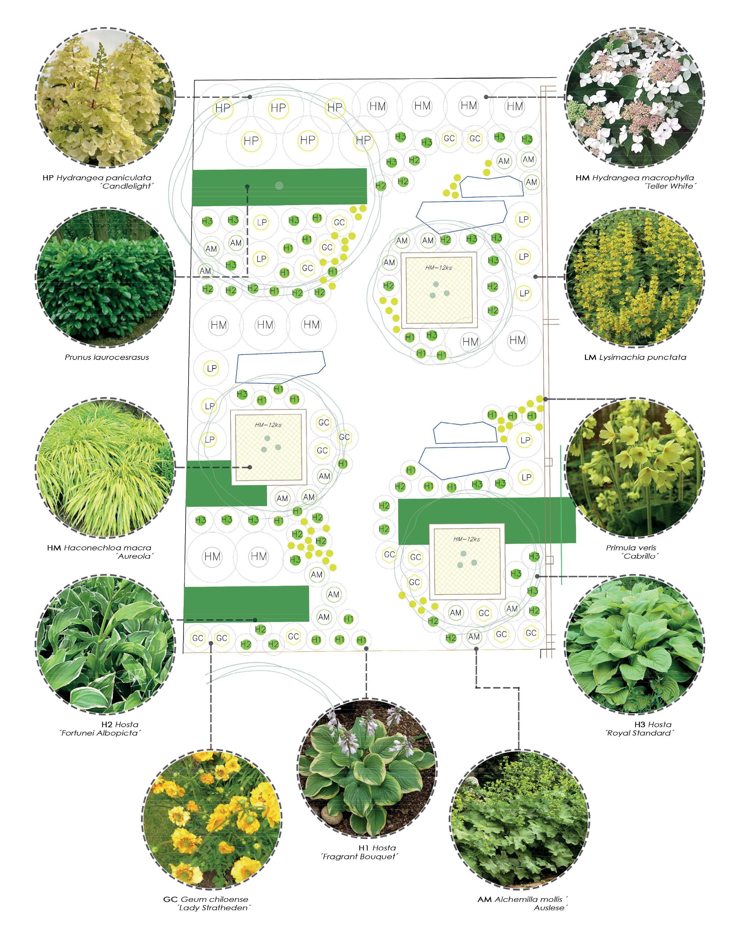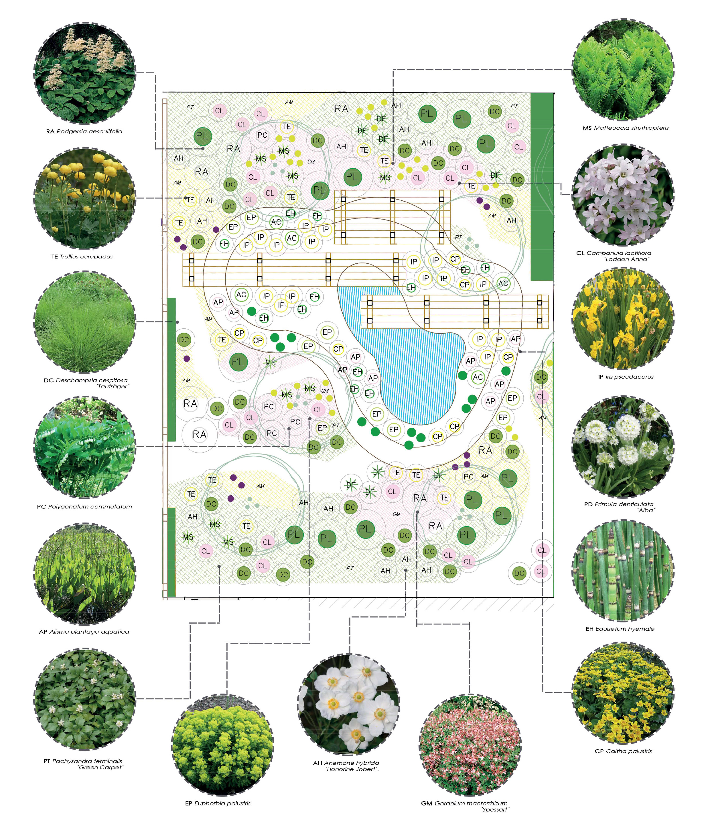 Malá záhrada v satelitnej zástavbe pri Bratislave mala splniť náročné požiadavky mladého investora. Záhrada sa uzatvára do seba, vytvára vlastný vnútorný mikrokozmos členený na menšie rozmanité celky. Koncept využíva vnútorného členenia, neprehľadnosti, k optickej ilúzii - vizuálnemu zväčšeniu malého priestoru. Pracuje s princípom "záhradných miestností“ s efektívnym využitím miesta a vytvorením funkčných zón. Riešenie reflektuje aj zlepšenie mikroklímy (veterné a suché stanovište) a manažment dažďovej vody. V záhrade našla miesto aj malá mokraď, výrazné zastúpenie stromov poskytuje tieň, zlepšuje mikroklímu a spolu s rôznymi zástenami pôsobia ako malé vetrolamy.