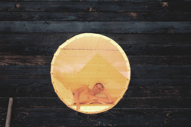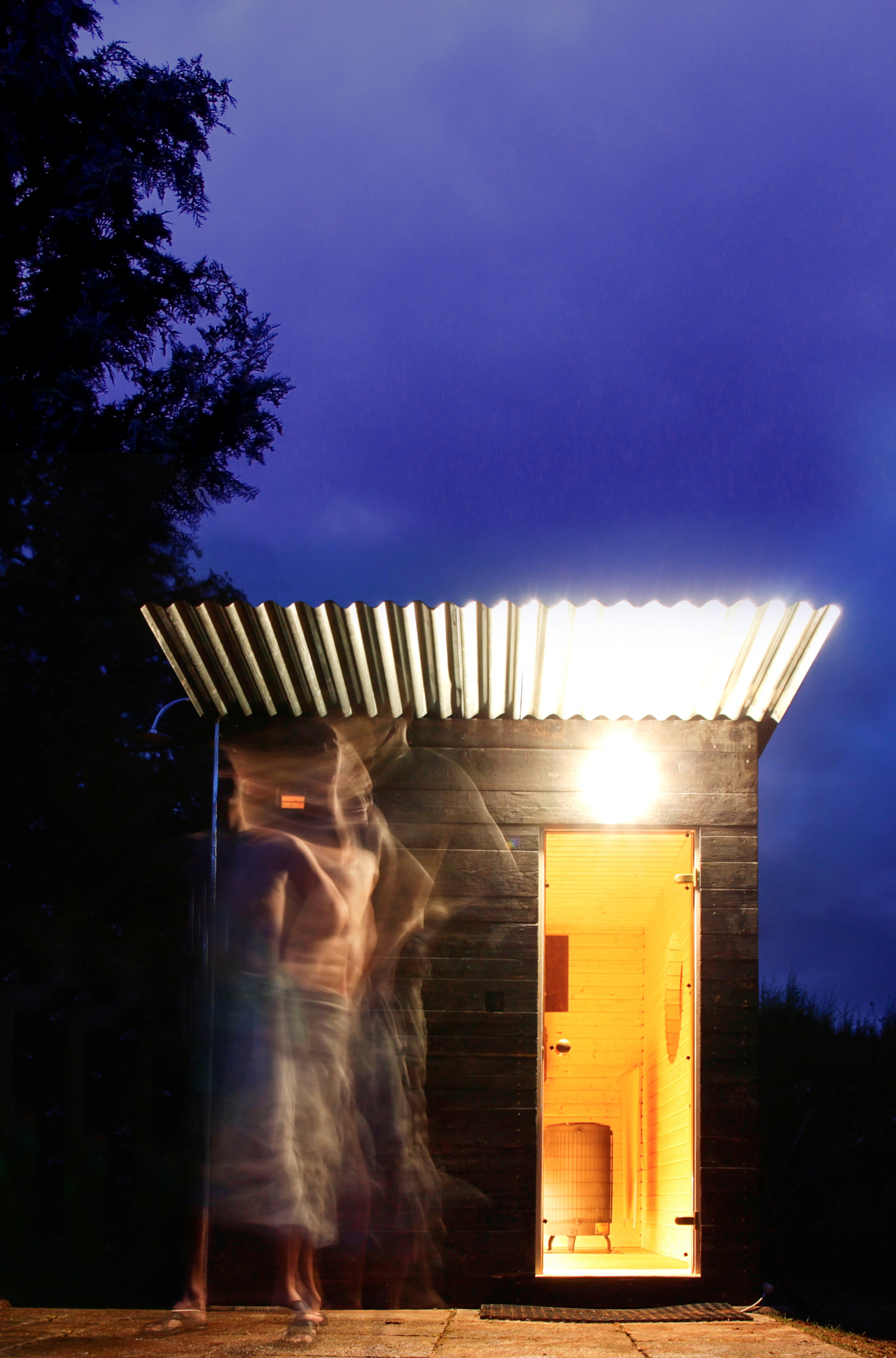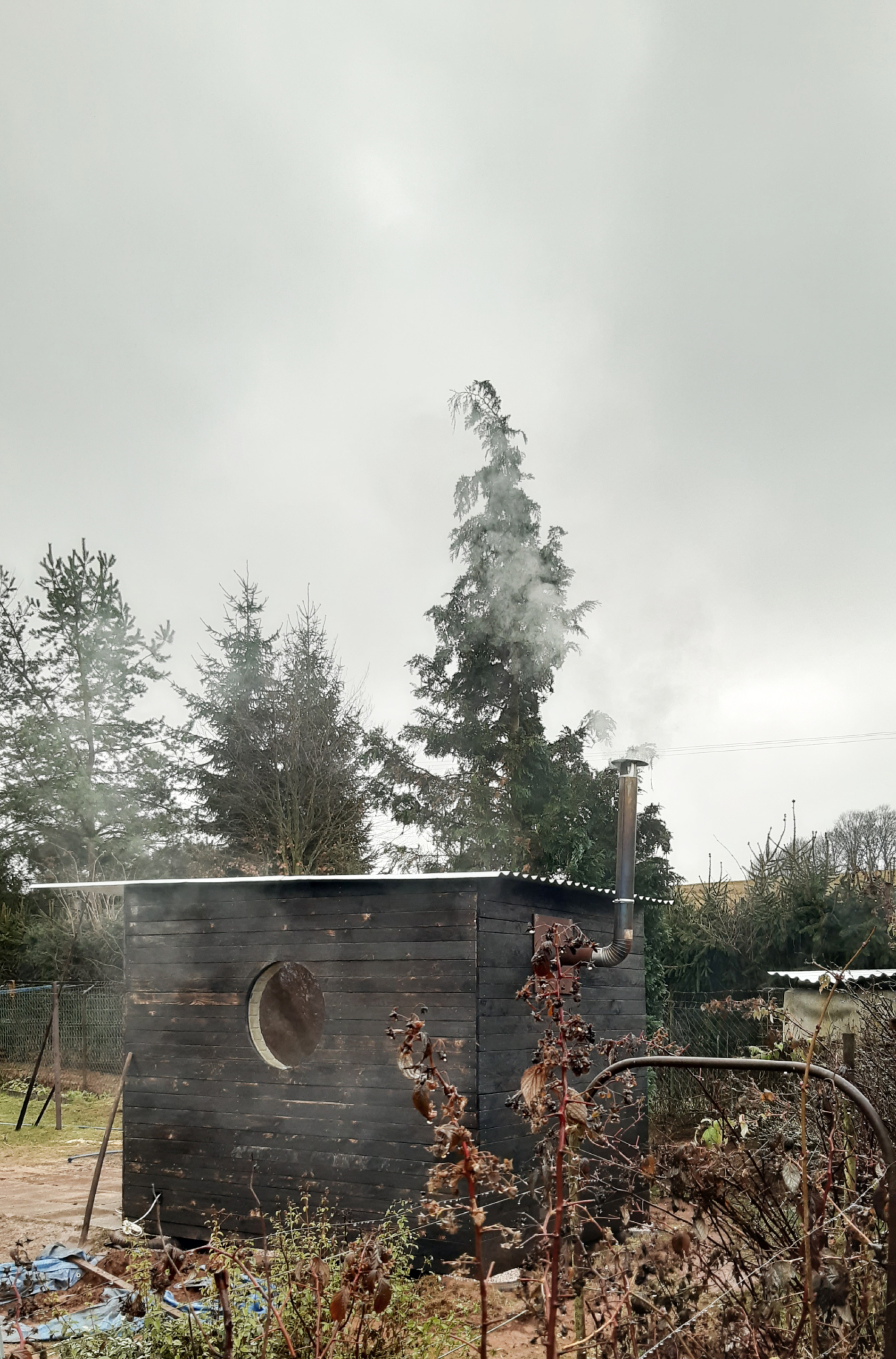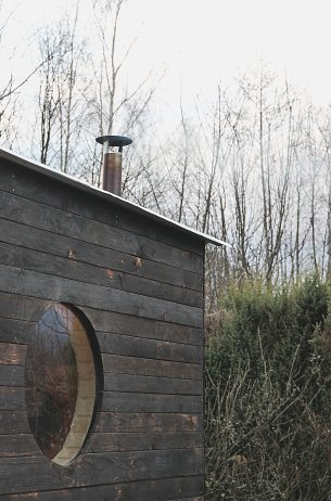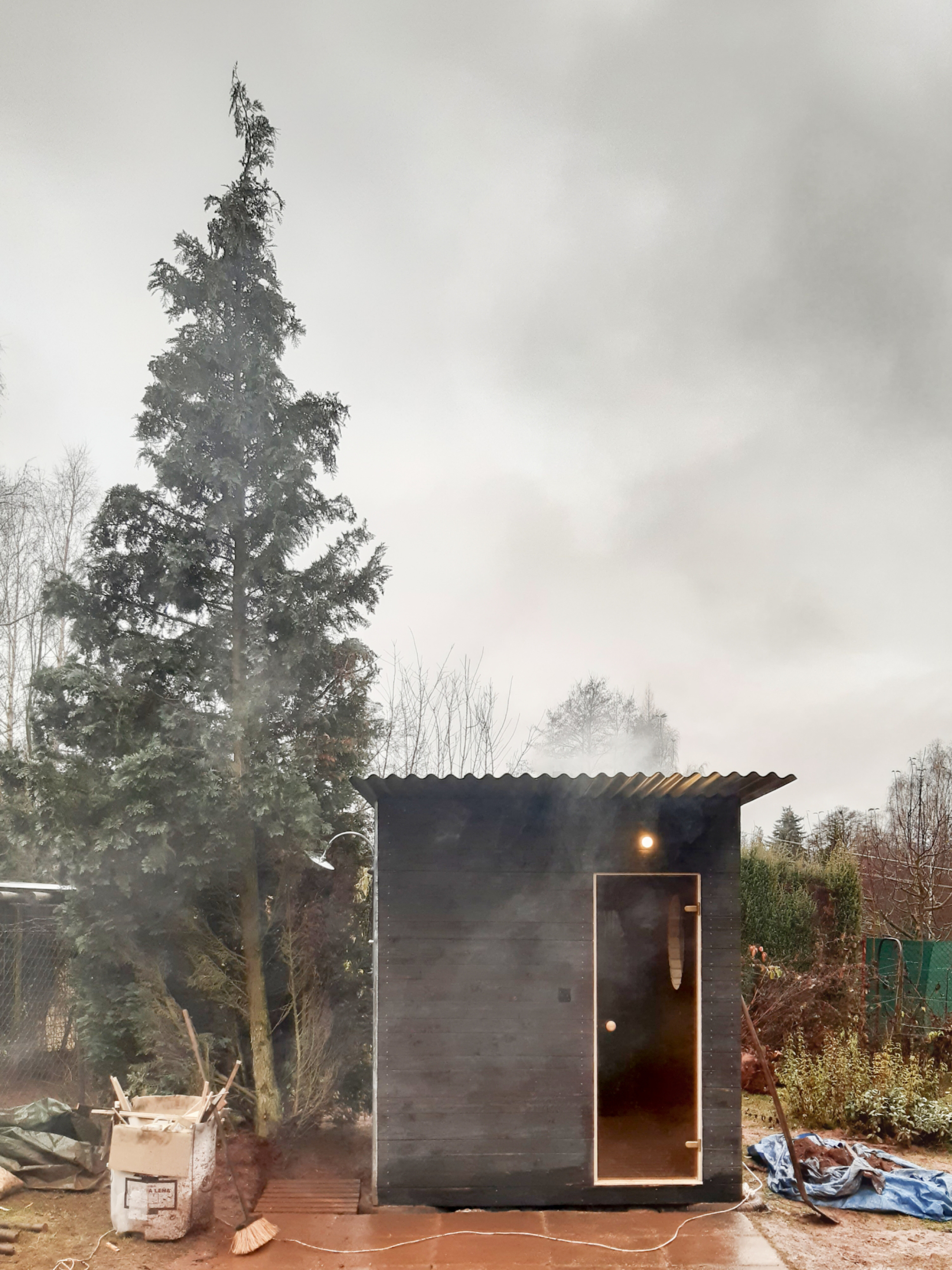Saunu jsem dělal pro svého otce. Byla to přirozená reakce na uzavření všech veřejných wellness kvůli coronaviru. Malý objekt stojící na zahradě, který svým vzhledem připomíná spíše kůlnu na nářadí o své skutečné funkci nenápadně napovídá drobným komínem a kruhovým oknem.