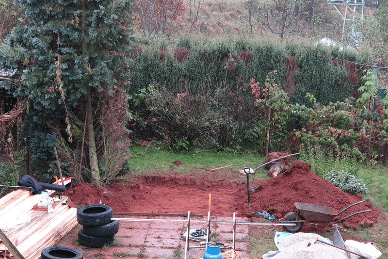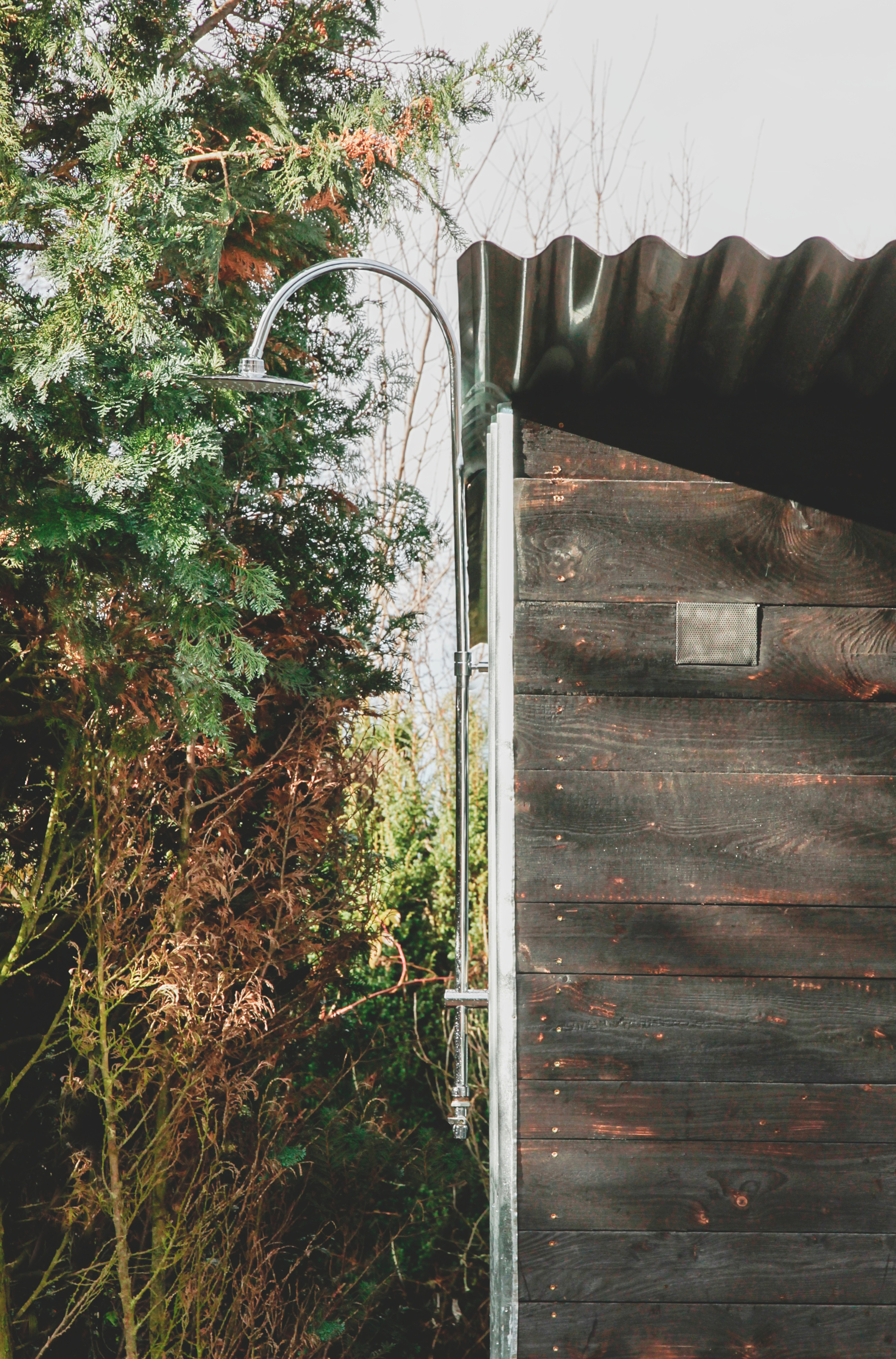 Opálené smrkové fošny tvoří vnější plášť. Zevnitř je sauna obložena měkkým, ale beze smolným severským smrkem. Stavba je založena na starých pneumatikách vymlácených štěrkem, které tvoří pevné a zároveň vodopropustné patky. Vlnitý plech je jednak použitý jako střešní krytina a je vykonzolován nad vchodem, dále je pak použitý jako ochrana dřevěné stěny u sprchy připevněné na levě straně sauny.