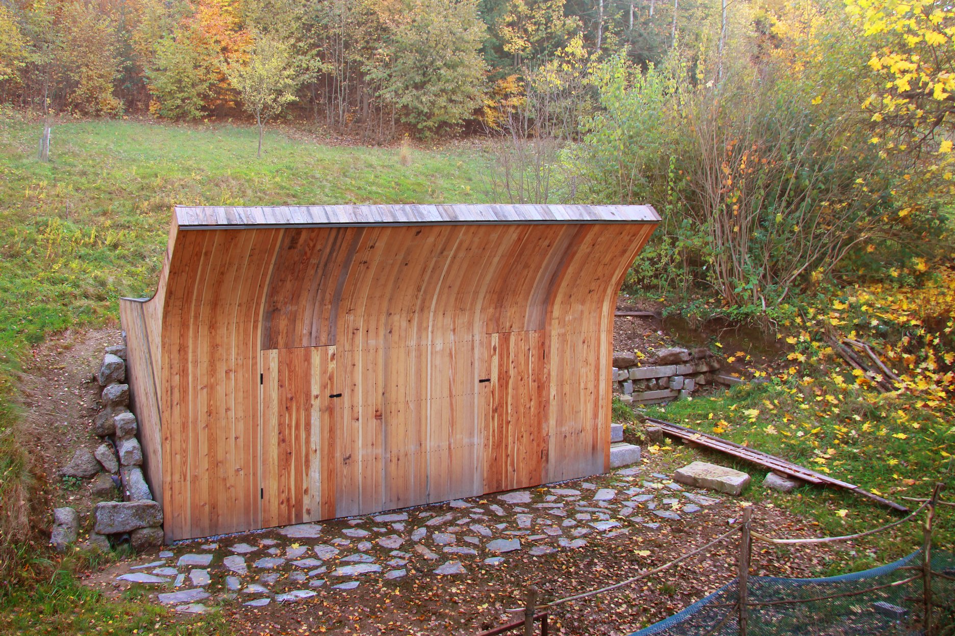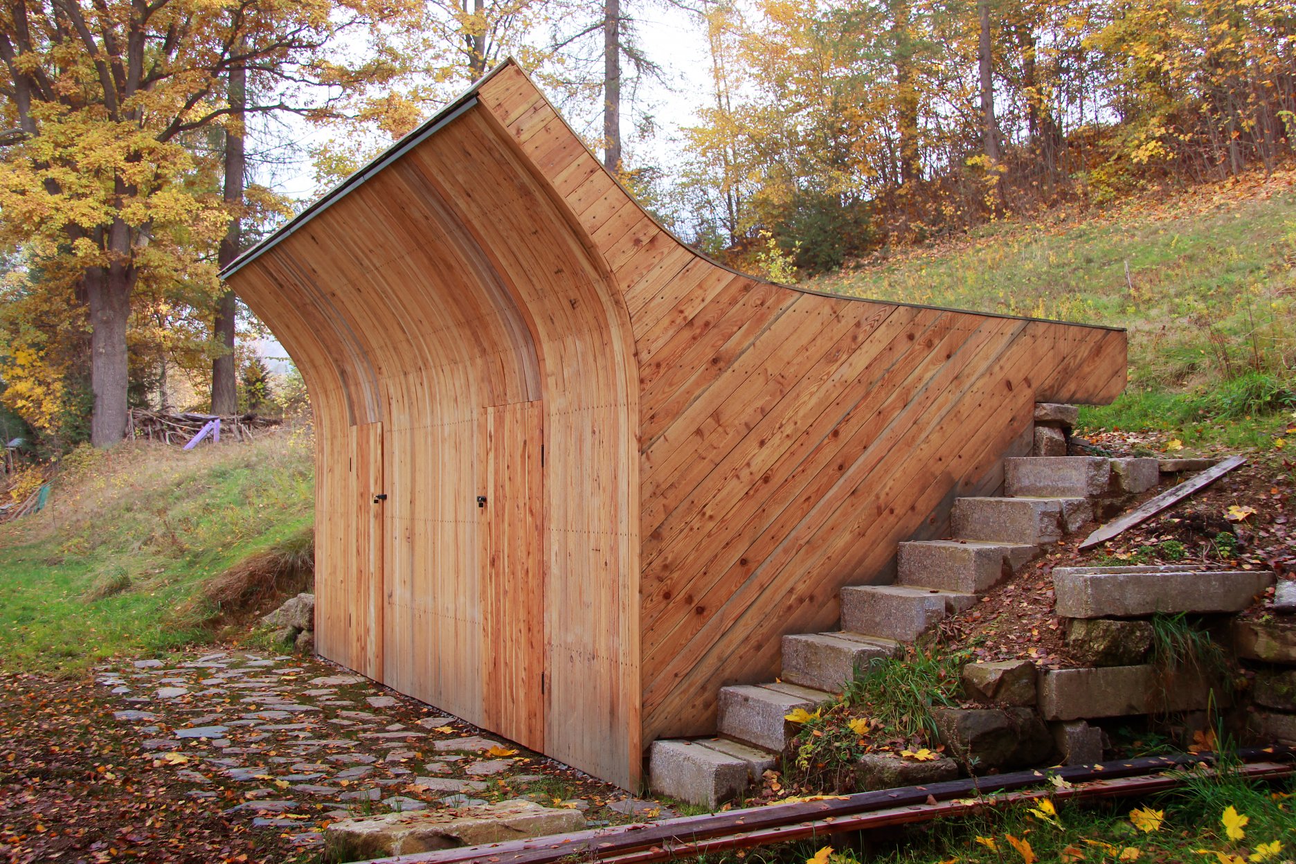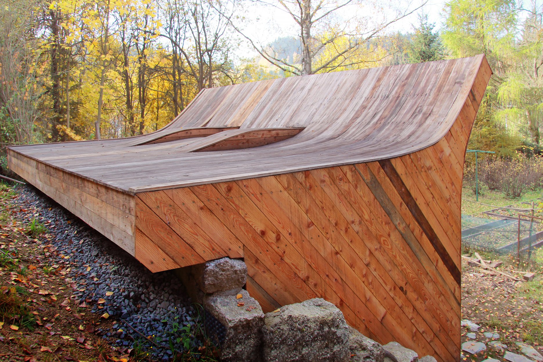 Záhradný domček so "slnečným kúpeľom" nie je len kôlňou na náradie a záhradný nábytok, ale aj miestom pre stretávanie sa rodiny a palubou na hranie. Jeho polohu určila zreteľná hrana terénneho zlomu, ktorý umožňuje prirodzené využitie strechy.