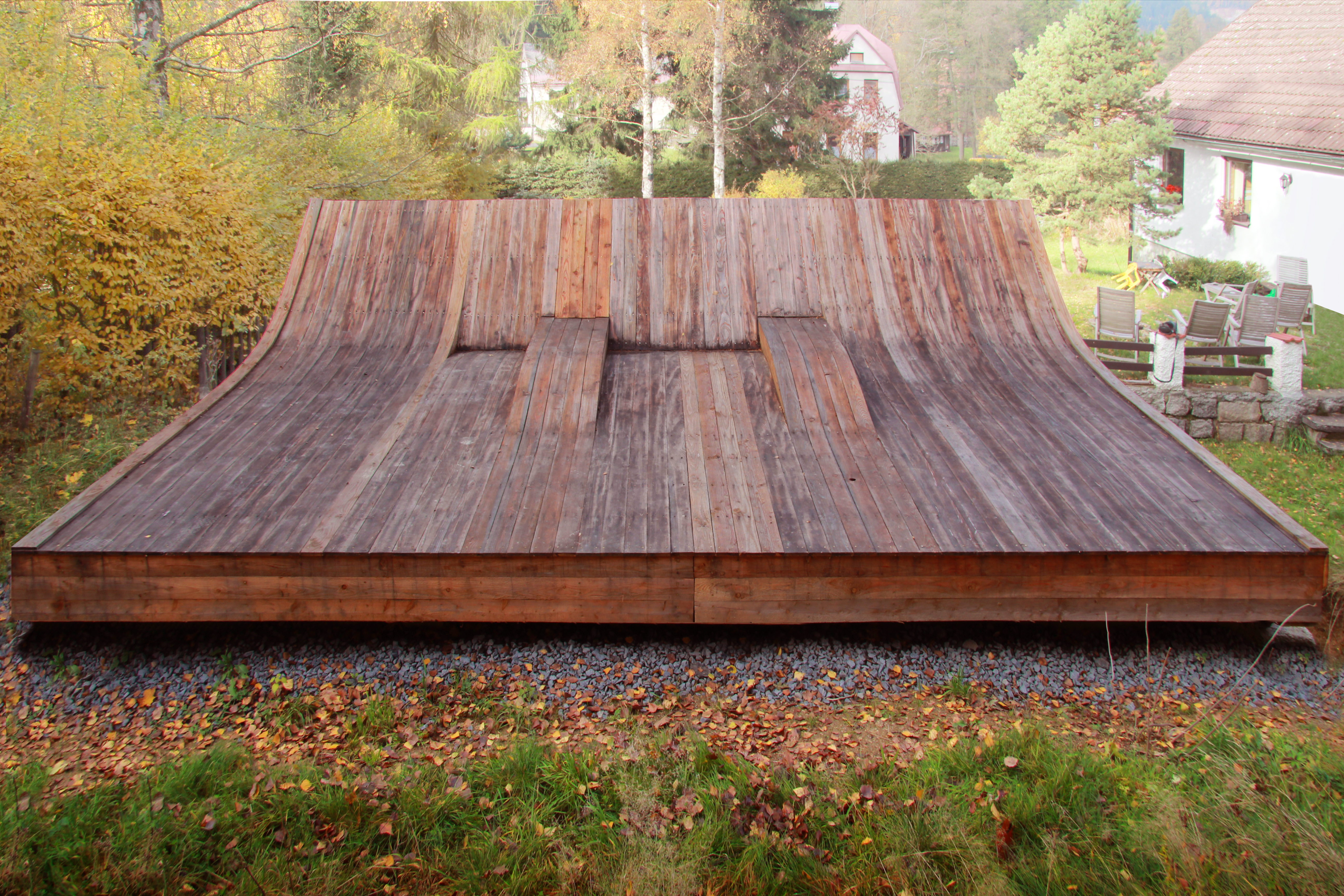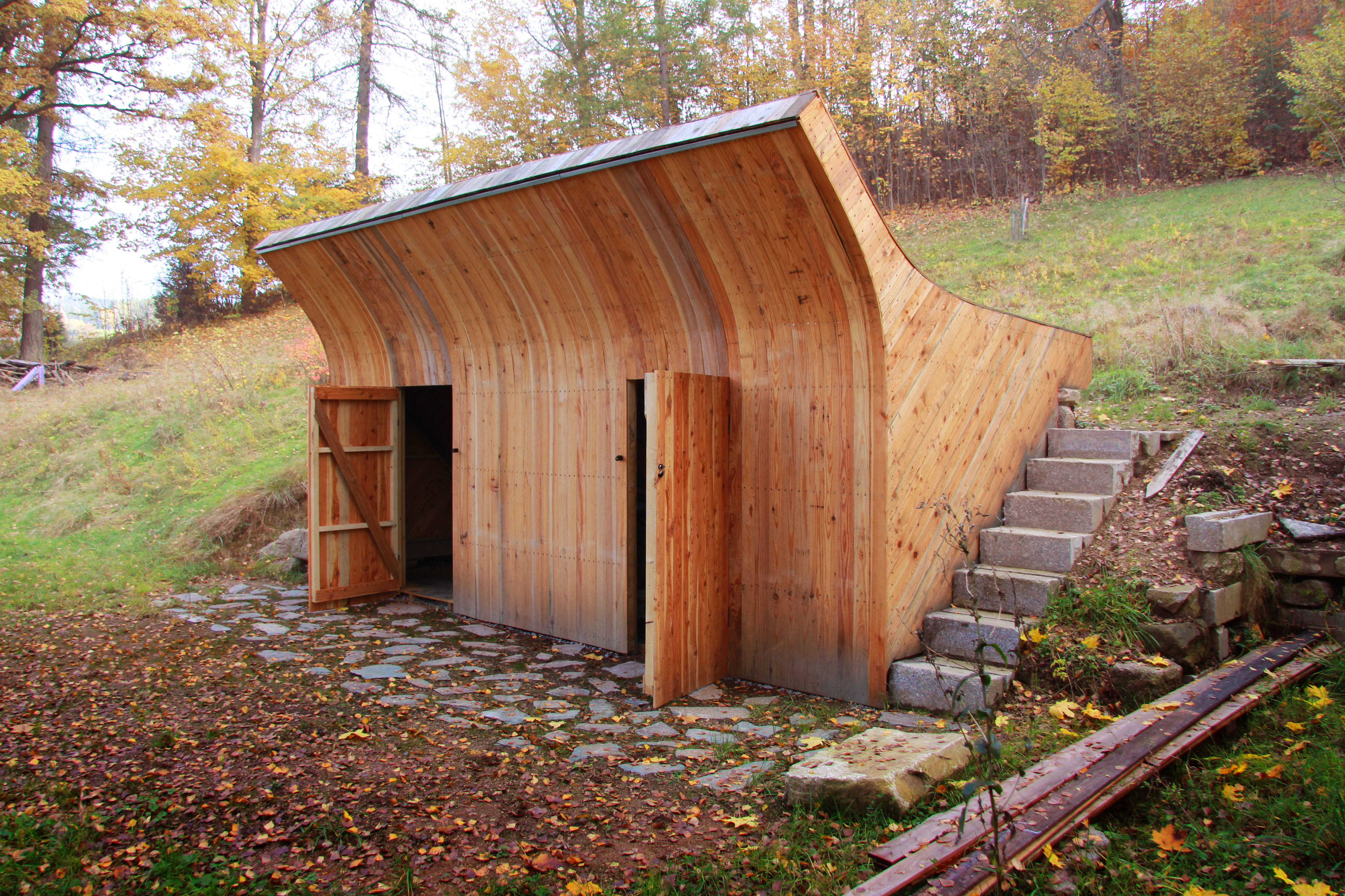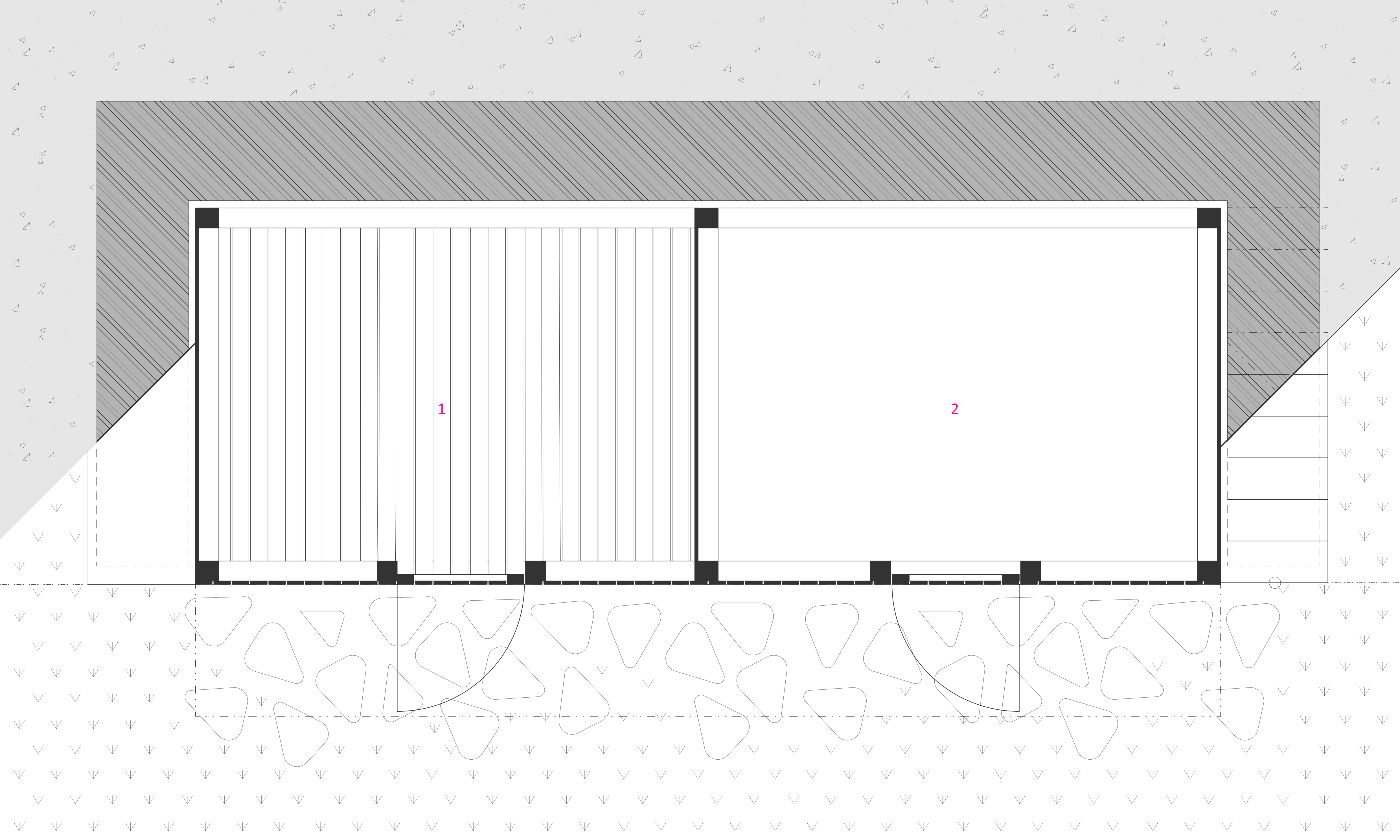Záhradný domček so "slnečným kúpeľom" nie je len kôlňou na náradie a záhradný nábytok, ale aj miestom pre stretávanie sa rodiny a palubou na hranie. Jeho polohu určila zreteľná hrana terénneho zlomu, ktorý umožňuje prirodzené využitie strechy.