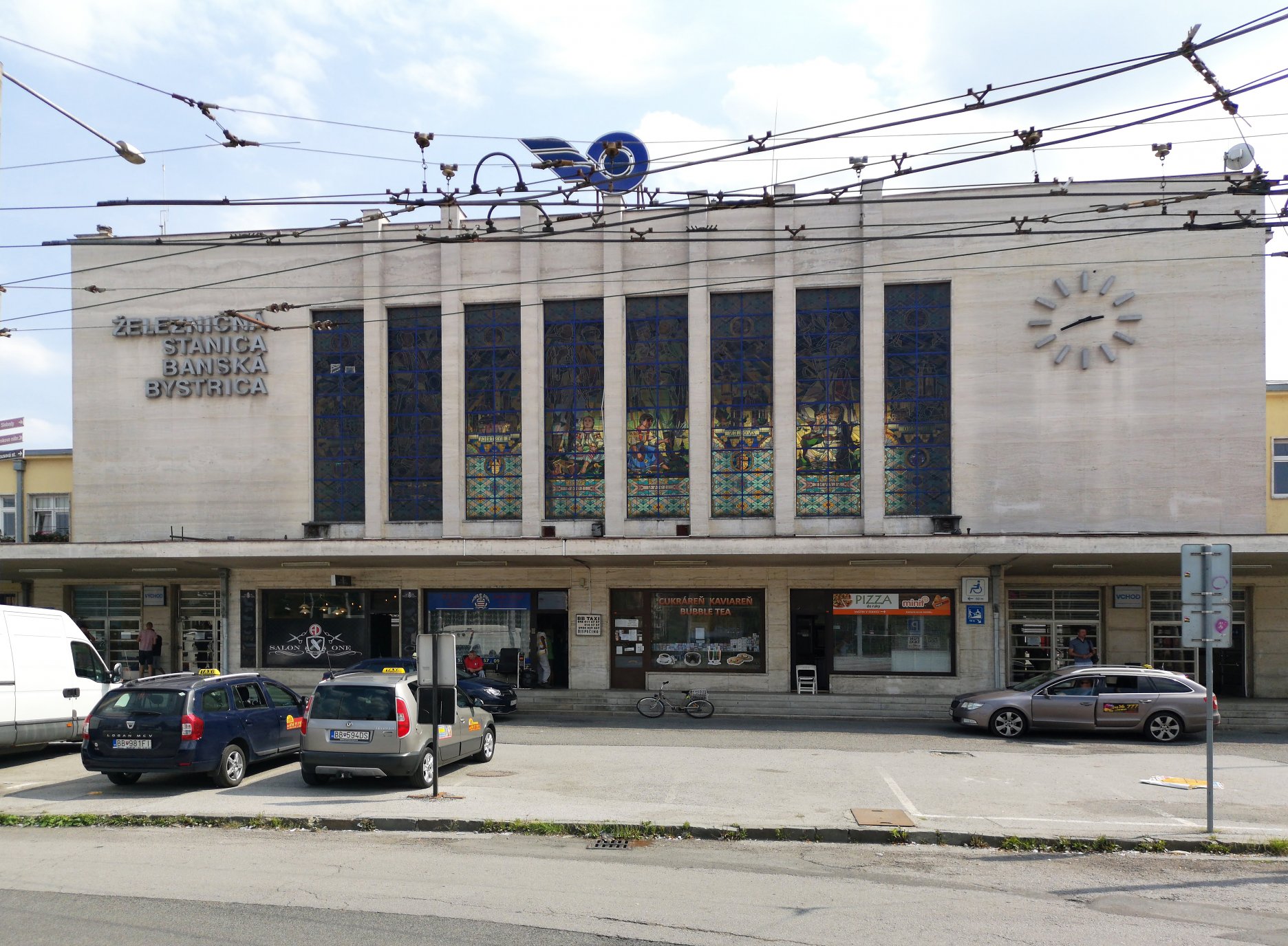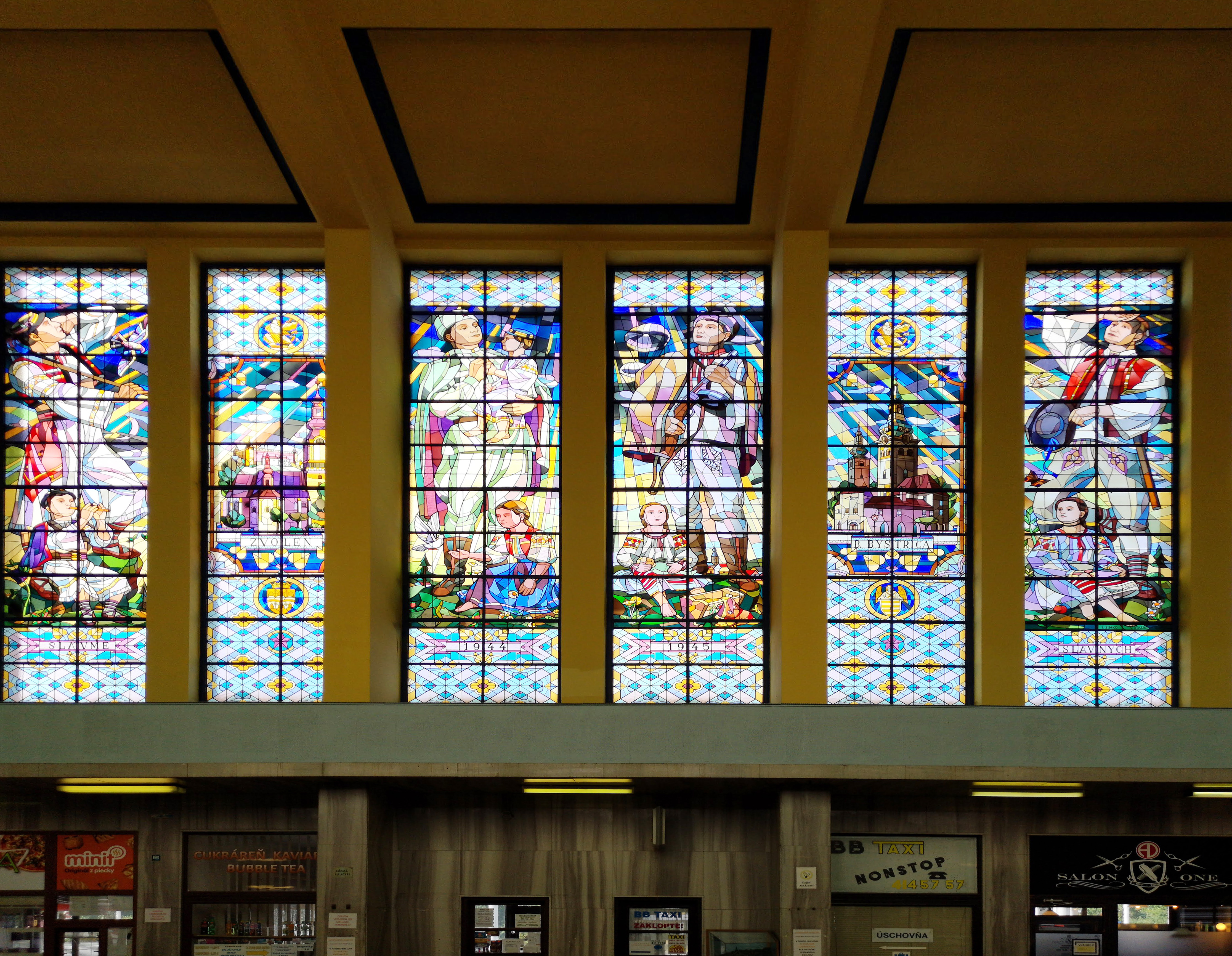 V interiéri odbavovacej haly železničnej stanice Banská Bystrica je kvôli jej presvetleniu umiestnených 8 vysokých okien. Pôvodne boli zasklené len reliéfnym sklom, aby do priestoru odbavovacej haly vnikalo rozptýlené svetlo. V roku 1959 pribudli umelecké vitráže s motívmi stredoslovenských miest - Banskej Bystrice, Banskej Štiavnice, Brezna a Zvolena, ktoré sú charakterizované ich historickými dominantami (4 vitráže) a figurálnymi motívmi s textom SLÁVME SLÁVNYCH 1944 - 1945 oslavujúce ukončenie 2. svetovej vojny, Slovenské národné povstanie, oslobodenie a slovenský ľud (4 vitráže). Celá kompozícia je navrhnutá a realizovaná v intenciách socialistického realizmu, ktorý bol v tom čase základnou formou všetkých druhov umenia. V prípade železničnej stanice v Banskej Bystrici však nepôsobí násilne a v súčasnosti už tvorí prirodzenú súčasť interiéru a exteriéru odbavovacej haly. Dielo realizovali spolu traja tvorcovia. Ich mená sa objavujú na spodnom okraji jedného z vitrážových okien.
