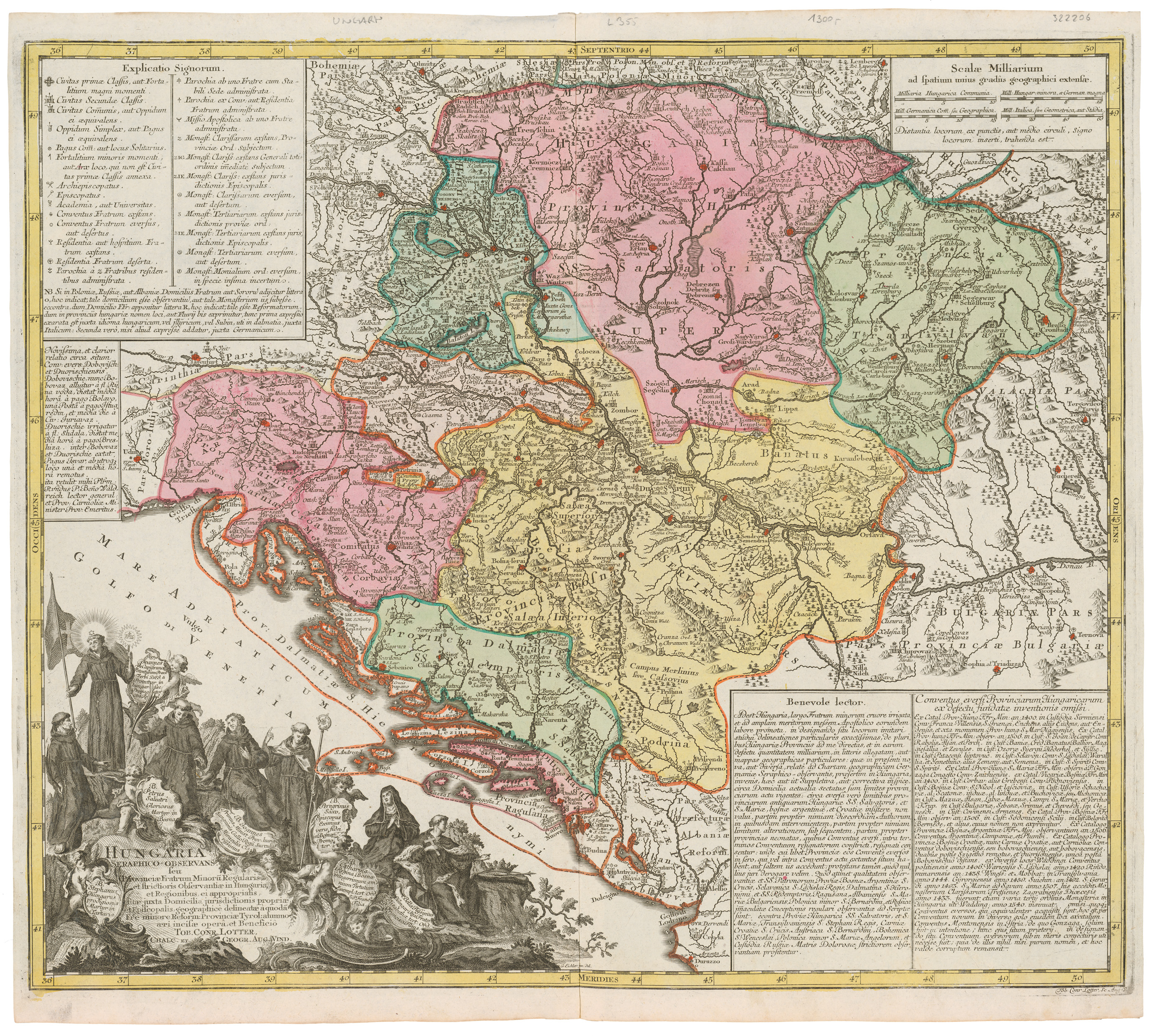 Tieto dva čiastočne kolorované listy predstavujú mapy rádových provincií františkánov a jezuitov, dvoch najvýznamnejších náboženských rádov pôsobiacich v ranom novoveku v historickom prostredí Slovenska. Mapa františkánskych provincií so štyrmi rozsiahlymi legendami je obohatená veľmi peknou figurálnou parergou s rádovými príslušníkmi rozvetvenej františkánskej rodiny.