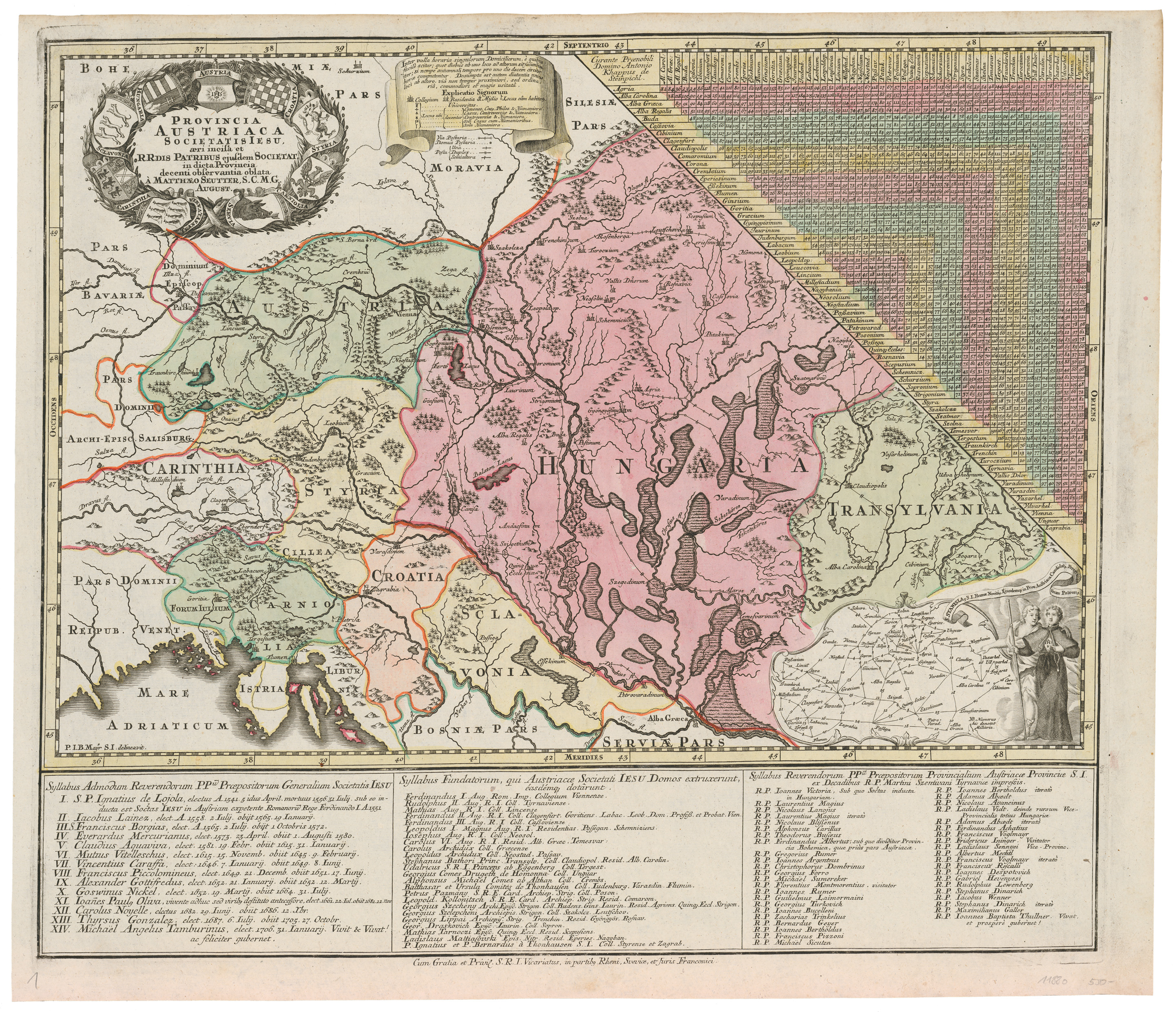 Mapa Rakúskej jezuitskej provincie zachytáva príslušnú časť rakúskych krajín a územie celého Uhorska, ktoré tvorilo jej súčasť. Mapa s farebným vyznačením jednotlivých krajín je okrem vysvetľujúcej legendy doplnená aj vzácnou tabuľkou vzdialeností medzi jednotlivými založeniami na celom rozsiahlom území Rakúskej provincie. Obe mapy veľkej kultúrnohistorickej hodnoty s mnohými vzácnymi údajmi vytvoril augsburský rytec Johann Gottfried Eichler, ktorý istý čas pobýval aj vo Viedni.