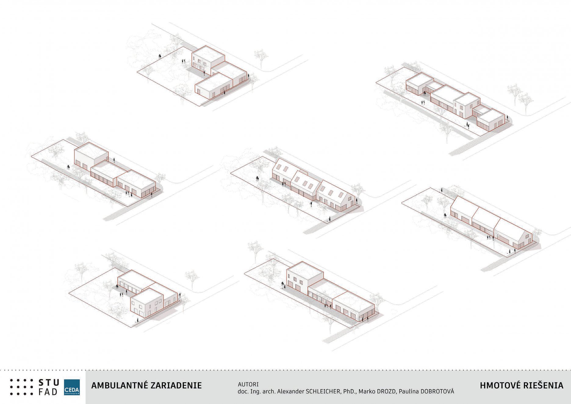 V katalógu štúdií “Ambulantné zariadenie, súbor architektonických štúdií na objekty poskytovania sociálnych služieb v rámci Plánu obnovy a odolnosti SR“, vypracovanom na pôde FAD STU bolo vo výsledku navrhnutých 8 typov štúdií (A - H).