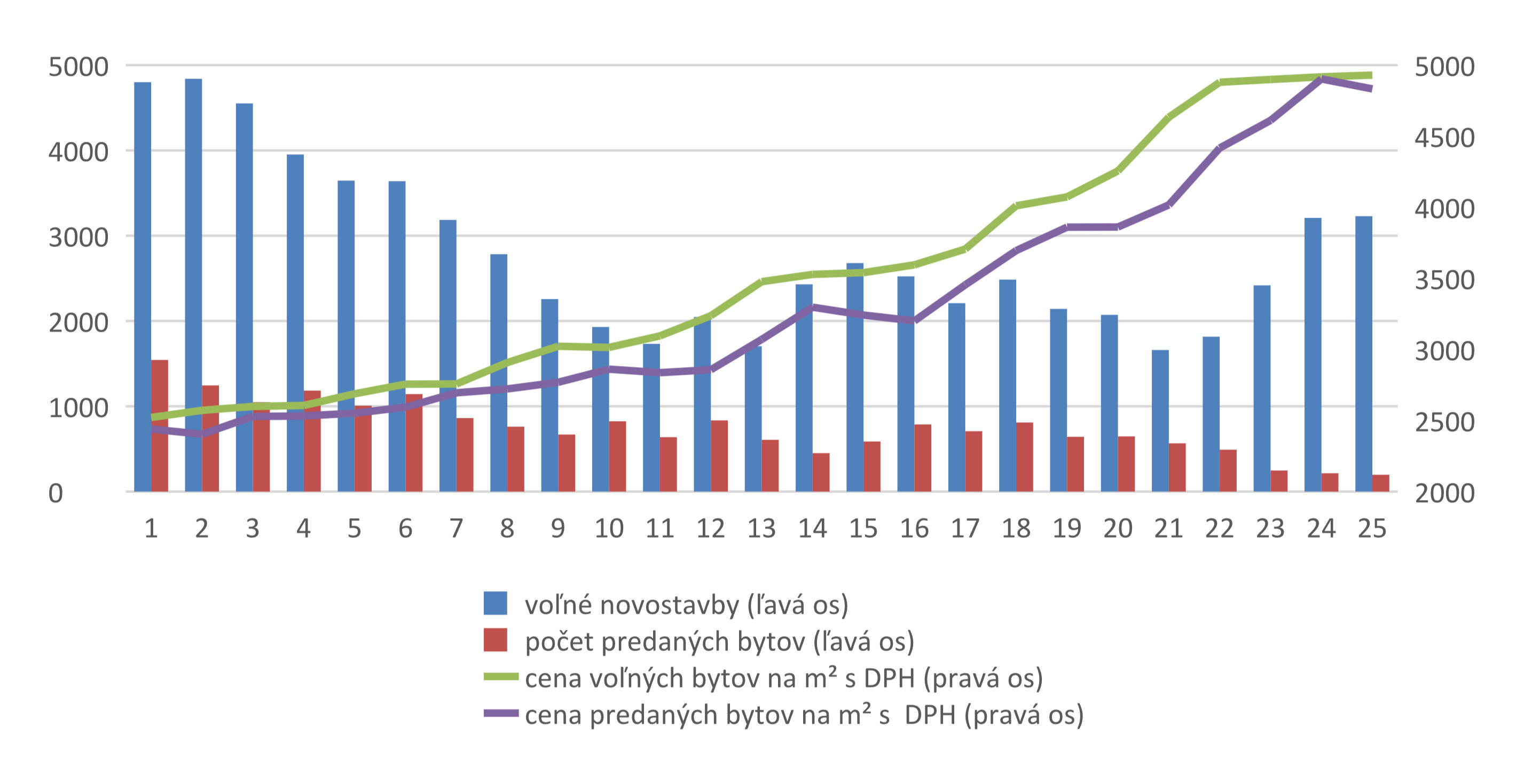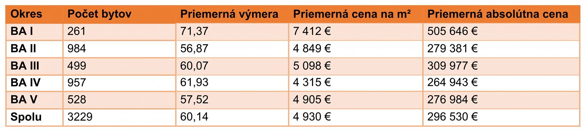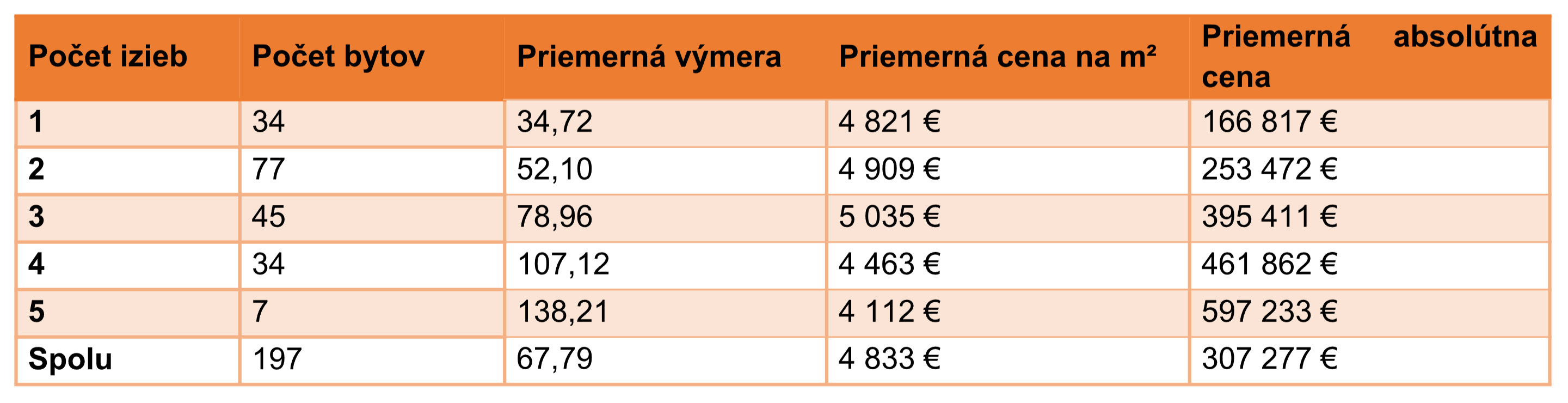 Priemerná absolútna cena predaných bytov dosiahla 307 tisíc € vrátane DPH, pričom priemerná rozloha predaných bytov predstavovala 68 m².