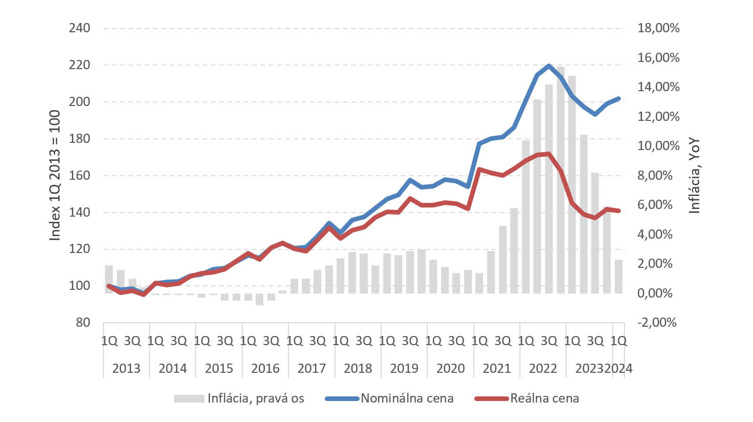 Ceny starších bytov v Bratislave začiatkom roka 2024 vzrástli v porovnaní s koncom roka 2023 o 1,4 %. Priemerná jednotková cena sa tým dostala na 3562 €/m2. V porovnaní so začiatkom roka 2023 sú ceny stále o 0,6 % nižšie. Na sekundárnom trhu starších nehnuteľností tak došlo k obratu po tom, ako od druhej polovice roka 2022 dochádzalo ku kontinuálnemu znižovaniu cien. Tie zo svojho vrcholu v 3. kvartáli 2022 klesli až o 12 % a koncom roka 2023 sa situácia začala už stabilizovať.