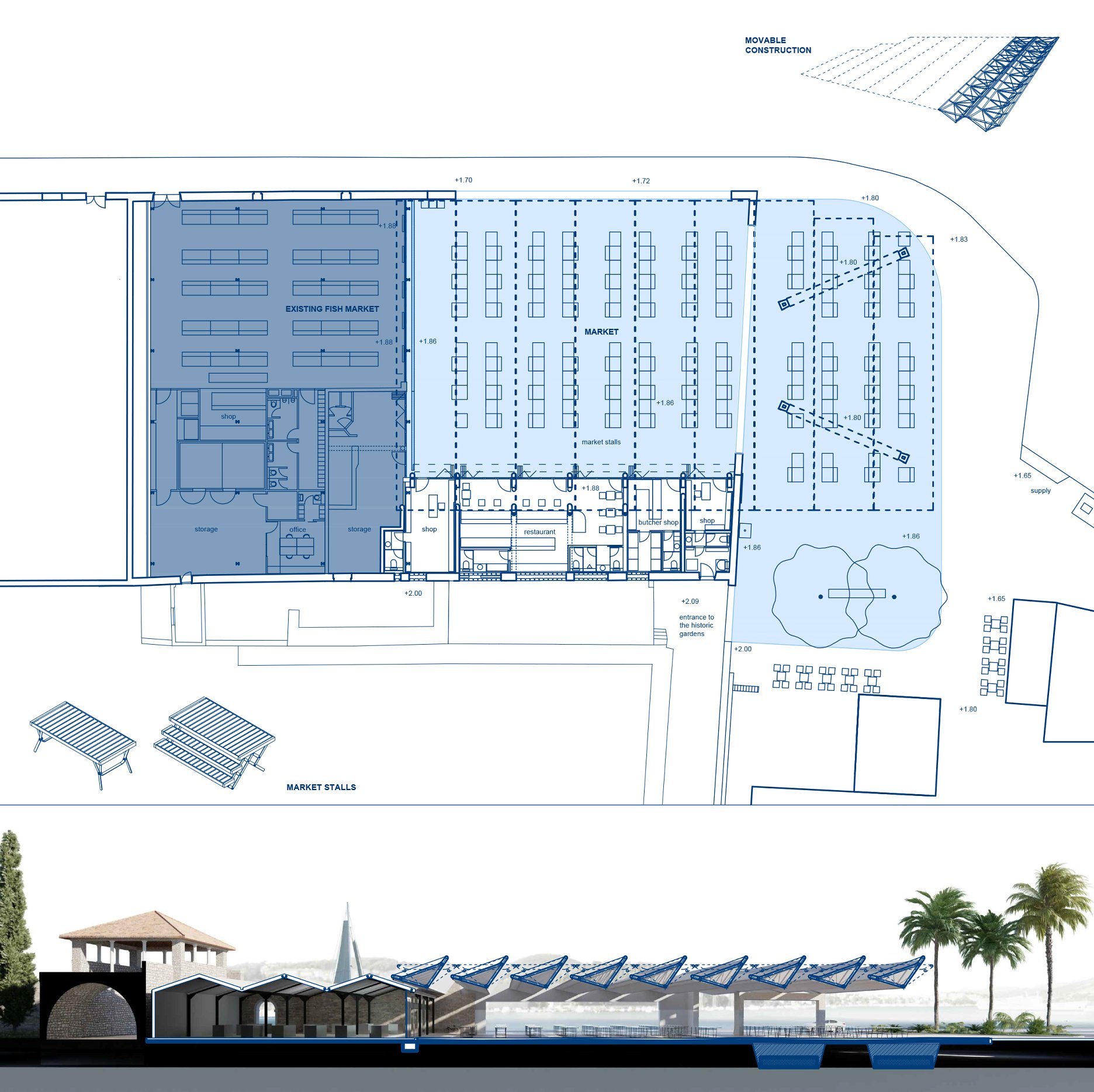 Jadrom projektu je prekrytie trhoviska, ktoré muselo splniť viacero podmienok: nízka výška kvôli výhľadom na palác, dostatok vzduchu a denného svetla, minimum stĺpov pre flexibilitu dispozície stánkov, obmedzenie možností dosadania vtáctva nad potravinami a schopnosť prekryť priestor „vnútri aj mimo“ palácového perimetra. Riešenie tvorí sústava otočných oceľových priehradových nosníkov s trojuholníkovým prierezom, ovládaných hydraulikou.