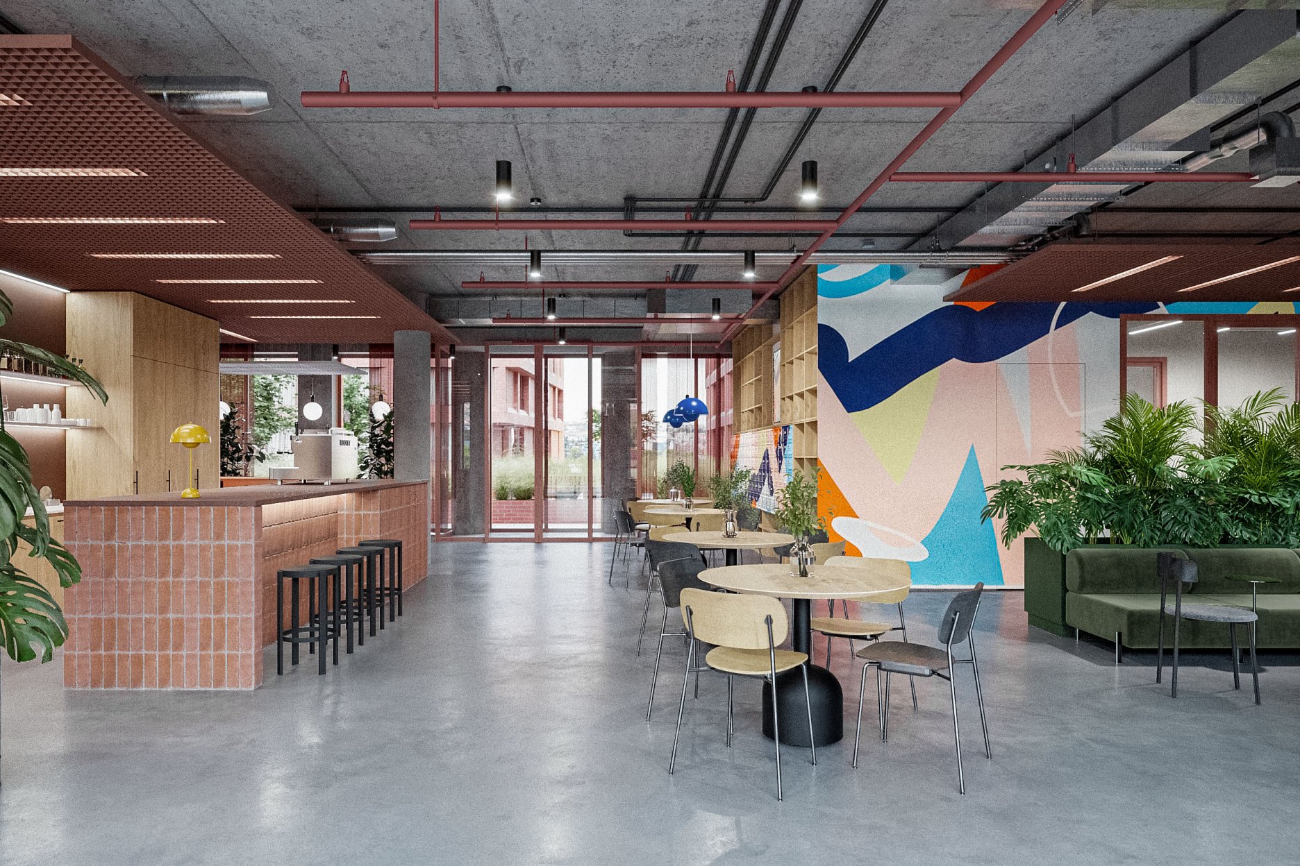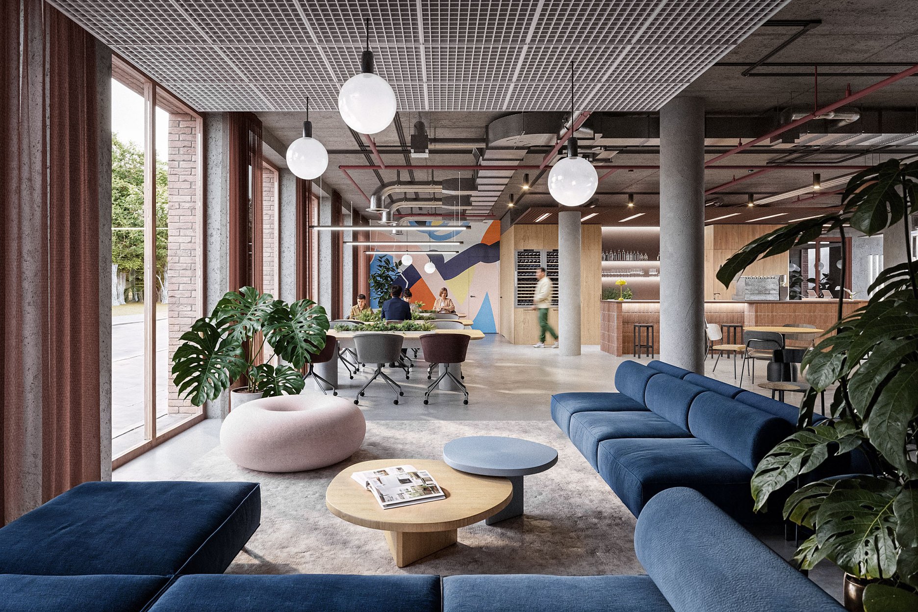 Vstupná hala plní funkciu recepcie, kaviarne, coworku a lounge zóny. Areál je navrhnutý ako miesto s verejne prístupnými službami.