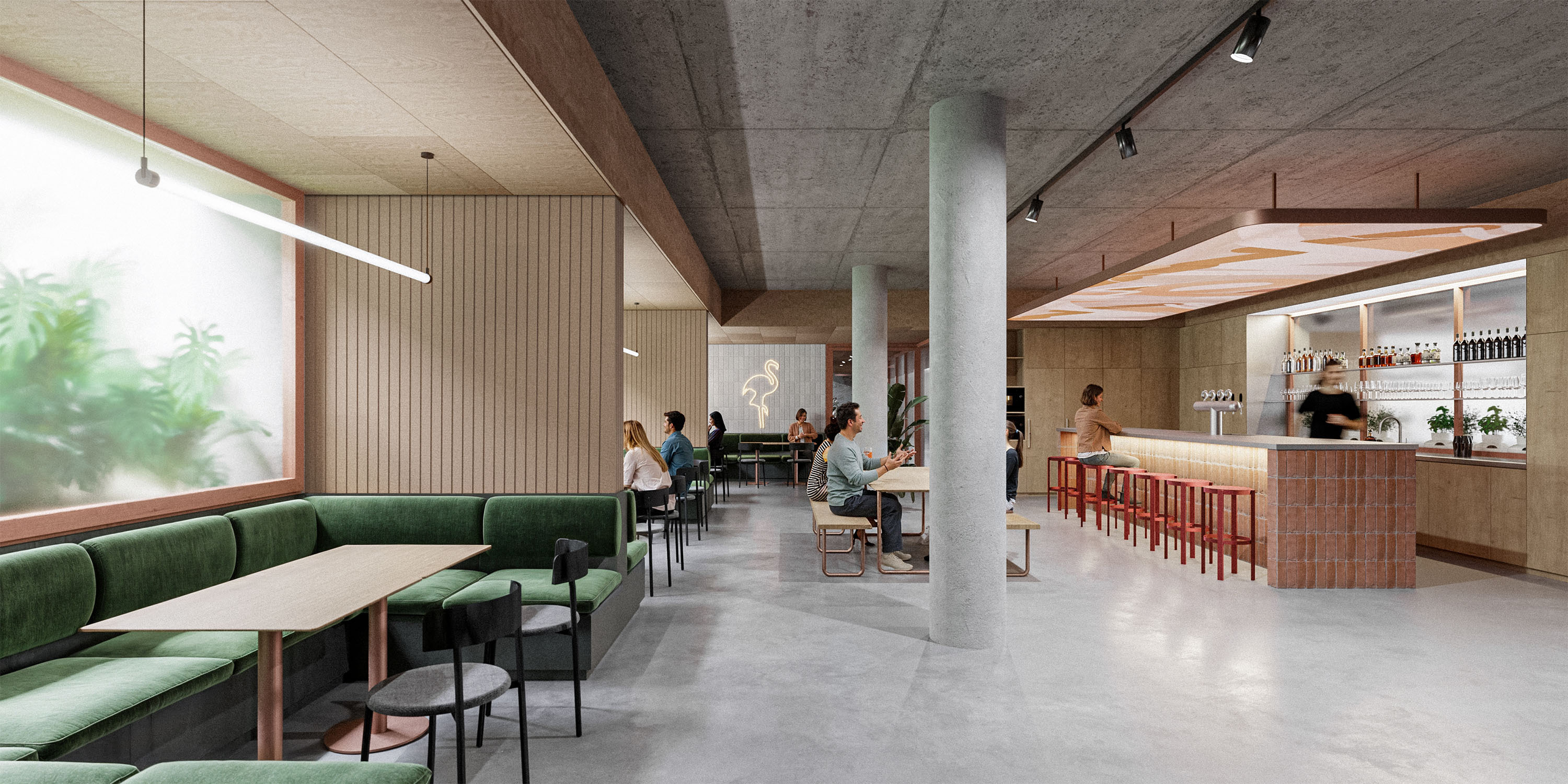 Architektonický návrh spája individuálne ubytovanie so spoločnými priestormi. K dispozícii je viacero typológií izieb – od jednolôžkových až po trojlôžkové bunky s rôznou mierou súkromia. Spoločné priestory zahŕňajú študovne/coworking, komunitné kuchyne, kino, práčovňu, lounge zónu, fitness a gastro prevádzku. Súkromné izby poskytujú zázemie na odpočinok a prácu, spoločné priestory podporujú komunitné aktivity.