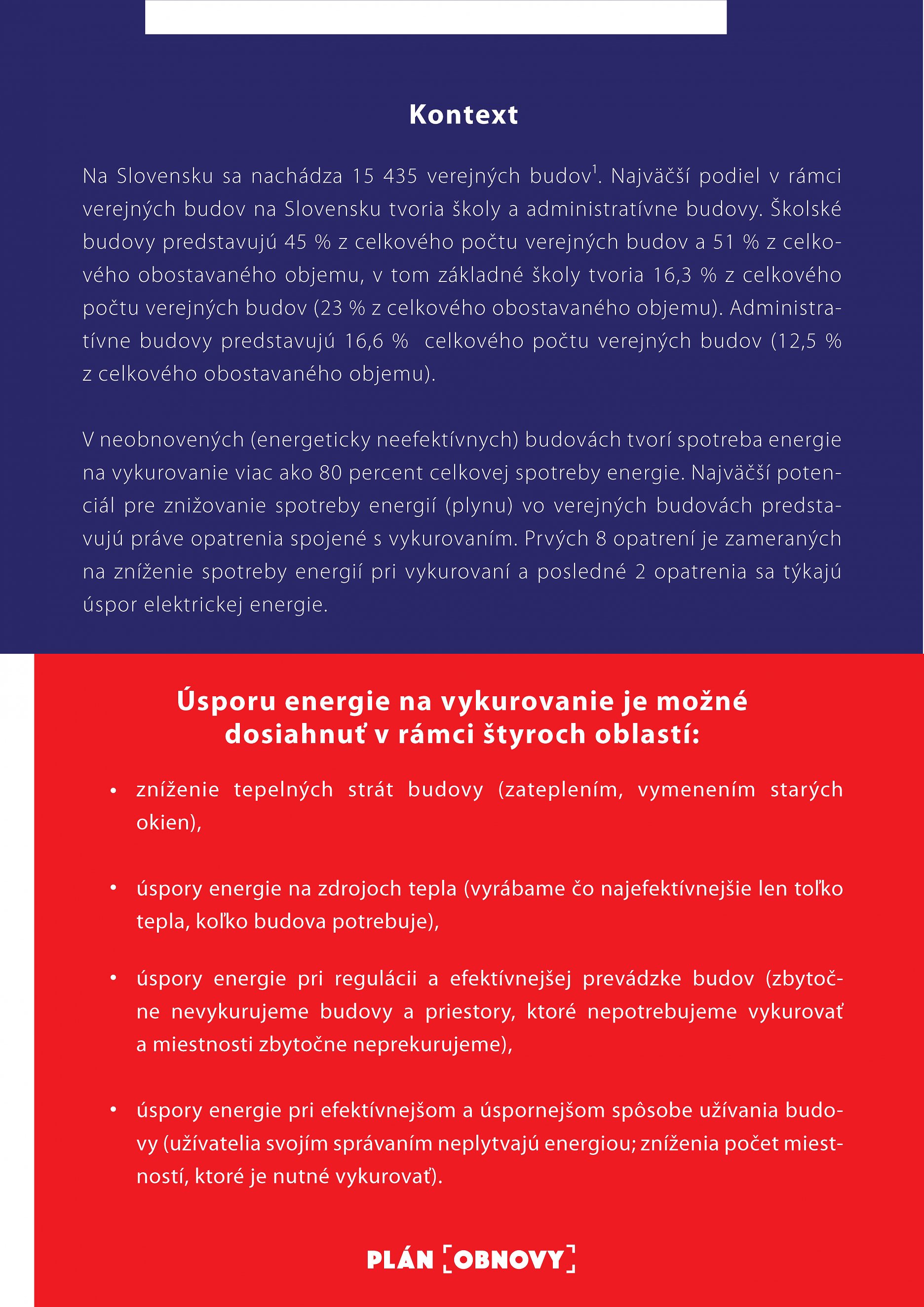 Na Slovensku na nachádza viac než 15 000 verejných budov, ktoré tvoria hlavne školy a administratívne budovy. V neobnovených, energeticky neefektívnych budovách tvorí vykurovanie viac než 80% spotreby energie. Preto najväčší potenciál pre znižovanie spotreby energií vo verejných budovách predstavujú práve opatrenia spojené s vykurovaním.