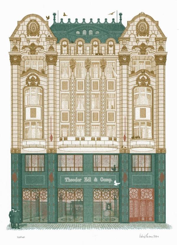 Návrh na novostavbu vypracoval budapeštiansky architekt Aladár Körösi ako moderný bankový palác v slohu nastupujúcej imperiálnej Rakúsko – Uhorskej secesie, pre spoločnosť THEODOR EDL & COMP. Súdobá „nostalgická““ autorská grafika z roku 2019 Ondreja Važana, pôsobí veľmi presvedčivo, ba až ako verná kópia pôvodnej autorskej dokumentácie, je optimálne čitateľné funkčné, materiálové, tvaroslovné a farebné riešenie hlavného priečelia. Dvojpodlažný, štvorosový parter prislúcha funkcii peňažného ústavu – na úrovni 1. NP hala likvidatúry (so zariadením kaviarne interiéru po roku 1996, bez pôvodného parapetu okenných otvorov kaviarne) a 2. NP administratíva banky. Materiálové riešenie vyjadruje bohatstvo a moc peňazí v použití reprezentačného a i na túto dobu drahého obkladu zo zeleného granitu a mosadzných – tombakových detailov na kotevných skrutkách, osvetlovacích plynových lucerien, dvojice vlajkosláv na štukovej omietka 3. NP. Vstupy do banky a i do nadzemných podlaží sú združené v asymetrickej polohe, tvarovo i materiálovo jednotné – mosadz, meď. Je vidno rozdiel vo výplní otvorov obvodového plášťa parteru a nadzemných obytných podlaží. Leštený zelený granit je remeselne opracovaný pemrlovaním – štokovaním vo zvislých pilieroch dvojicou prerušovaného pásu a vo výraznom horizontálnom deliacom páse sú tri bordúry neprerušovaného pemrlovaného pásu v tvare horizontálnych obdĺžnikov. Stredný obdĺžnik, cez dve osové polia, je nositeľom identifikačného reklamného nápisu novostavby. Súčasťou pemrlovaného nápisu je vpravo dolu logo bielej holubice, pravdepodobne plastické a materiálovo cielene odlíšené. Odkaz na predchádzajúce staré pomenovanie pôvodného objektu. Materiálové riešenie strešnej krytiny je farebne zelený oxidovaný medený plech. Zrealizované priečelie do Hlavého námestia veľkosťou stavebného objemu, tvarovým, ornamentálnym, farebným, materiálovým a výtvarným riešením je nielen vyjadrením funkcie bohatstva a moci peňažného ústavu ale je i festivalom majstrovstva bravúrne zvládnutého každého stavebného remeselného detailu nastupujúceho ctižiadostivého slohu secesie. V každom prípade je tento objekt zaradený na najvyššiu priečku stavieb reprezentujúcich umelecký sloh secesie v našom meste.