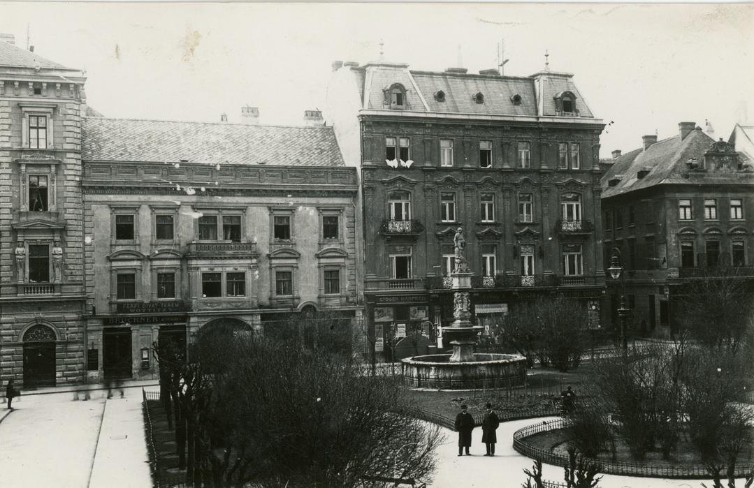 V roku 1885 zakladá Theodor Edl na svojom objekte súkromný peňažný ústav – AZ ADRIAI BISTOSItÓ TARTASZÁG - ADRIATICKÁ POISŤOVACIA SPOLOČNOSŤ – nápis na rizalite centrálneho vstupu do dvora. Súbežne je v priestoroch parteru predajňa odevného a metrového textilu s texilnou galantériou známou v meste pod názvom „ U bielej holubice“. Námestie nemá parkovú úpravu, Vpravo na rohu mobilná zeleň CAFÉ MEIER. Zámer postaviť novostavbu nového peňažného ústavu spoločnosti THEODOR EDL pochádza zrejme z obdobia hlboko pred rokom 1898, kedy sa Uhorská eskomptná a zmenárenská banka stala majetkom pôvodného objektu..
