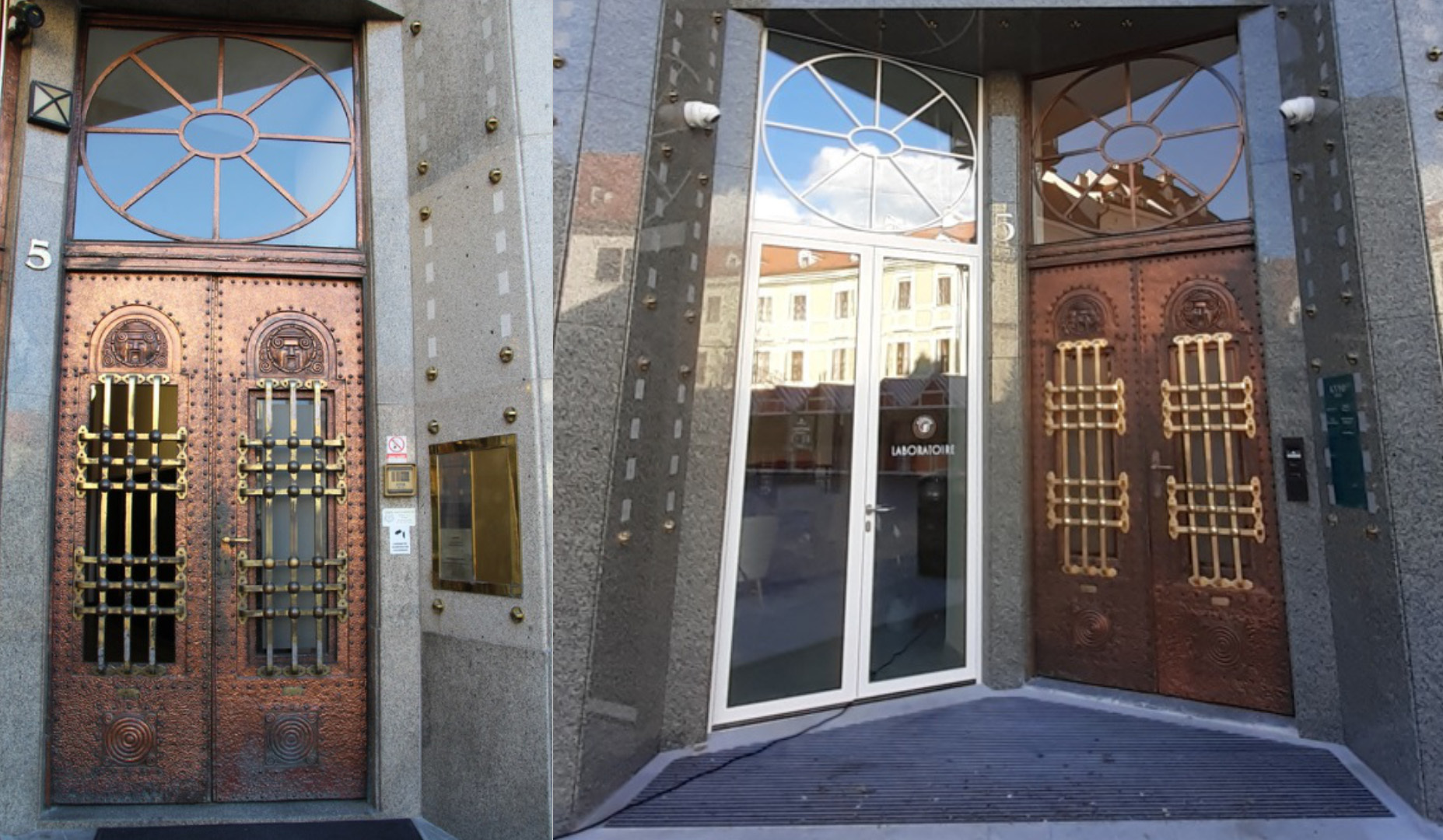 Na novom vstupe sú bravúrne zvládnutie detaily kamerového systému, tablo domového vrátnika, informačný systém a čistiaca zóna. Nadpražie vstupu do kaviarne je mimo proporcií - hrúbka lúčov i veľkosť vnútornej elipsy. Mreža pôvodného vstupu je z mosadze s prirodzenou patinou. Mreža nového vstupu je síce z mosadze, ale pozlátená lístkovým 24 karátovým zlatom. Mreža javí ani nie po ročnej prevádzke stratu zlata. Drahý materiál použitý na nevhodnom mieste. Neodvážim sa navrhovať riešenie pri reklamácii.