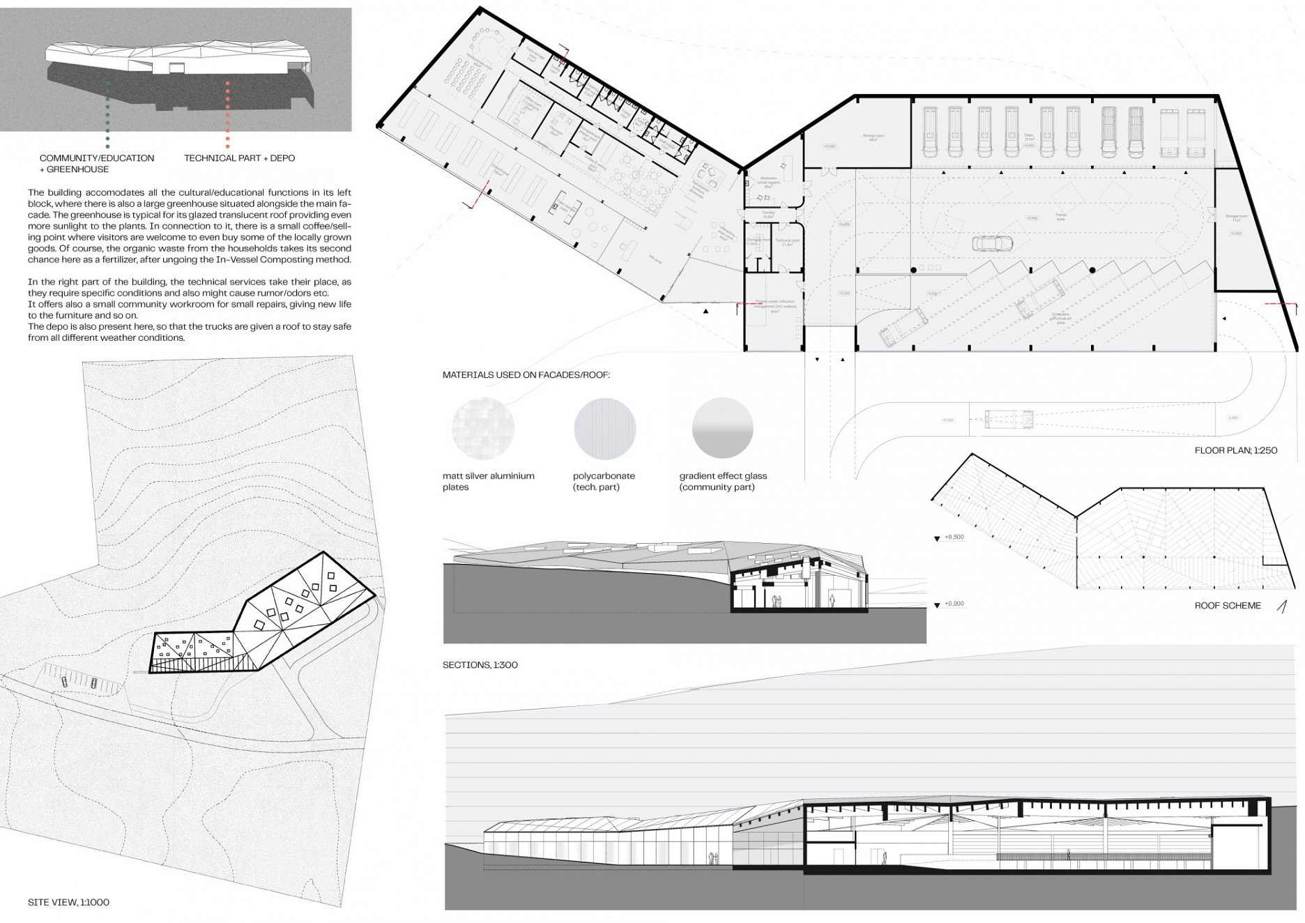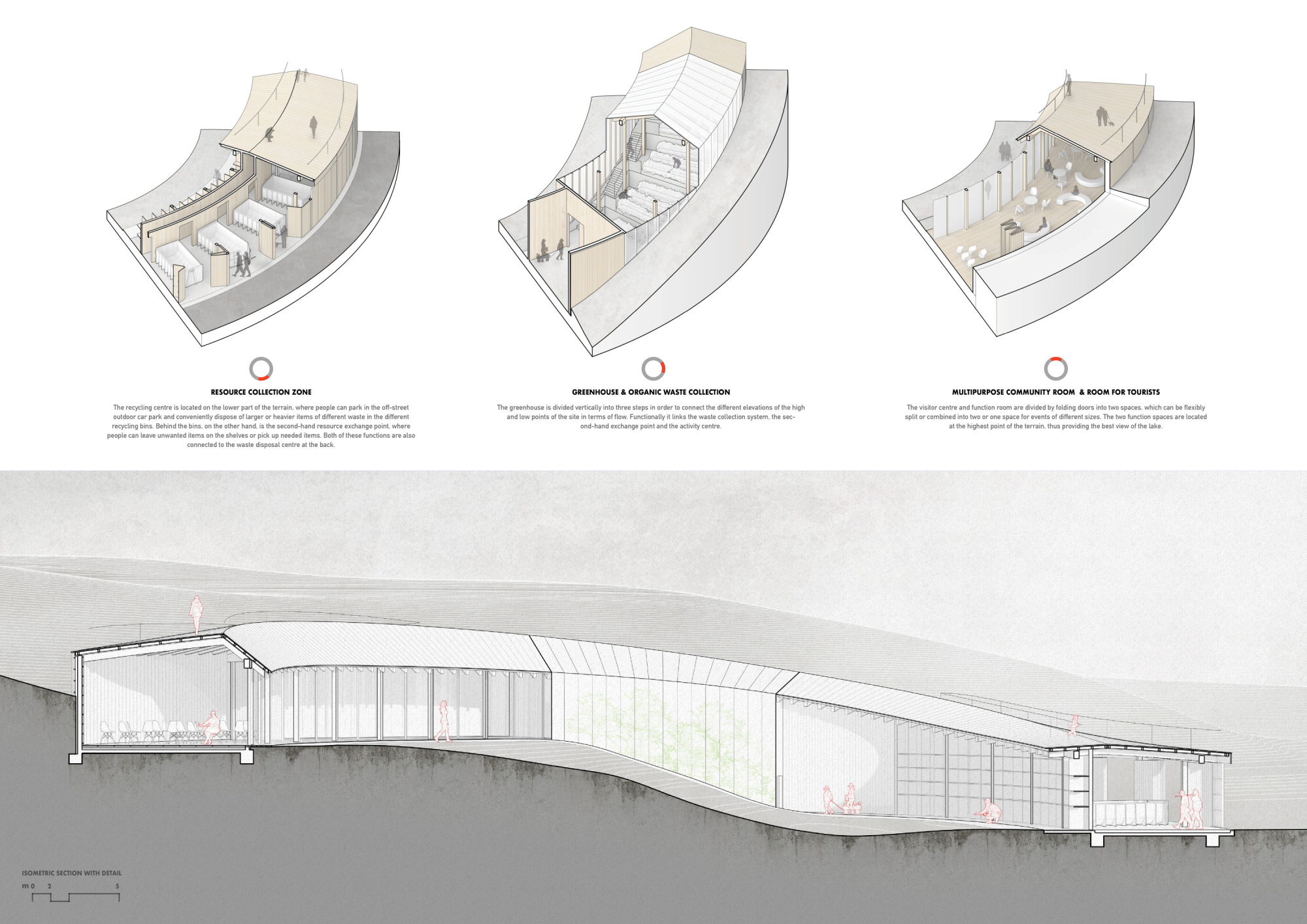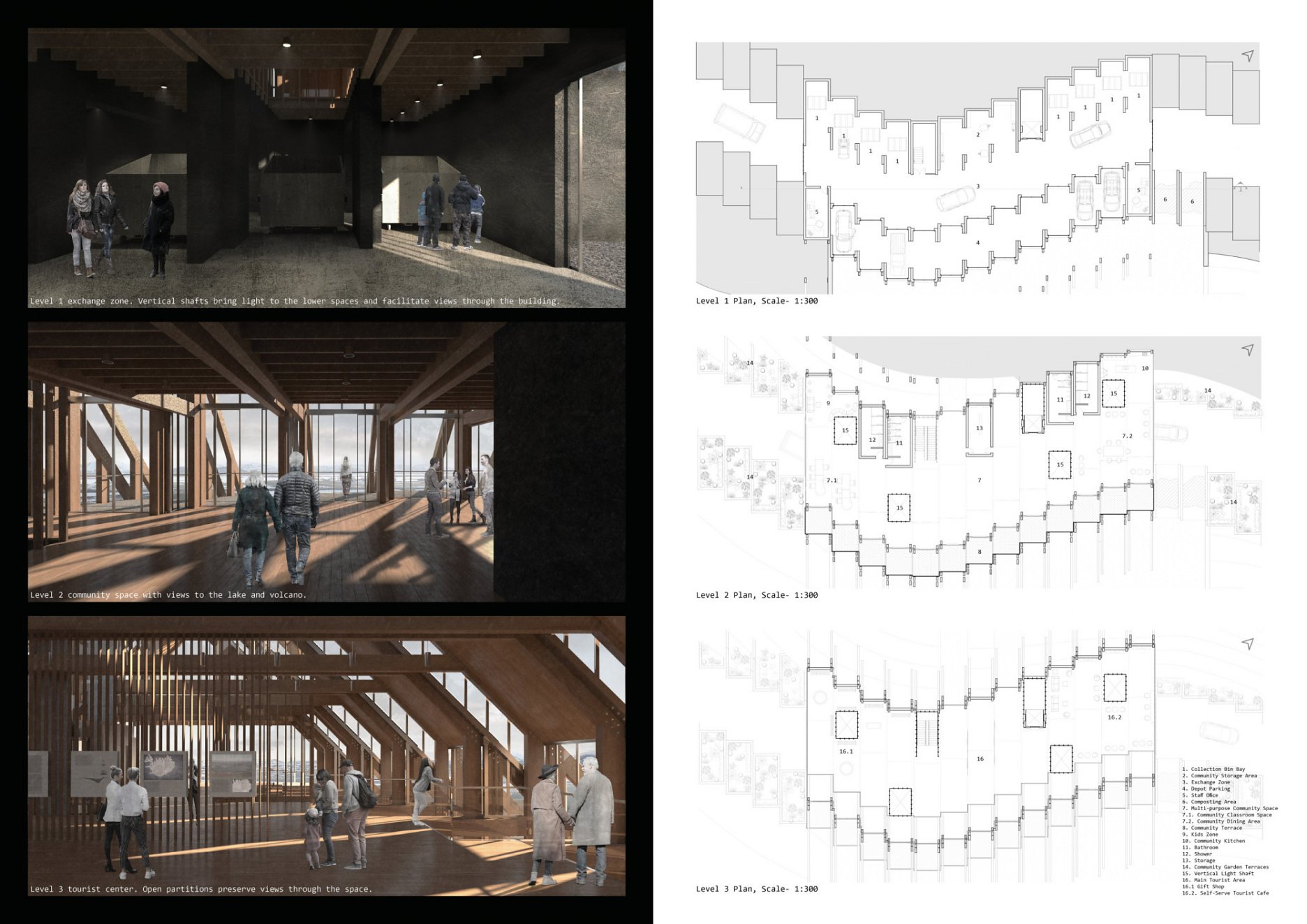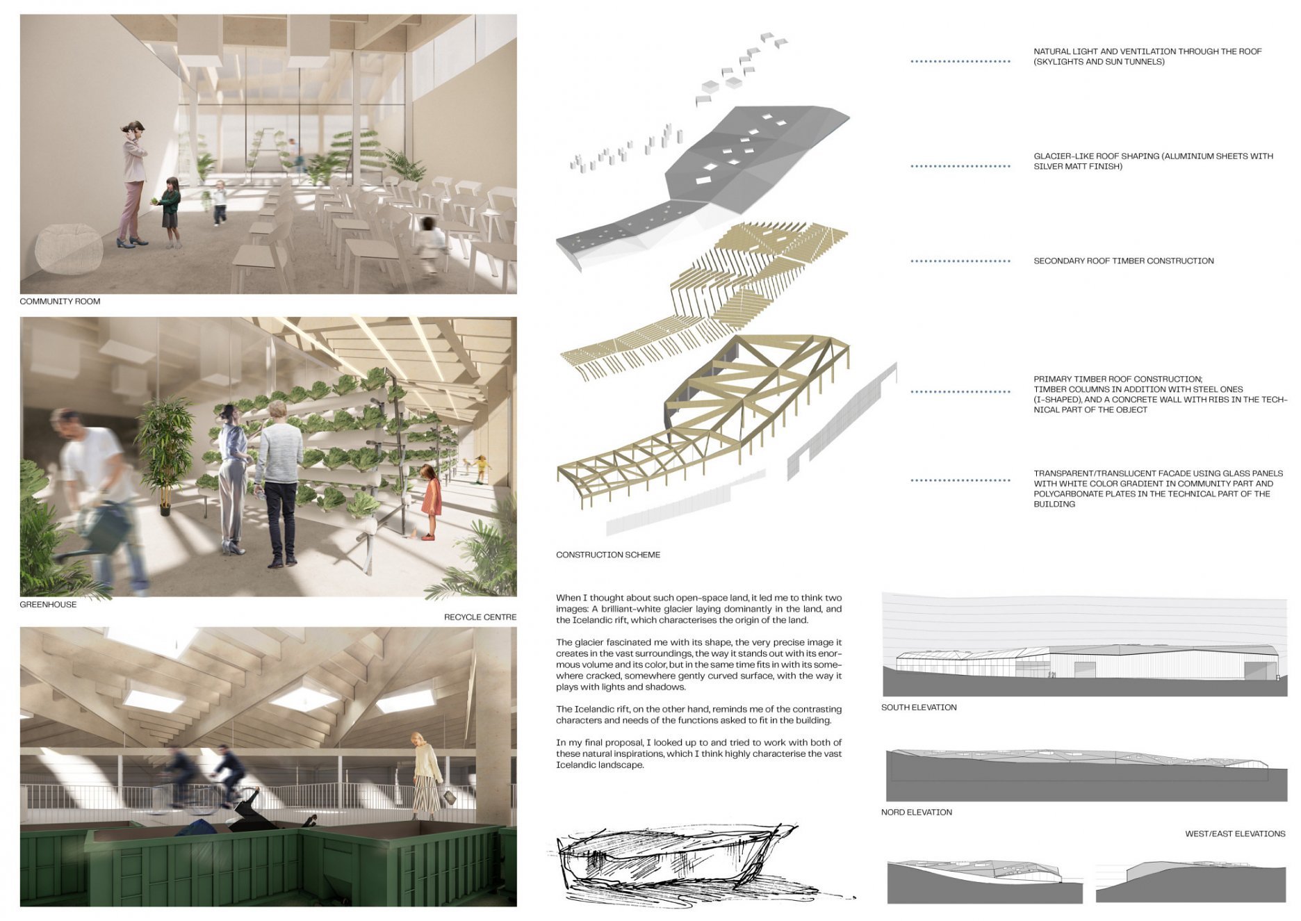 Eldgos - a term for ‘Eruption’ - proposes an A-frame structure, segmented corresponding to the contours of the site, with exchange and recycling spaces embedded within the earth and social spaces situated above ground. The jury writes: “A beautiful proposal, a rhythmic building. The images, explanations and drawings are convincing and inviting. The singular form of the building and its height are indicative of community use while the faceting of the form combines shelter, outlook and light wells.” The jury also stated that, while the proposal offers an interesting structure, its repetitiveness may also be read as overwhelming and potentially renders an inefficient layout in plan.
