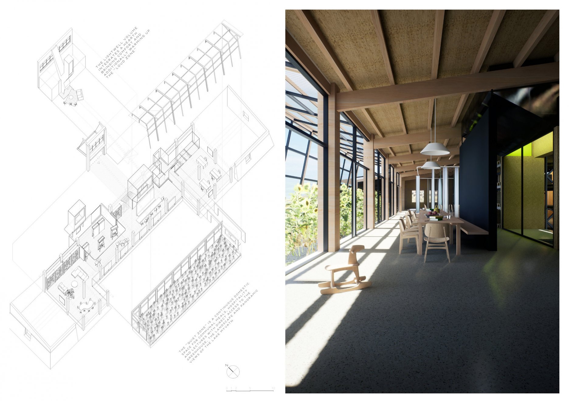 Ware / House proposes a solemn structure that allows for playful forms of inhabitation and inventive use. Volumes of contrasting materials are integrated with light wells that pierce the space and accentuate visual and functional connections. According to the jury: “This project stands out for its innovative use of the existing site structures, the only submission that maintained the existing structure while also producing high quality architecture. It checks all the boxes, suggesting an elaborate and well functioning spatial experience. A perfect combination of rigid logic and free, informal occupation. It produces a playful building with a peculiar and charismatic architectural expression.” The jury also commented on the submission’s excellent graphics, planning, and organization, and the clarity and consistency of the submitted four panels using a drawing on the left paired with an image on the right.