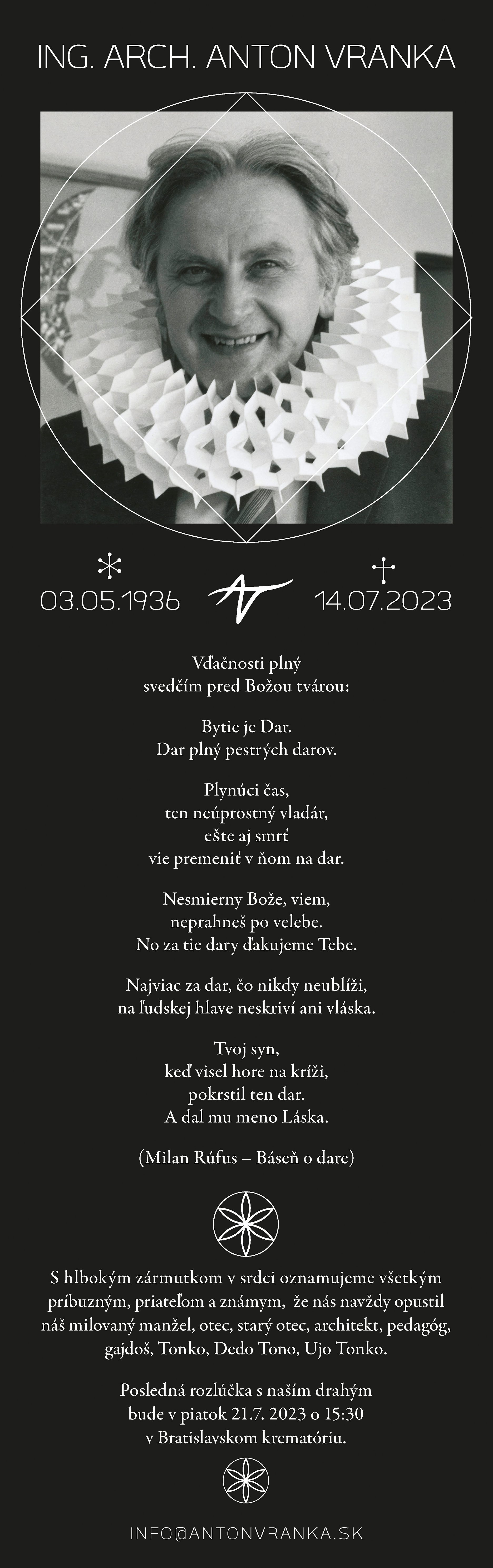 14. júla nás vo veku 87 rokov navždy opustil Anton Vranka, ktorého si niekoľko generácií študentov pamätá najmä ako pedagóga pôsobiaceho na bratislavskej fakulte architektúry. Okrem toho že bol priekopníkom disciplíny zvanej bionické modelovanie, aktívne sa venoval i praktickej architektonickej tvorbe, vedecko-výskumnej práci a samostatnej výtvarnej a medailérskej tvorbe. Mnohí ho poznajú aj ako gajdoša.