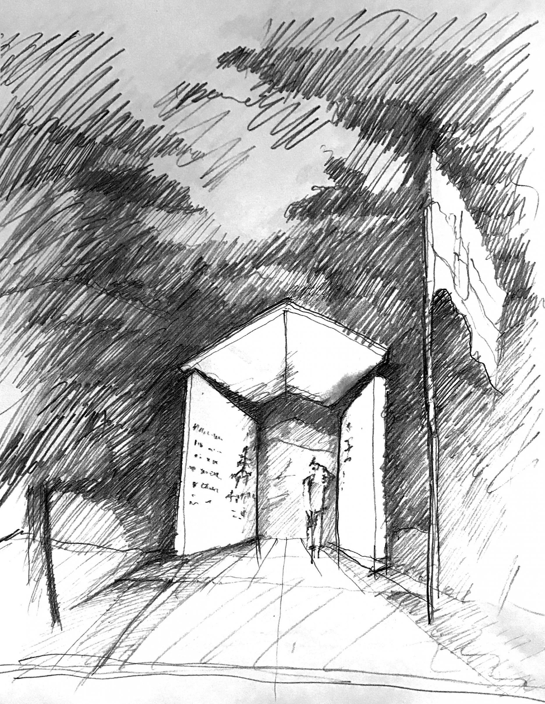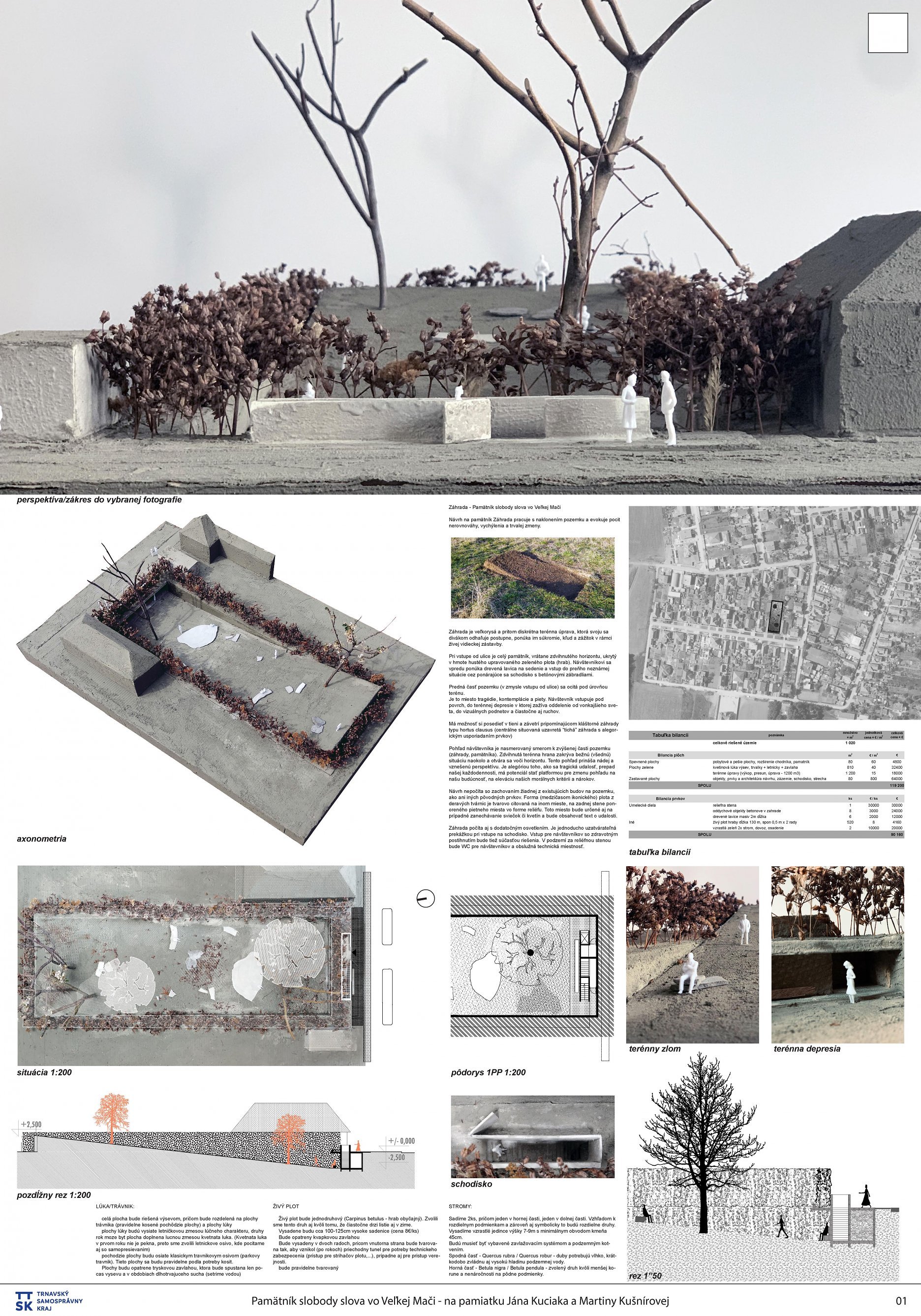 Hlavnú symboliku víťazného návrhu Benjamína Brádňanského, Víta Haladu a Martina Piačeka tvorí naklonenie, nerovnováha a vychýlenie. Autori vsadili na jednoduché a silné gesto, ktoré sa viaže k tragickej udalosti. Na jednej strane berie, ale na druhej pridáva. Zrozumiteľný jazyk práce s terénom vytvára niekoľko rovín priestorového prežitia. Z ulice takmer neviditeľný, len s náznakom nového horizontu na opačnej strane pozemku. Betónový objekt hlavného vstupu so zázemím vytvára v území obce veľmi citlivý zásah s minimálnou výškou do úrovne zábradlia so zelenou kulisou živého plota.