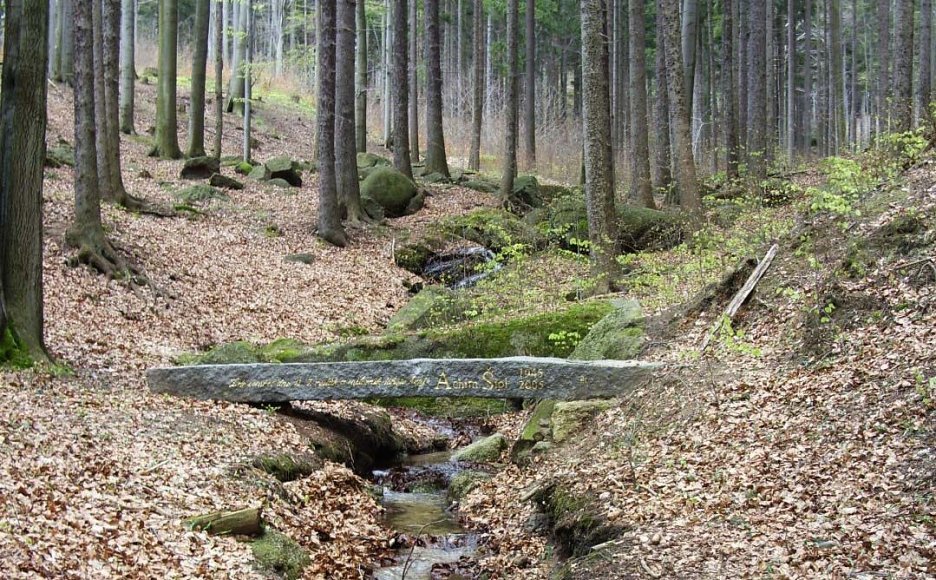 "V lese poblíž Bílého Potoka náhle zemřel Achim Šipl, rodák, horolezec, znalec a patriot Jizerských hor. Obrátil se na mě syn Achim Šipl, zda bych chtěl navrhnout přímo v místě jeho skonu pomníček, nejlépe nekonvenčním způsobem. Když jsem zjistil, že na místě samém teče malý potok v malebném údolí bukového lesa, napadlo mě vytvořit most. Je to praktická věc a zároveň věčná symbolika spojení dvou břehů, místo přechodu." - architekt Rudolf Hůlka