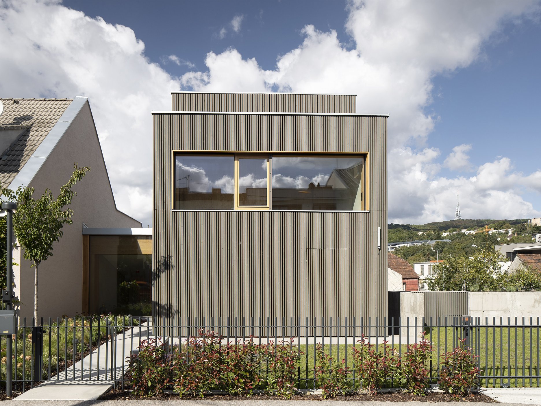 Dom v zložitej uličnej situácii s čistou fasádou a maximálnou redukciou materiálu. Minimum okenných otvorov ochraňuje súkromie a špecifický vnútorný svet obyvateľa domu.