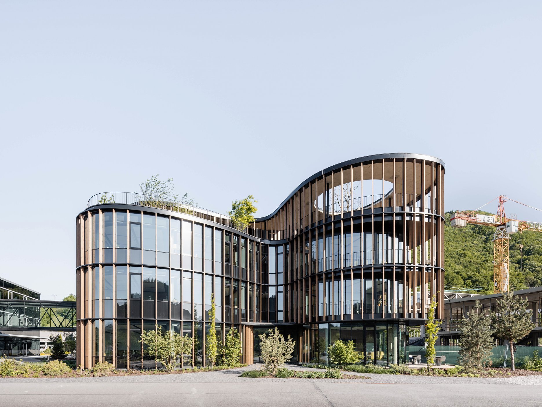 Pracovné prostredie napojené na výrobnú halu je zamerané na formálnu hru so svetlom, zvukom a krajinnými prvkami. Architektúra je jasne komponovaná na ľudskú dimenziu priestorového toku vnímania, ale zároveň napojená na širší kontext krajiny v rámci podpory ekonomického kontextu Oravy. Foto: Vlado Veverka, Juraj Laclavík, Ákos Takács