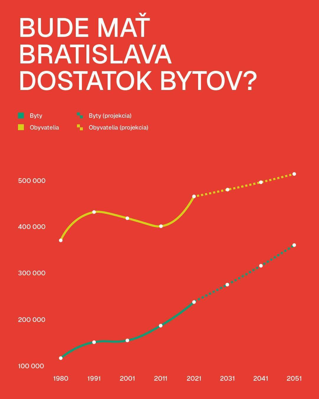 Odborníci MIB vyčíslili, že do roku 2050 budeme pod vplyvom tohto trendu potrebovať zhruba 123 tisíc bytov pre 50 tisíc obyvateľov, ktorí podľa prognózy pribudnú v najbližších desaťročiach. V ideálnom prípade by malo do roku 2030 v Bratislave ročne pribudnúť 3 725 bytov.