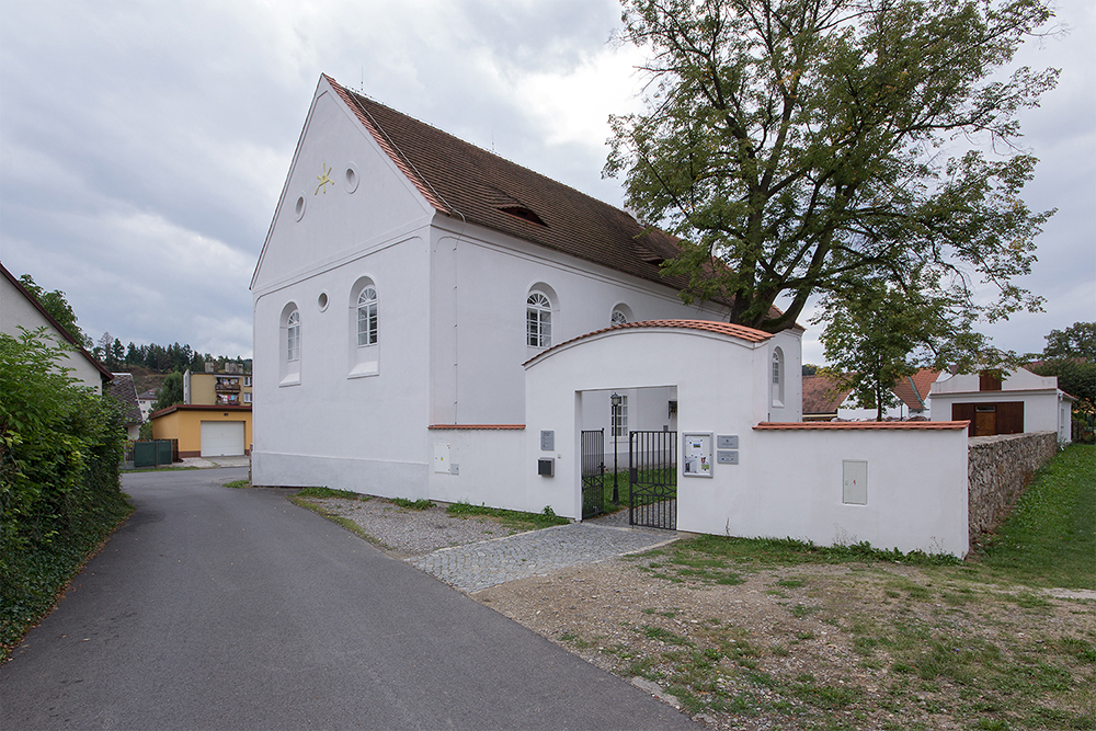 "V jihočeské Čkyni žila židovská komunita už v 16. století. Novou synagogu si postavila v roce 1828 v klasicistním stylu. Prostorný objekt integroval velkou modlitebnu, prostorově skromnější zimní modlitebnu, školu a byt. Poslední bohoslužby zde ale proběhly už před první světovou válkou a v roce 1922 byla celá sakrální stavba prodána a transformována k ryze světským účelům, když došlo k její přestavbě na truhlářskou dílnu a byt. Po desetiletích degradace založila v roce 1990 skupina iniciativních osobností Společnost pro obnovu synagogy. Ta se ve spolupráci s obcí Čkyně pustila do dlouhého a náročného procesu rehabilitace židovské památky. V roce 2011 mohla být zahájena rekonstrukce na základě finanční podpory z fondů Evropské unie. Kvalitě rehabilitace objektu bezpochyby napomohla architektonická soutěž uspořádaná ve spolupráci s Českou komorou architektů. Porota se jednoznačně rozhodla pro soutěžní návrh pražského studia H3T architekti. Naprostá absence fotografií či jiného dokumentačního materiálu, který by zachycoval někdejší interiérovou podobu synagogy, vytvářela prostor pro umělecké kreace i spekulace. Architekti z ateliéru H3T se ve své autorské koncepci volně inspirovali původním významem řeckého slova „synagógé“, což znamená shromáždění. Zdůrazněním shromažďovací funkce dokázali trefně propojit minulé i budoucí využití stavby. Vytčeného cíle dosáhli autoři použitím jednoduchých, až neutrálních interiérových prvků, jakými jsou výstavní skříně nebo modulární pódium velkého sálu anebo lavice a stůl pro čtení Tóry velmi lapidárních forem v zimní modlitebně. Prostřednictvím těchto citlivých intervencí vytvořili nenásilný a velmi působivý celek."