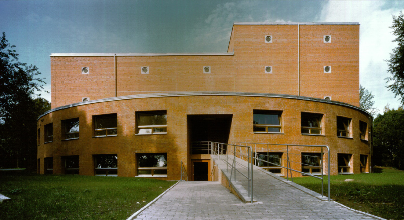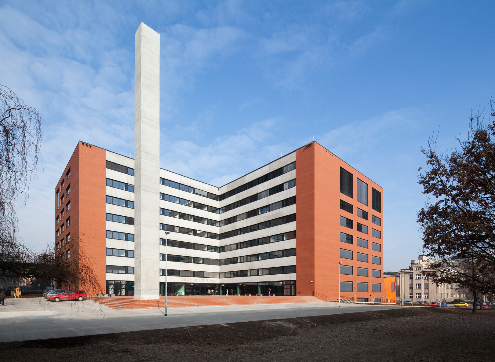 "Novou budovu FA ČVUT navrhla se svými spolupracovníky „první dáma české architektury“ Alena Šrámková. Charakteristickým rysem její architektury je zřetelný geometrický řád a velkorysé měřítko. Komplexní geometrie vytváří bohaté prostorové vazby v interiéru budovy. Dispozice je organizovaná kolem trojice atrií s ochozy, odkud jsou přístupné veškeré místnosti a ateliéry. Příčky, které je od ochozu oddělují, jsou až na výjimky částečně prosklené. Ochoz tak funguje ne jako běžná chodba, ale spíš jako interiérová ulice, odkud lze okny nahlížet do místností. Společný prostor školy připomíná veřejný prostor města a přispívá k pocitu sounáležitosti těch, kteří se v něm pohybují. V přízemí školy vzniká trojice atrií pro společenské akce a výstavy, nechybí ani kavárna, kopírovací centrum a prodejna knih. Čtvrtým prostorem pro společná setkání je venkovní vstupní piazzeta, která doplňuje půdorys budovy do pomyslného čtverce, jehož čtvrtý vrchol označuje symbolicky betonový obelisk. Budova má svůj vlastní řád, který není na úkor vztahu ke kontextu univerzitního kampusu a nemůže ho narušit ani zdánlivě nesourodá trojice zkosených barevných boxů poslucháren na severovýchodní straně. Domy Aleny Šrámkové jsou náročné, jejich forma je oproštěná od všeho, co není podstatné a opodstatněné: na někoho může taková redukce působit jako asketičnost, ale ve skutečnosti jde o to, nezatěžovat dům zbytečnostmi. Setkání s domem pak znamená konfrontaci s vlastním hodnotovým žebříčkem. Alena Šrámková byla přesvědčena o společenské, ba přímo pedagogické roli architektury: „Architektura je tu od toho, aby společnosti pomohla najít hodnoty."