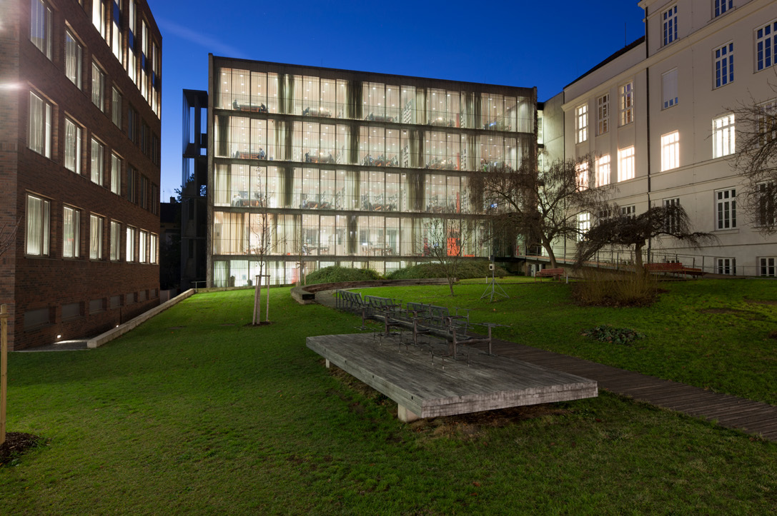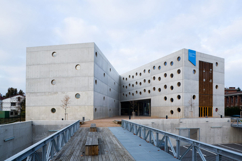 "Rozhraní pevné urbanistické struktury historického města a rozvolněné zástavby, na pěší trase mezi centrem a areály vysokých škol. Naproti architektonicky cenné stavbě koželužské školy od Josefa Gočára. Do tohoto komplikovaného místa situovali architekti budovu na půdorysu písmene X, která tvoří výraznou lokální dominantu, uzlový bod, ale zároveň umožňuje na úrovni parteru volný průchod. Volně prostupné je i sousední parkoviště, které je umístěné pod úrovní terénu a vedou přes něj pohodlné lávky. Díky svému hmotovému uspořádání knihovna také trochu klame tělem ‒ působí jako menší, než ve skutečnosti je. Tomu pomáhá i zjemnění a odlehčení pohledového betonu kulatými okny a mnoha dřevěnými prvky v exteriéru i interiéru ‒ od okenních rámů přes žaluzie, madla či mobiliář. Půdorys je zároveň velmi praktický pro fungování celé knihovny: Jeden střed s velkorysým schodištěm, z něhož se paprskovitě rozbíhají čtyři dobře přístupná křídla, která jsou jen tak široká, aby se všude, kam je potřeba, dostalo denní světlo. V knihovních sálech se studijními místy je světlu věnovaná velká péče, ať už přichází kruhovými okny, prosklenými stěnami či střešními světlíky. Přehledná dispozice umožňuje klid pro studium a zároveň mnoho příležitostí k více či méně náhodným setkáním. Základní schéma a konstrukce zároveň nabízí velkou variabilitu co do výšky stropů, množství přirozeného světla či otevřenosti ‒ krom knihovních sálů jsou tu i kanceláře, sklady, archivy nebo přednáškový sál, pokaždé s jinými požadavky. Vnitřní provoz se velmi decentně, pro pozorné oko však čitelně propisuje i navenek ‒ zdánlivá nahodilost umístění kulatých oken má svůj systém. V prostorech se studijními stoly je jiný rytmus i velkost otvorů než v kancelářích, v archivu pak rastr řídne na polovinu. Pevnost, racionalita a přehlednost, ale i rozmanitost, přívětivost a hravost v architektonicky sjednoceném celku."
