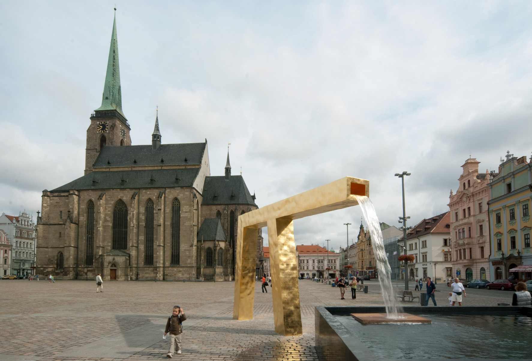"Kašny na náměstí Republiky, v srdci Plzně, největšího západočeského města, jsou důležitým příspěvkem k problematice vstupu ryze soudobého díla do historického prostředí. Náměstí má obdélníkový půdorys o rozměrech 139 × 193 metrů a jeho utěšený vzhled podpořila gotika (v jejím stylu byl na sklonku třináctého století vystavěn kostel svatého Bartoloměje), renesance (budova radnice), baroko (morový sloup se sochou madony) i architektura devatenáctého a dvacátého století. Soutěž na obnovu kašen proběhla v letech 2004 až 2005 a zúčastnilo se jí dvaačtyřicet architektů. Porota vybrala návrh Ondřeje Císlera, který kašny pojal jako figurativní umělecká díla nově rozvíjející prostor. Působí sice abstraktně, ale mají reálný základ. Jejich podoba vychází z heraldického znaku Plzně: jedna představuje chrtici (symbol věrnosti), druhá velblouda (připomínka neúspěšného pokusu husitů, kteří velblouda získali darem od Vladislava II. Jagellonského, podmanit si katolické město; když si Plzeňané odvedli jejich zvíře do města, husité zanechali obléhání a odtáhli pryč) a třetí anděla (symbol ochrany). Tři prvky, trojice až na samou podstatu zjednodušených motivů. Kašny se skládají ze dvou základních částí. Z chrliče, jehož výška se pohybuje kolem čtyř metrů, a z mísy, do níž padá voda. Zatímco chrliče jsou ze zlaceného bronzu, mísy byly vysekány v Číně z tamní černé žuly, protože nikde jinde se nedaly podobně velké bloky kamene vylomit. Po převozu do Plzně byly ještě opatřeny mikroskopickou vrstvu skla odpuzující vodu a chránící žulu před agresivním biologickým materiálem i ultrafialovým zářením. Pod kašnami jsou jednak výkonná čerpadla, která neustále ženou vodu do uzavřeného koloběhu, jednak akumulační nádrž s hustou nerezovou sítí sloužící k zachycení nečistot. Na konce chrličů byly vsazeny „píšťaly“, které dávají proudu vody podobu pevné a široké stuhy. Zprvu byly kašny plzeňskou veřejností přijaty s rozpaky, jak už to v případě ryze soudobé umělecké a architektonické tvorby bývá, ale s postupem času byly vzaty na milost a po více než deseti letech jsou považovány za ozdoby města."